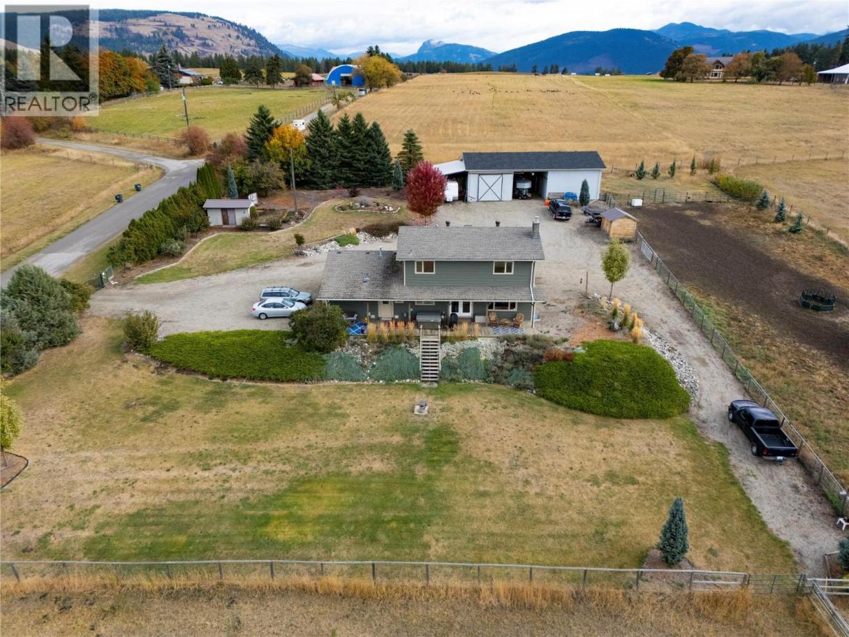 Exceptional 4.3 acre estate offering privacy, valley views, & a fully equipped horse setup! This beautiful 4 bed, 4 bath home with an attached double garage is located on a quiet no-thru road. Well-designed, it offers ample parking and plenty of space to easily turn your trailer around. It's fully fenced with horse-safe wire, a remote wrought iron security gate & blue spruce-lined perimeter. Versatile multipurpose building offers equipment/RV storage, insulated shop/barn with cement floors, has 240 V, & barn has 3 rubber-matted stalls, water hydrant & hayloft. Two horse shelters & 2 sheds. Inside features include, a bright updated kitchen with quartz countertops & stainless steel appliances, formal living/dining rooms plus a cozy family room with gas fireplace. Upstairs offers a spacious primary bedroom with a walk-in closet & 4-pce ensuite, two additional bedrooms (both with walk-in closets) & 4-pce main bath. Fully self-contained 1 bed/1 bath basement suite is currently operating as an Airbnb & offers excellent income or mortgage helper potential. Enjoy your morning coffee on the east-facing porch, listening to the birds singing, surrounded by flowering trees & garden beds. Raised garden for avid gardeners. West-facing partially covered deck with natural gas BBQ hookup, 240 V for hot tub, perfect for enjoying stunning valley views & sunsets. This peaceful, scenic property is truly move-in ready. Don't miss out on this fantastic Coldstream property, book your showing today! (id:6769)