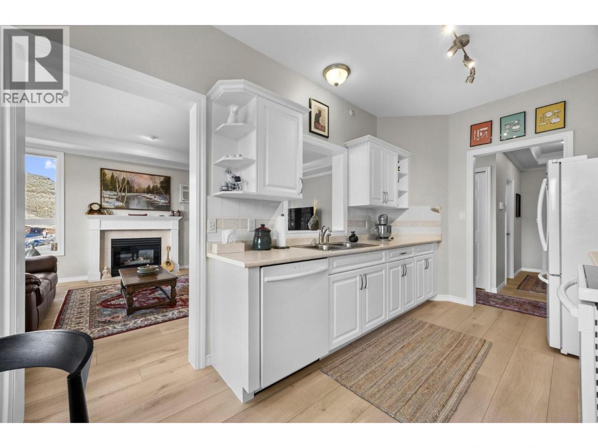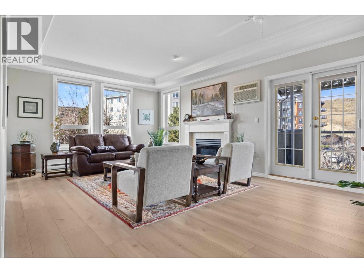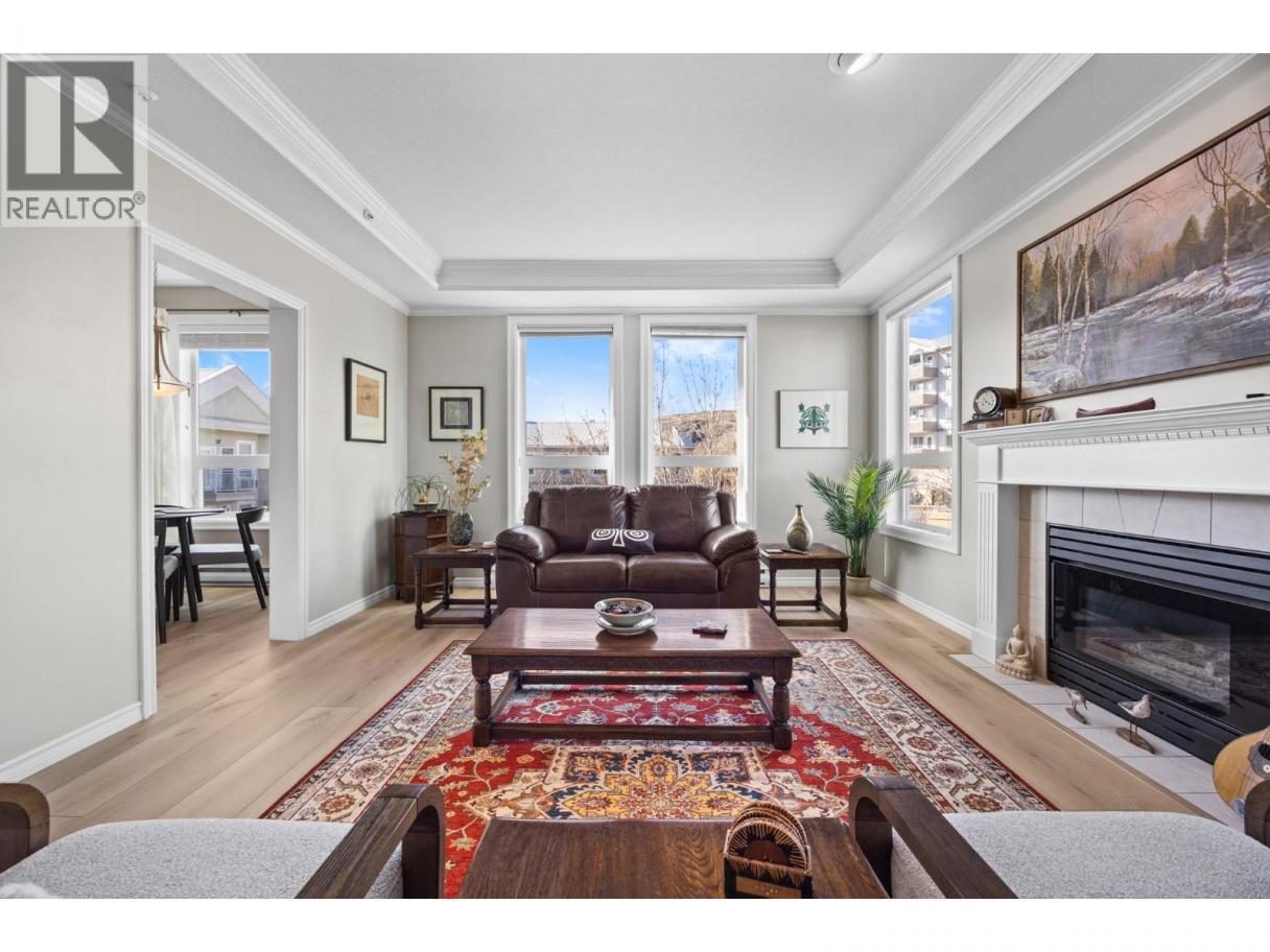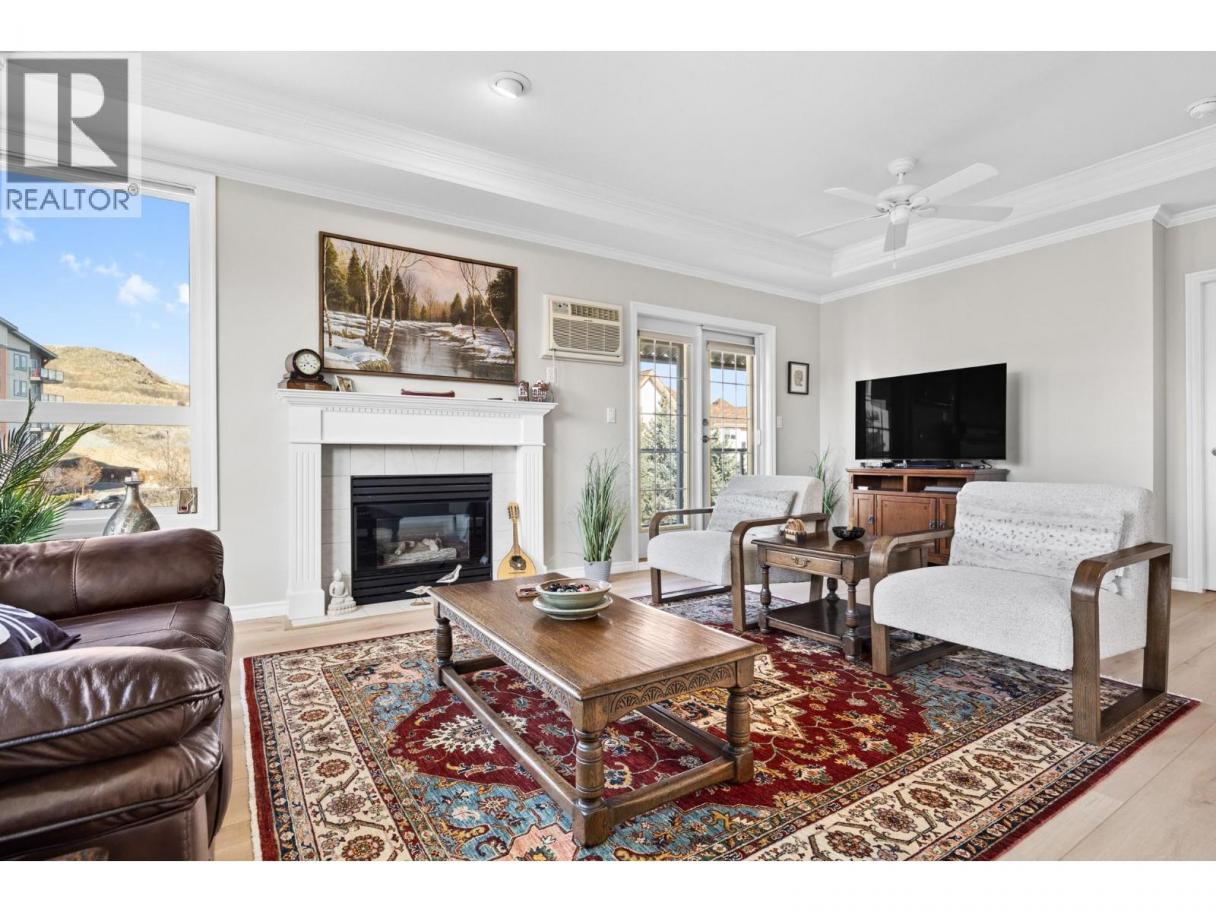 Welcome to this beautifully appointed, 2-bed, 2-bath home in the highly desirable 55+ community of Regency Court. Recently renovated and meticulously maintained, this immaculate condo features brand-new flooring throughout, 9 ft ceilings, elegant crown moulding in the living room, and a stylishly updated kitchen complete with sparkling white Samsung appliances. The functional floor plan offers excellent privacy with bedrooms on opposite sides of the unit. Located on the 4th-floor corner, this home boasts a private balcony and floor-to-ceiling windows that fill the space with natural light. The inviting living room includes a cozy natural gas fireplace, perfect for relaxing evenings. The spacious primary bedroom features his-and-hers walk-through closets leading to a 4-piece ensuite. Residents of Regency Court enjoy exceptional amenities, including a large common room with a full kitchen, tables, chairs, and a BBQ area for gatherings, a pool table room, an exercise room, a community library, secured underground parking, and a storage locker. Ideally situated next to downtown Vernon, you’re within walking distance to FreshCo, Shoppers Drug Mart, Nature’s Fare, parks, transit, and essential services. Nothing to do but move in and enjoy! (id:6769)