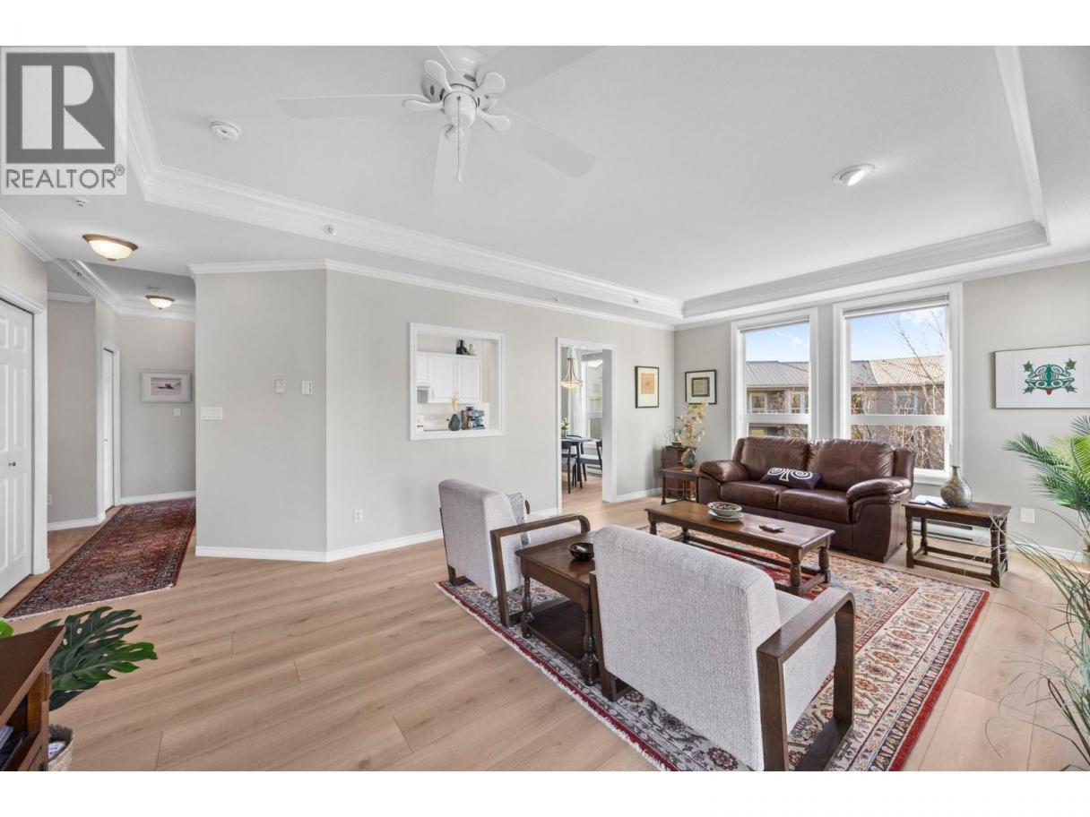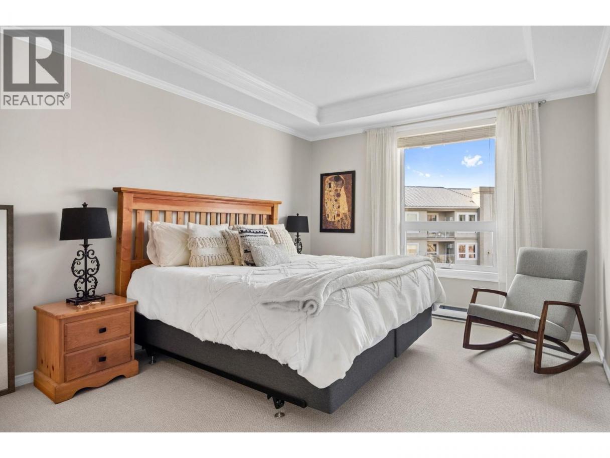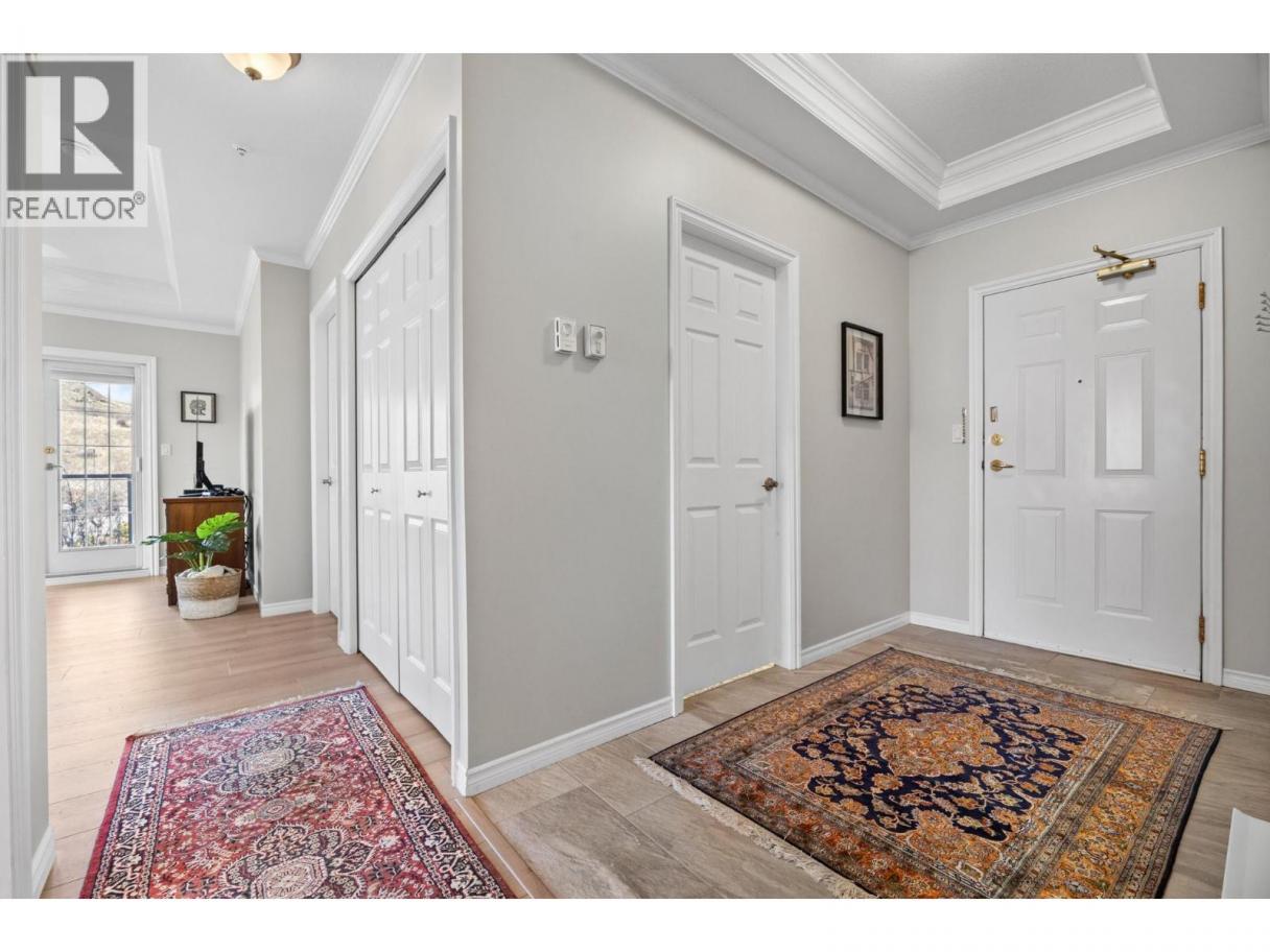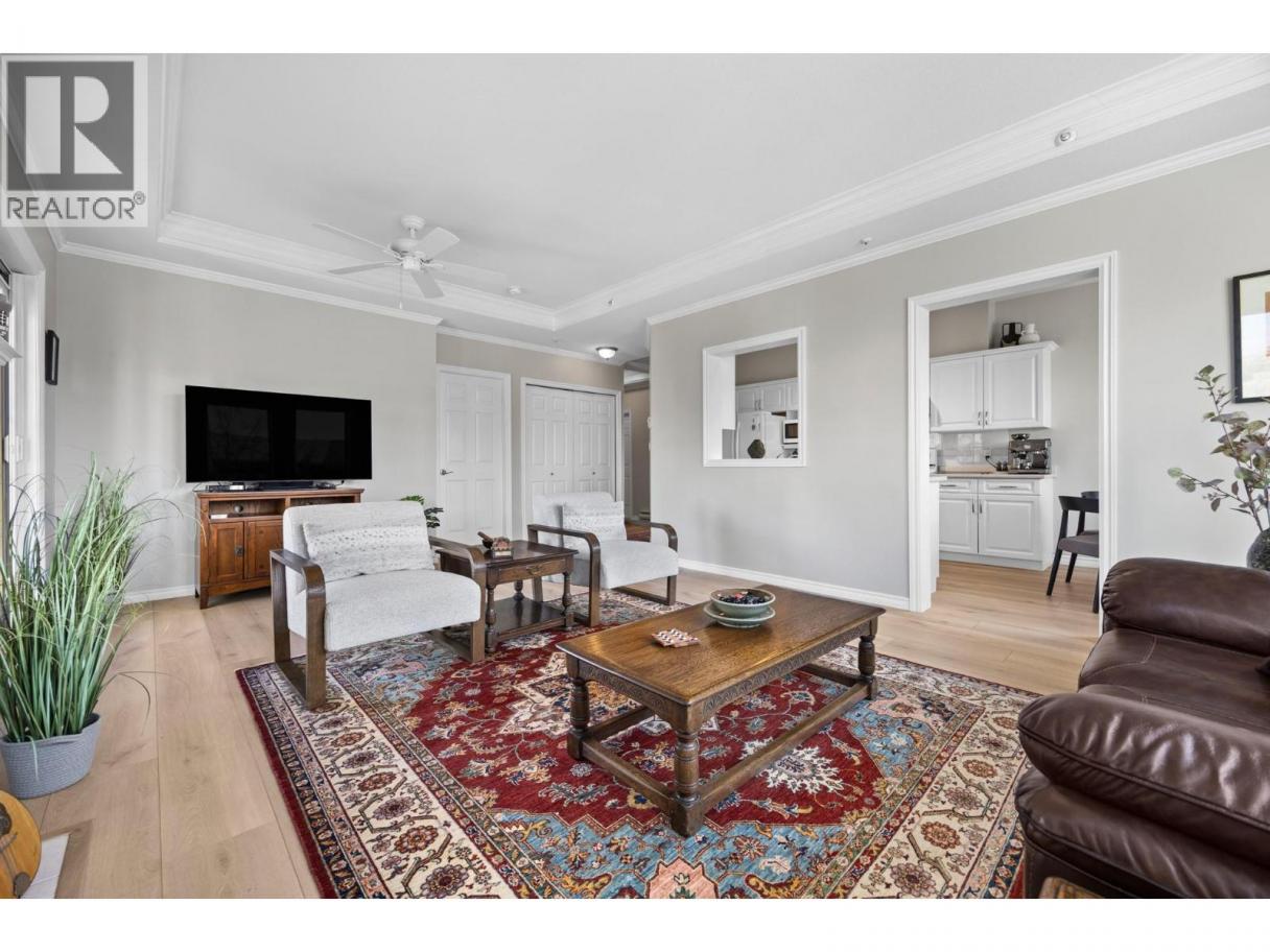 Welcome to this beautifully appointed, 2-bed, 2-bath home in the highly desirable 55+ community of Regency Court. Recently renovated and meticulously maintained, this immaculate condo features brand-new flooring throughout, 9 ft ceilings, elegant crown moulding in the living room, and a stylishly updated kitchen complete with sparkling white Samsung appliances. The functional floor plan offers excellent privacy with bedrooms on opposite sides of the unit. Located on the 4th-floor corner, this home boasts a private balcony and floor-to-ceiling windows that fill the space with natural light. The inviting living room includes a cozy natural gas fireplace, perfect for relaxing evenings. The spacious primary bedroom features his-and-hers walk-through closets leading to a 4-piece ensuite. Residents of Regency Court enjoy exceptional amenities, including a large common room with a full kitchen, tables, chairs, and a BBQ area for gatherings, a pool table room, an exercise room, a community library, secured underground parking, and a storage locker. Ideally situated next to downtown Vernon, you’re within walking distance to FreshCo, Shoppers Drug Mart, Nature’s Fare, parks, transit, and essential services. Nothing to do but move in and enjoy! (id:6769)