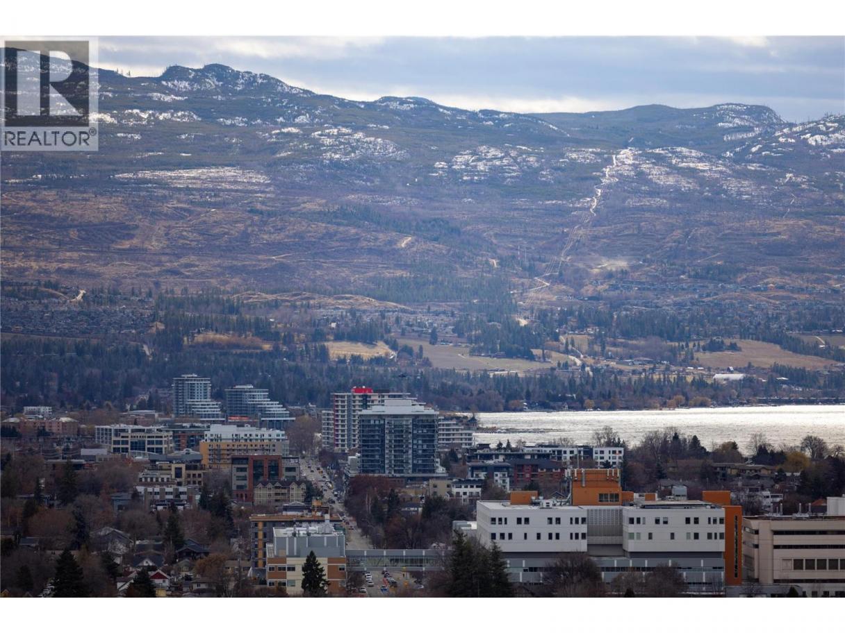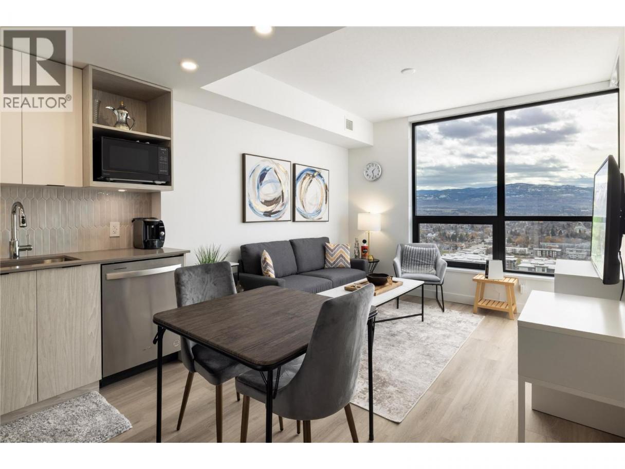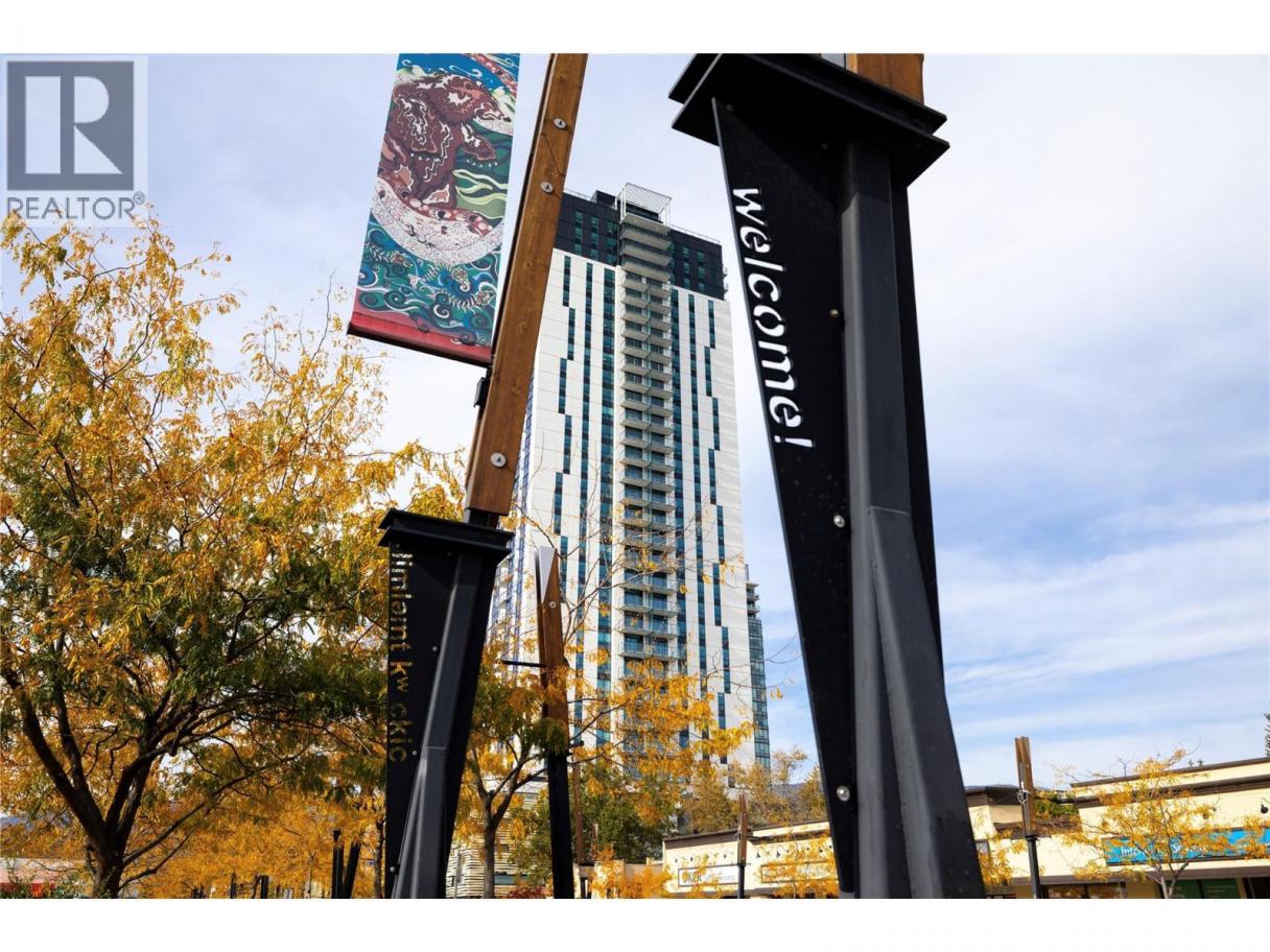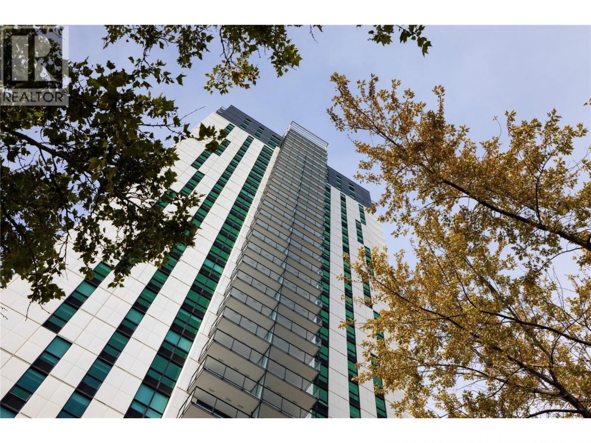 Experience elevated urban living from the 25th floor of The Bertram in downtown Kelowna. This one-bedroom plus den residence offers a bright, open-concept layout with large windows, built-in roller blinds, and a glass-railed balcony. Enjoy south and southwest views of Okanagan Lake, the mountains and the city. The kitchen features a tile backsplash, stainless steel appliances, and a dedicated coffee station with floor-to-ceiling storage and an outlet for your favourite brewer. The versatile floor plan includes a den for a home office, dual bathroom access from the hallway and primary bedroom, and in-unit laundry. This unit comes with one parking space and a flexible pet policy allowing up to two pets with no size or height restrictions. Beyond the suite, The Bertram provides a comprehensive lifestyle through its diverse building amenities. Relax at the rooftop pool and hot tub or stay active in the modern fitness center. For those working from home, the building features dedicated co-working spaces on both the top and ground levels. Outdoor enthusiasts will appreciate the 6,000-square-foot sixth-floor podium, which includes a dog run, community gardens, and space for BBQing and bocce. Situated in a prime downtown location, this concrete tower is surrounded by local dining, retail, and transit. With quick possession possible, you can move into this amenity-rich community immediately. GST paid. Furnishings are not included but are available for separate purchase. (id:6769)