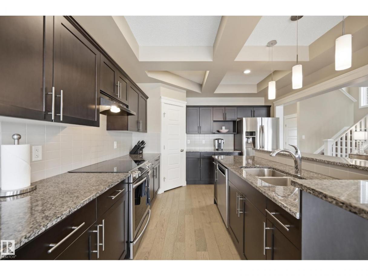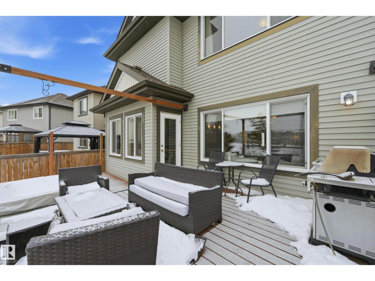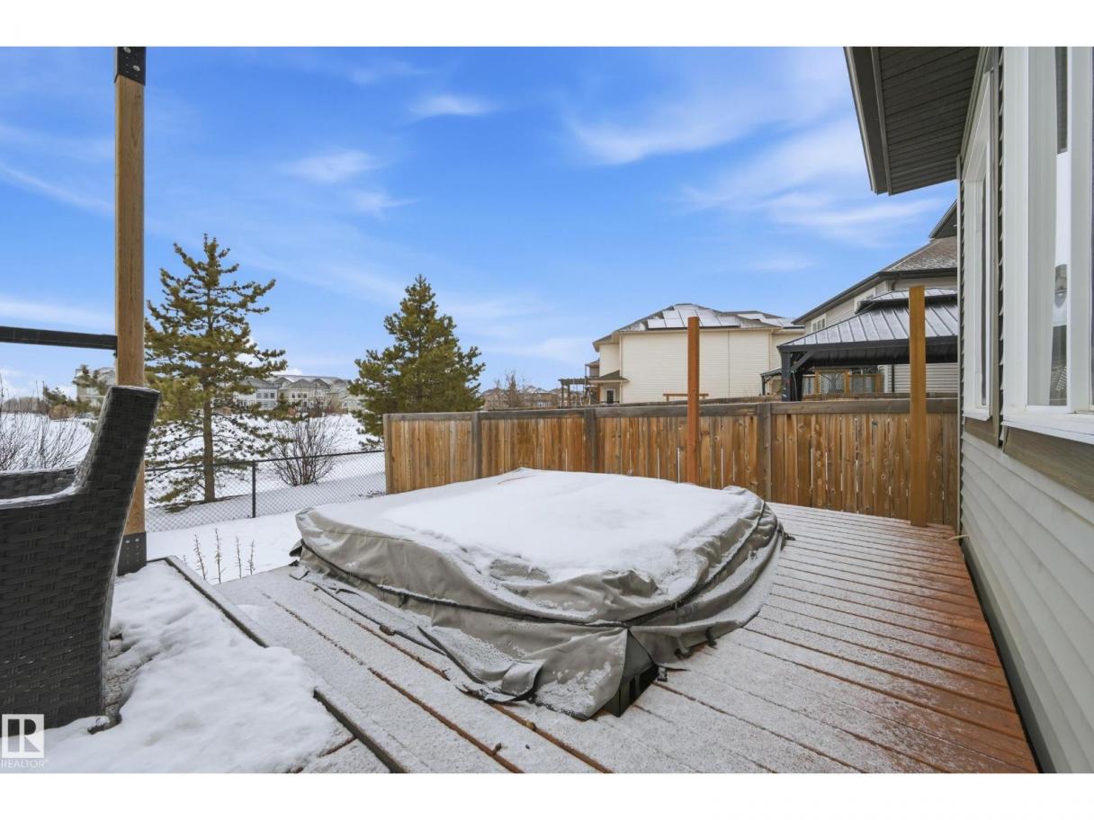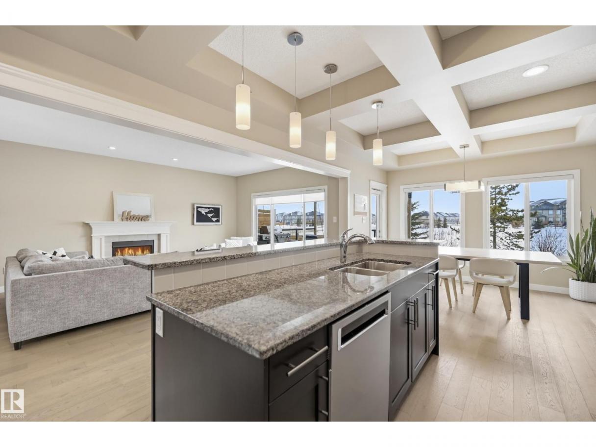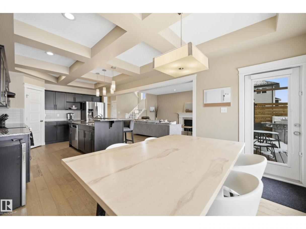 POND-BACKING 2,350 SQ FT HOME IN DESIRABLE DANSEREAU MEADOWS, BEAUMONT. This beautiful Pacesetter-built home offers a well-designed layout with a double attached garage. The main floor features engineered hardwood throughout, a bright open dining area with large windows—ideal as a formal dining space or home office/den, and convenient main floor laundry. The kitchen includes granite countertops, a pantry, and an elegant coffered ceiling, flowing into the eating area at the back of the home. Relax in the inviting living room with a cozy gas fireplace. Upstairs, enjoy a spacious bonus room with vaulted ceilings, a wide hallway, and a huge primary retreat with French doors, walk-in closet, and spa-like 5-piece ensuite featuring a soaker tub, stand-up shower, dual sinks, and built-in storage. Two additional generous bedrooms and a 4-piece bath complete the upper level. Step outside to a large backyard backing the pond, complete with a glass-railed deck for enjoying the view. (id:6769)