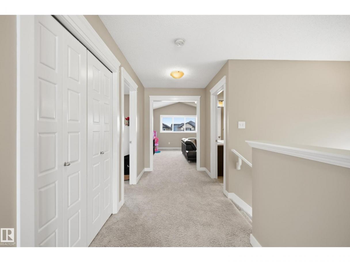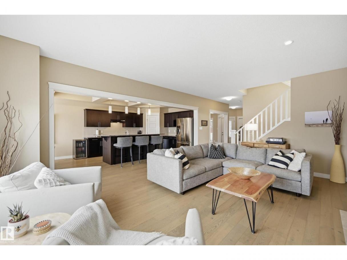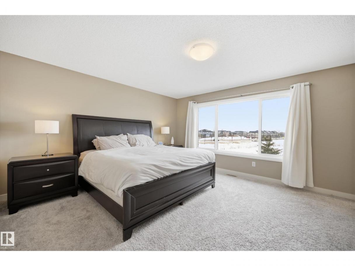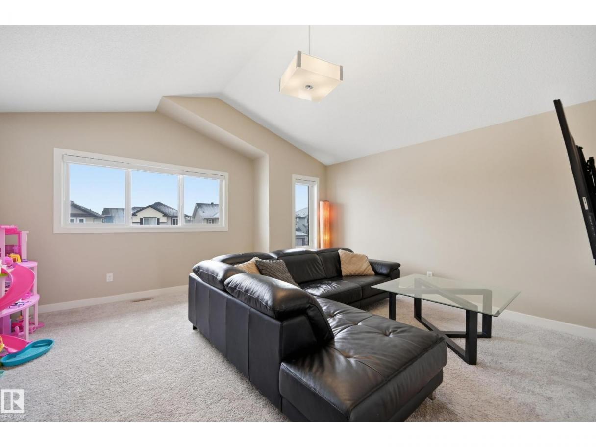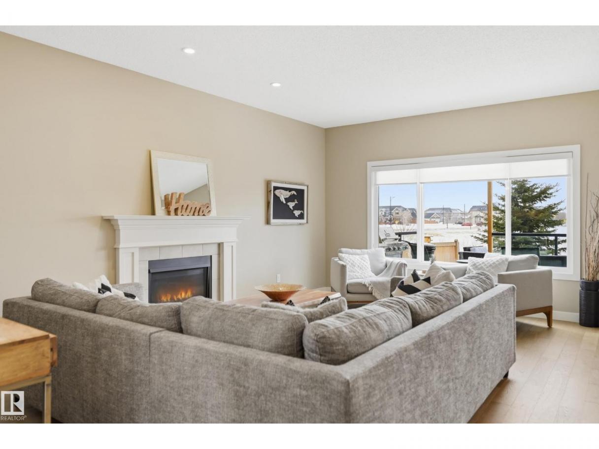 POND-BACKING 2,350 SQ FT HOME IN DESIRABLE DANSEREAU MEADOWS, BEAUMONT. This beautiful Pacesetter-built home offers a well-designed layout with a double attached garage. The main floor features engineered hardwood throughout, a bright open dining area with large windows—ideal as a formal dining space or home office/den, and convenient main floor laundry. The kitchen includes granite countertops, a pantry, and an elegant coffered ceiling, flowing into the eating area at the back of the home. Relax in the inviting living room with a cozy gas fireplace. Upstairs, enjoy a spacious bonus room with vaulted ceilings, a wide hallway, and a huge primary retreat with French doors, walk-in closet, and spa-like 5-piece ensuite featuring a soaker tub, stand-up shower, dual sinks, and built-in storage. Two additional generous bedrooms and a 4-piece bath complete the upper level. Step outside to a large backyard backing the pond, complete with a glass-railed deck for enjoying the view. (id:6769)