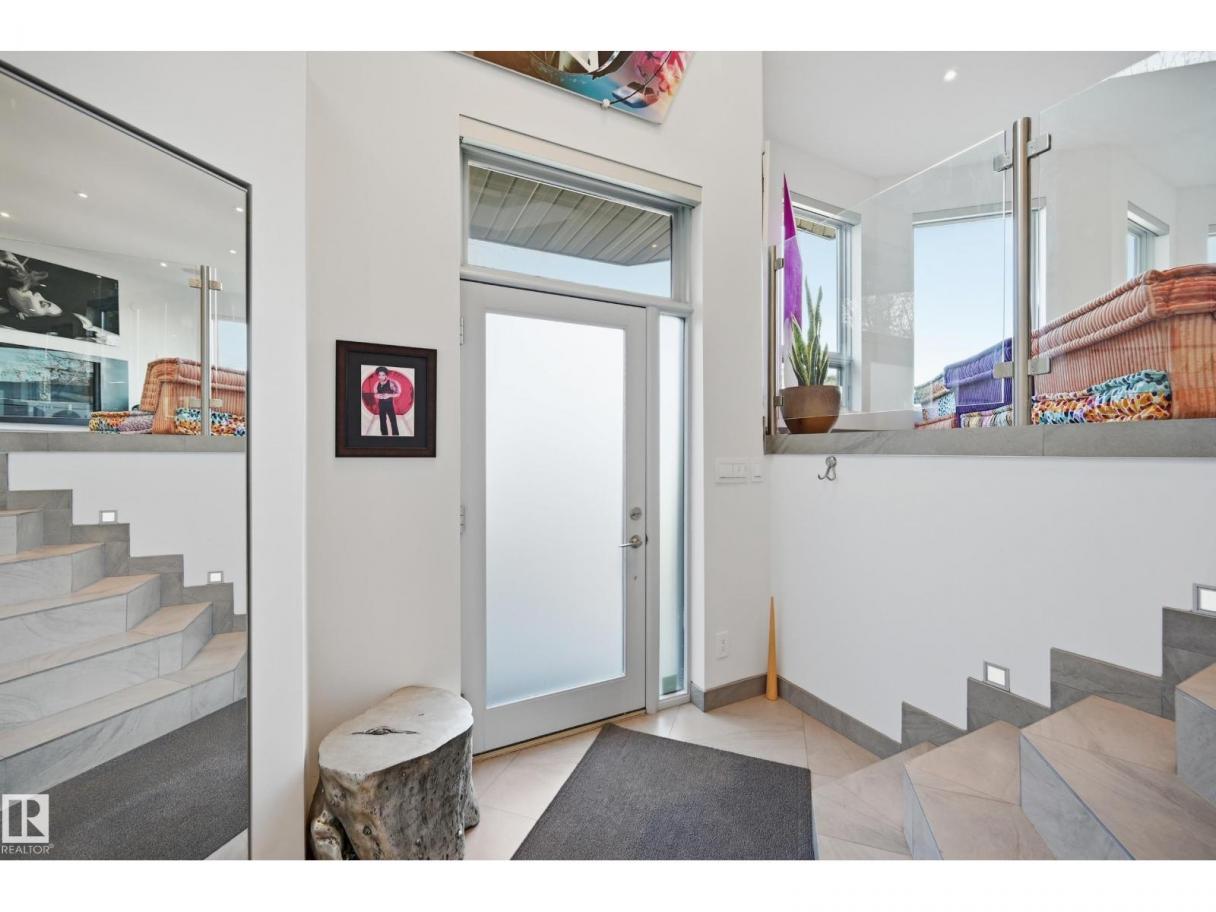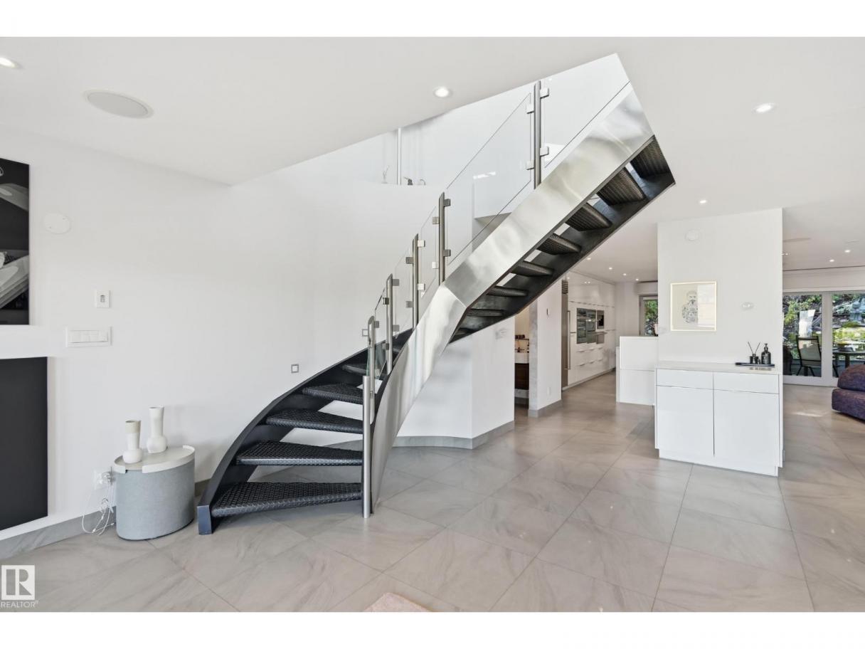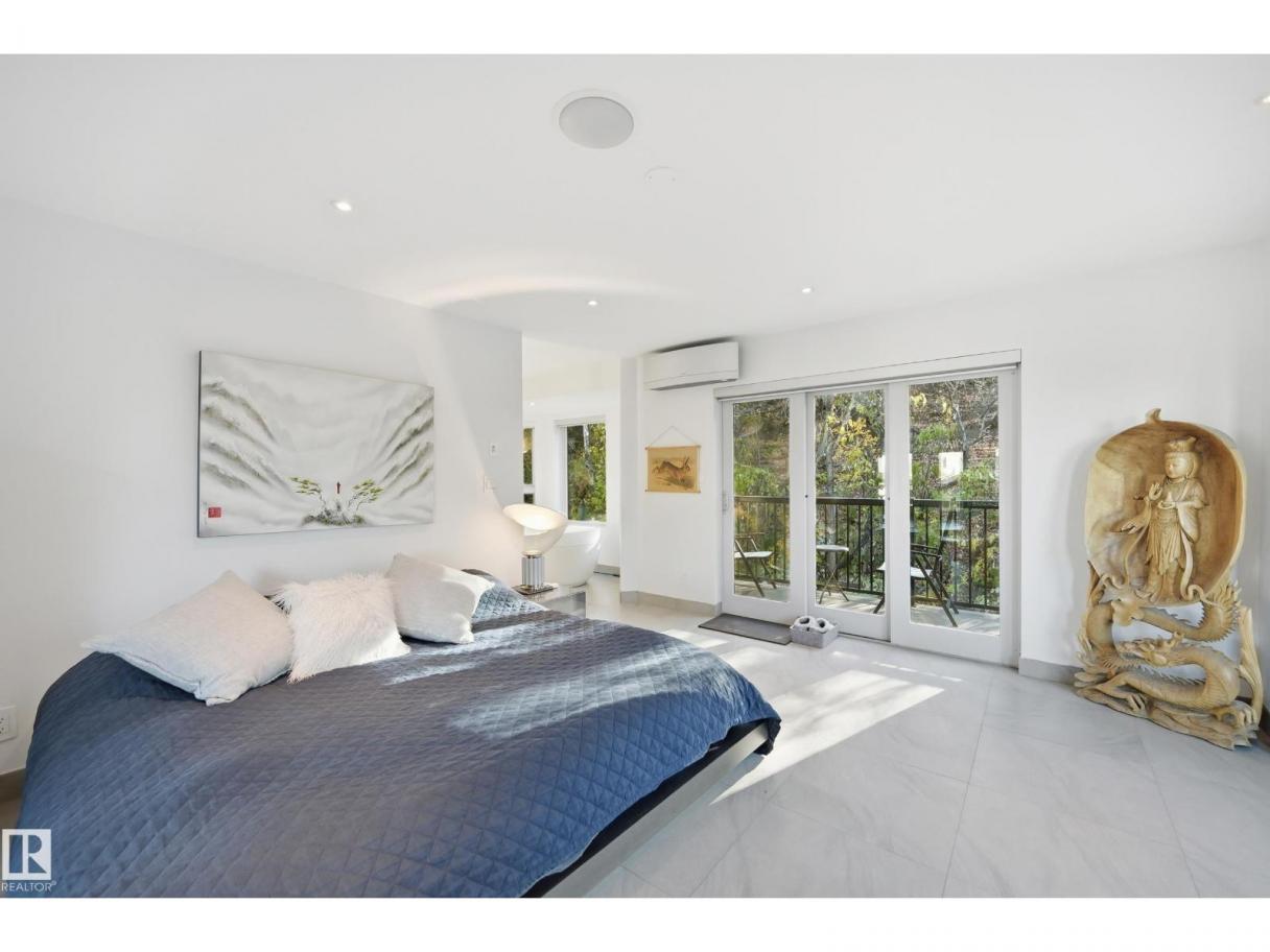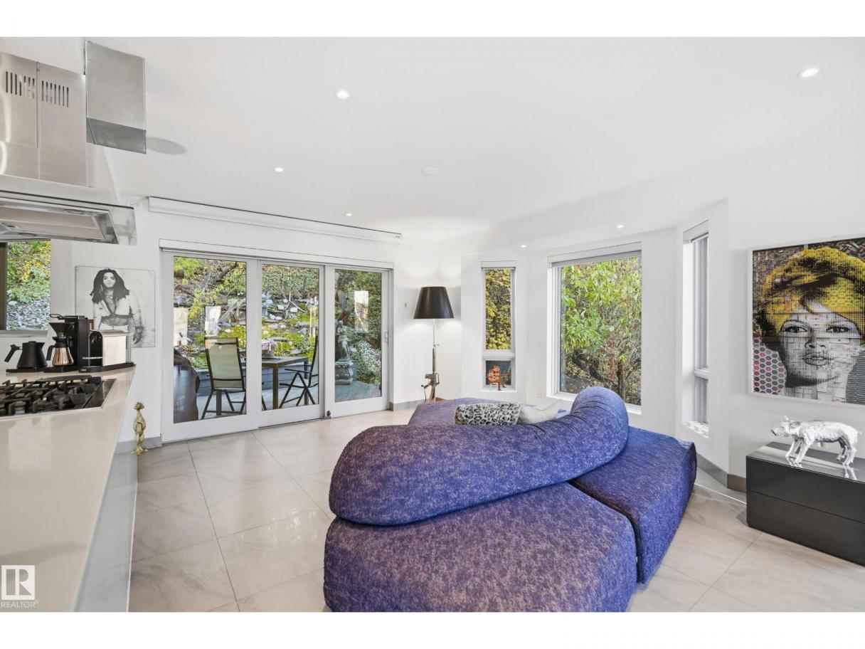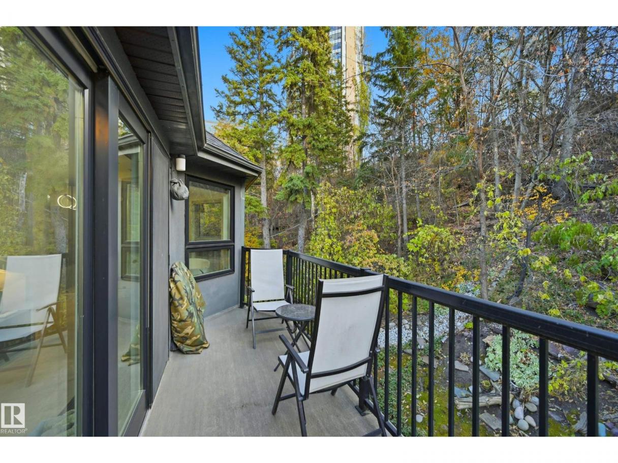 ARCHITECTURAL GEM IN EDMONTON’S RIVER VALLEY! Tucked into the quiet enclave of Skunk Hollow, this modern home blends thoughtful design with rare privacy. Rebuilt from the frame up in 2007, it offers clean lines, warm natural light, and a calm connection to its ravine setting. Large windows frame views of the trees by day and city lights by night. The open main floor features two inviting living areas and a chef’s kitchen with Sub-Zero and Miele appliances, perfect for cooking or entertaining. Upstairs, the owner’s retreat includes a private office, flex space, spa-inspired ensuite, and expansive walk-in closet with access to a peaceful patio. The reverse walkout lower level offers a heated epoxy garage, full bath, and guest/flex room (no window), with in-floor heating throughout. Opportunity exists to add additional bedrooms. NOTE: 3D renderings illustrate potential future layouts. Garage photo virtually staged. (id:6769)