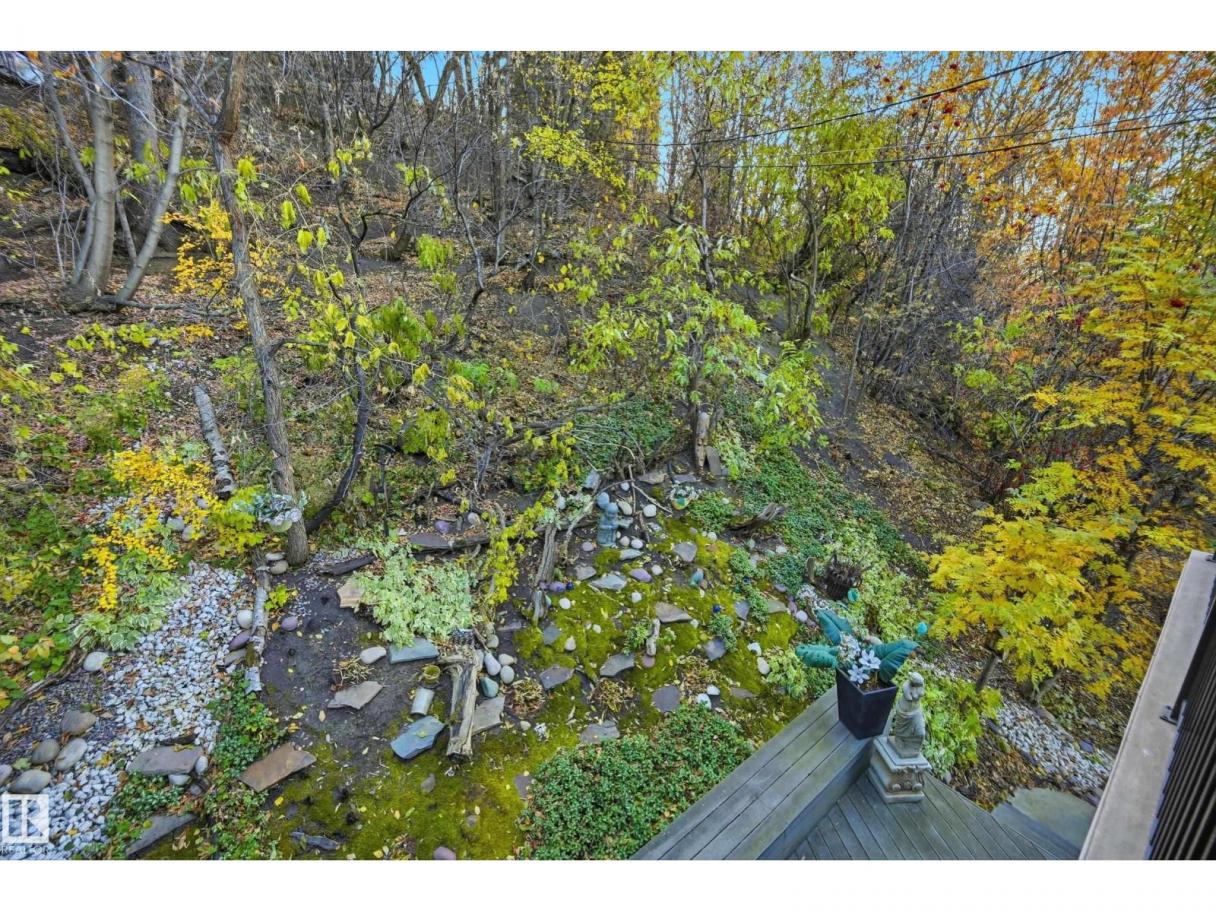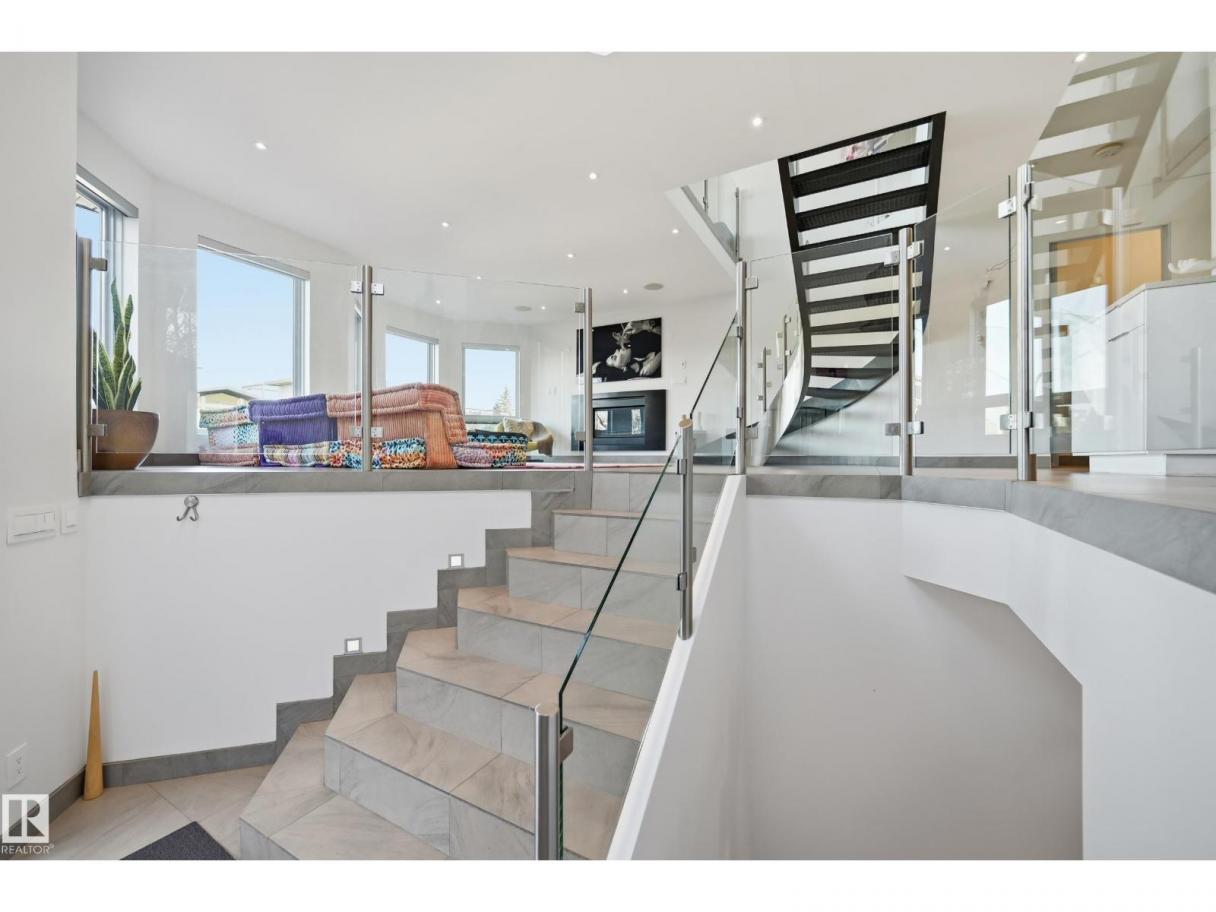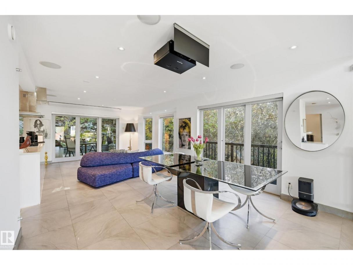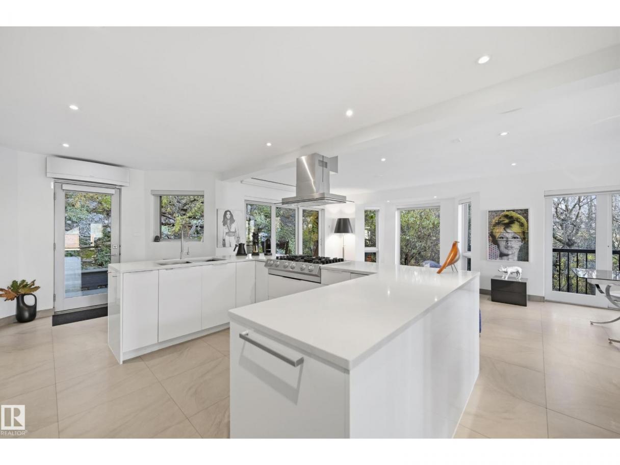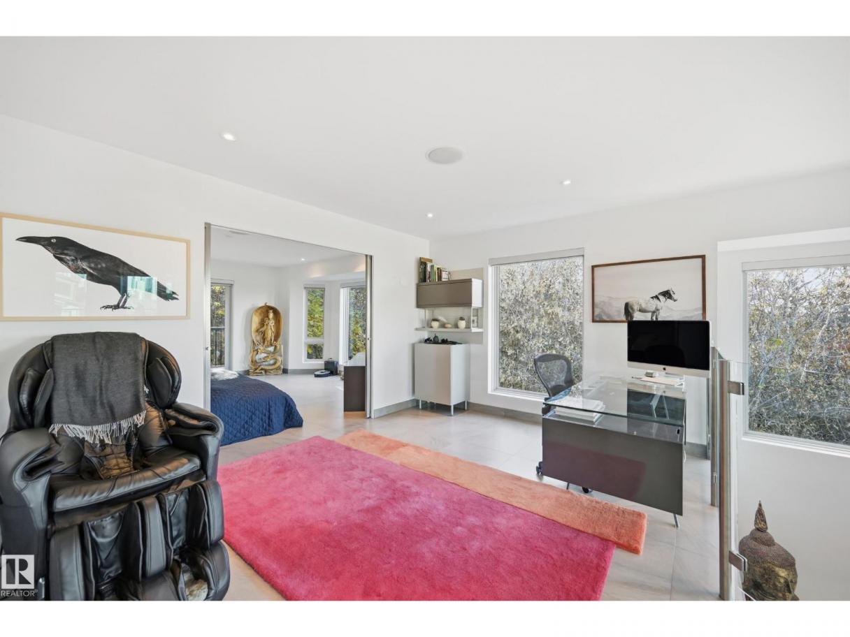 ARCHITECTURAL GEM IN EDMONTON’S RIVER VALLEY! Tucked into the quiet enclave of Skunk Hollow, this modern home blends thoughtful design with rare privacy. Rebuilt from the frame up in 2007, it offers clean lines, warm natural light, and a calm connection to its ravine setting. Large windows frame views of the trees by day and city lights by night. The open main floor features two inviting living areas and a chef’s kitchen with Sub-Zero and Miele appliances, perfect for cooking or entertaining. Upstairs, the owner’s retreat includes a private office, flex space, spa-inspired ensuite, and expansive walk-in closet with access to a peaceful patio. The reverse walkout lower level offers a heated epoxy garage, full bath, and guest/flex room (no window), with in-floor heating throughout. Opportunity exists to add additional bedrooms. NOTE: 3D renderings illustrate potential future layouts. Garage photo virtually staged. (id:6769)