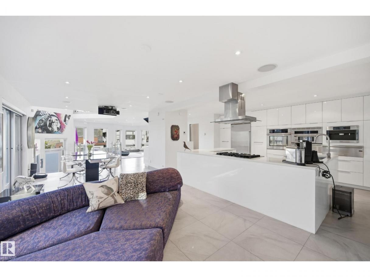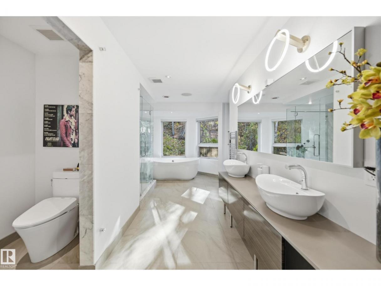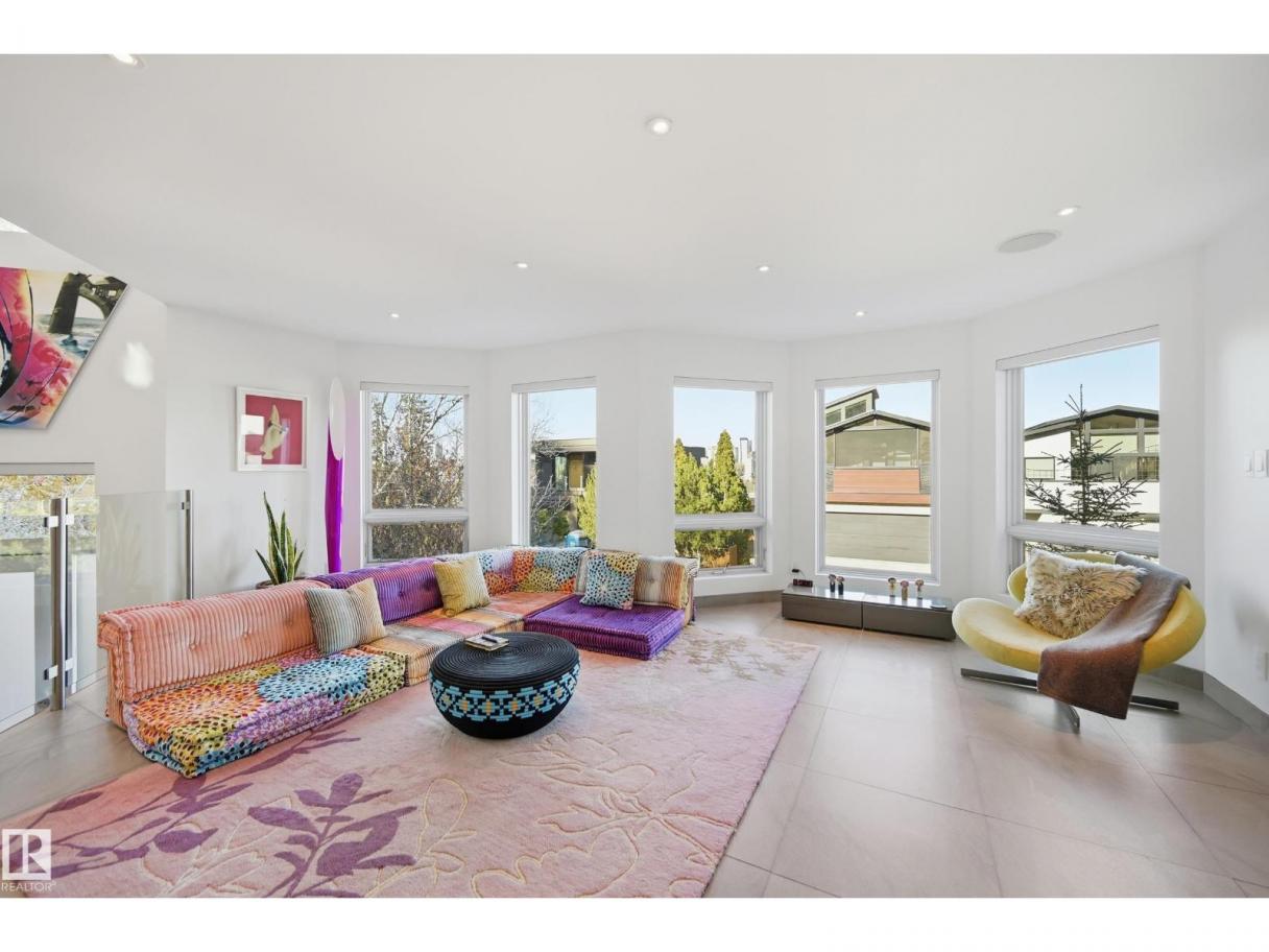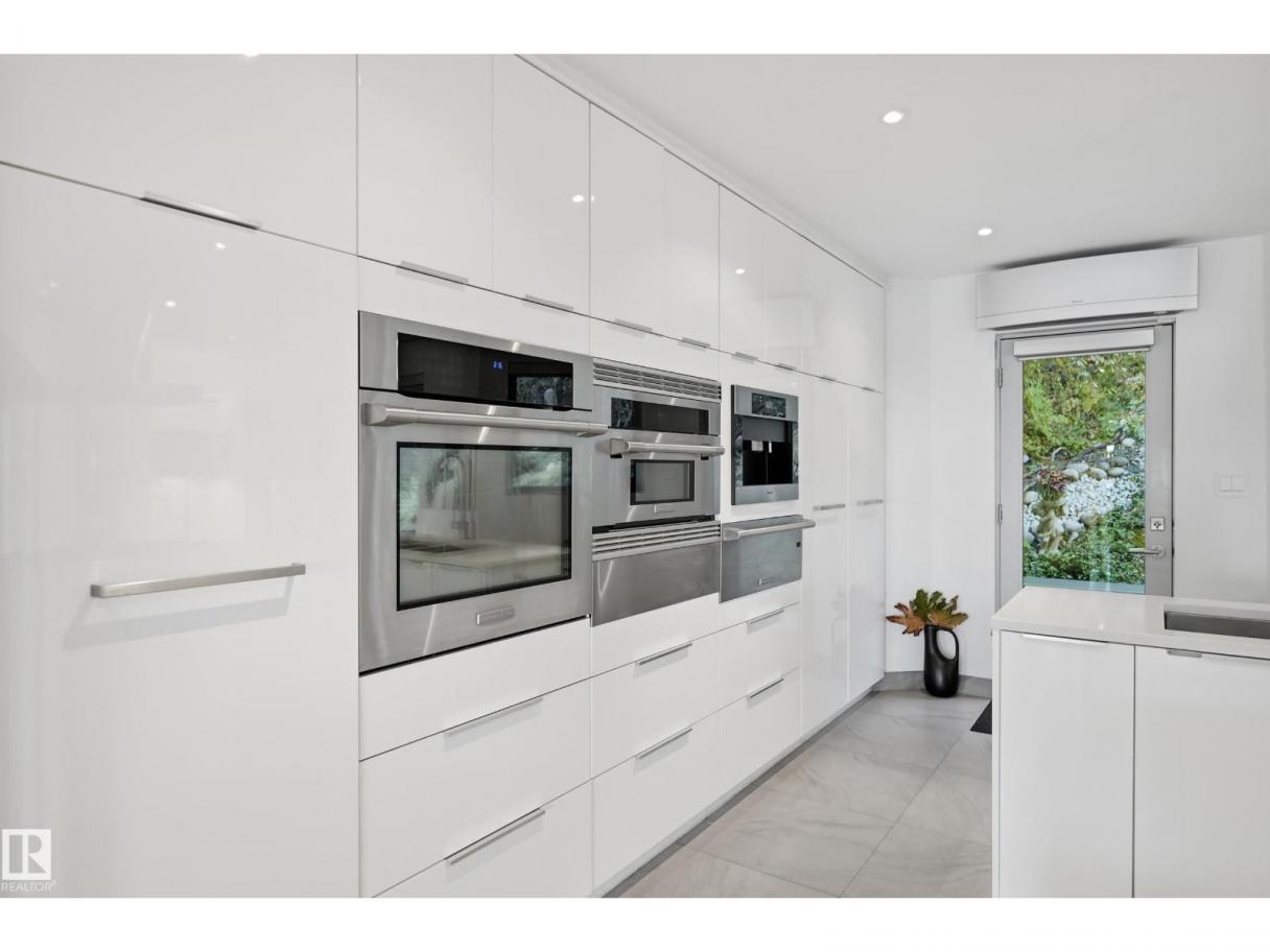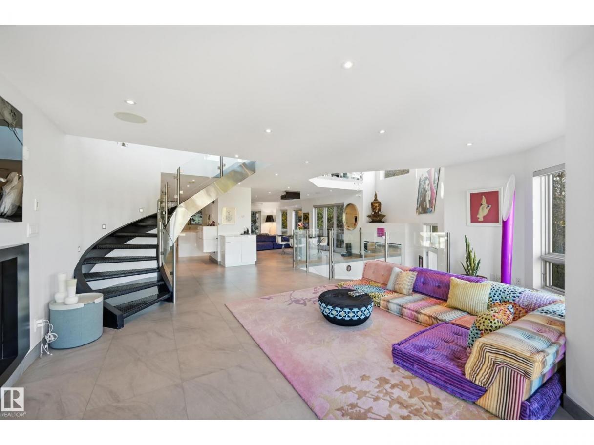 ARCHITECTURAL GEM IN EDMONTON’S RIVER VALLEY! Tucked into the quiet enclave of Skunk Hollow, this modern home blends thoughtful design with rare privacy. Rebuilt from the frame up in 2007, it offers clean lines, warm natural light, and a calm connection to its ravine setting. Large windows frame views of the trees by day and city lights by night. The open main floor features two inviting living areas and a chef’s kitchen with Sub-Zero and Miele appliances, perfect for cooking or entertaining. Upstairs, the owner’s retreat includes a private office, flex space, spa-inspired ensuite, and expansive walk-in closet with access to a peaceful patio. The reverse walkout lower level offers a heated epoxy garage, full bath, and guest/flex room (no window), with in-floor heating throughout. Opportunity exists to add additional bedrooms. NOTE: 3D renderings illustrate potential future layouts. Garage photo virtually staged. (id:6769)