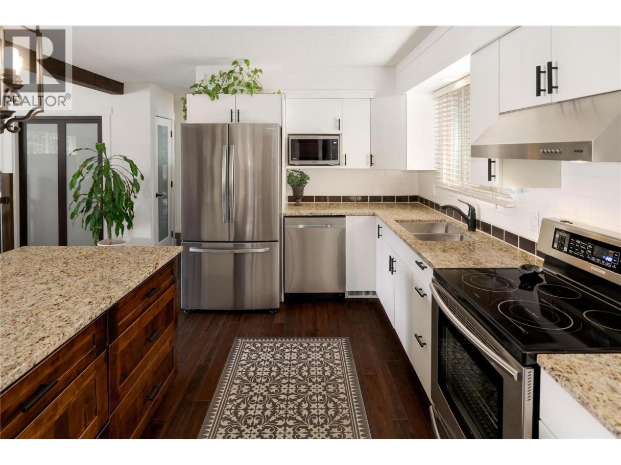 Just steps to the lake and tucked into one of Kelowna’s most charming neighbourhood pockets, this lovingly cared for and beautifully updated split-level home offers a rare combination of lifestyle, privacy, and versatility. Backing onto farmland, the setting feels open and peaceful while placing you within walking distance to local favourites including Dunnenzies Pizza, Sunshine Market, and Barn Owl Brewing. Inside, the home immediately feels warm and inviting. The main living space is filled with natural light and anchored by a statement fireplace, while rich wood flooring flows throughout much of the home. The updated kitchen and dining area connect seamlessly to the living space, creating an ideal layout for both everyday living and casual entertaining. The split-level design offers excellent separation and functionality. Bedrooms are thoughtfully positioned for privacy, including a spacious primary retreat. The beautifully renovated bathroom features a freestanding soaker tub, glass shower, and double vanity, creating a spa-inspired space to unwind. The lower level offers exceptional flexibility with a generous recreation and games room complete with fireplace—perfect for hosting friends, movie nights, or hobbies. Outside, the property continues to impress with a large detached shop offering incredible versatility for storage, projects, or a workspace. With farmland stretching behind the home, the backyard enjoys a sense of openness and privacy that is increasingly rare this close to the lake.Set in a highly walkable location near the water, local markets, and restaurants, this property perfectly balances comfort, character, and lifestyle. (id:6769)