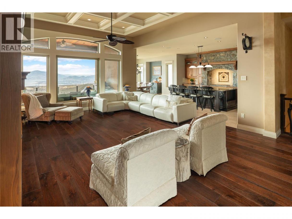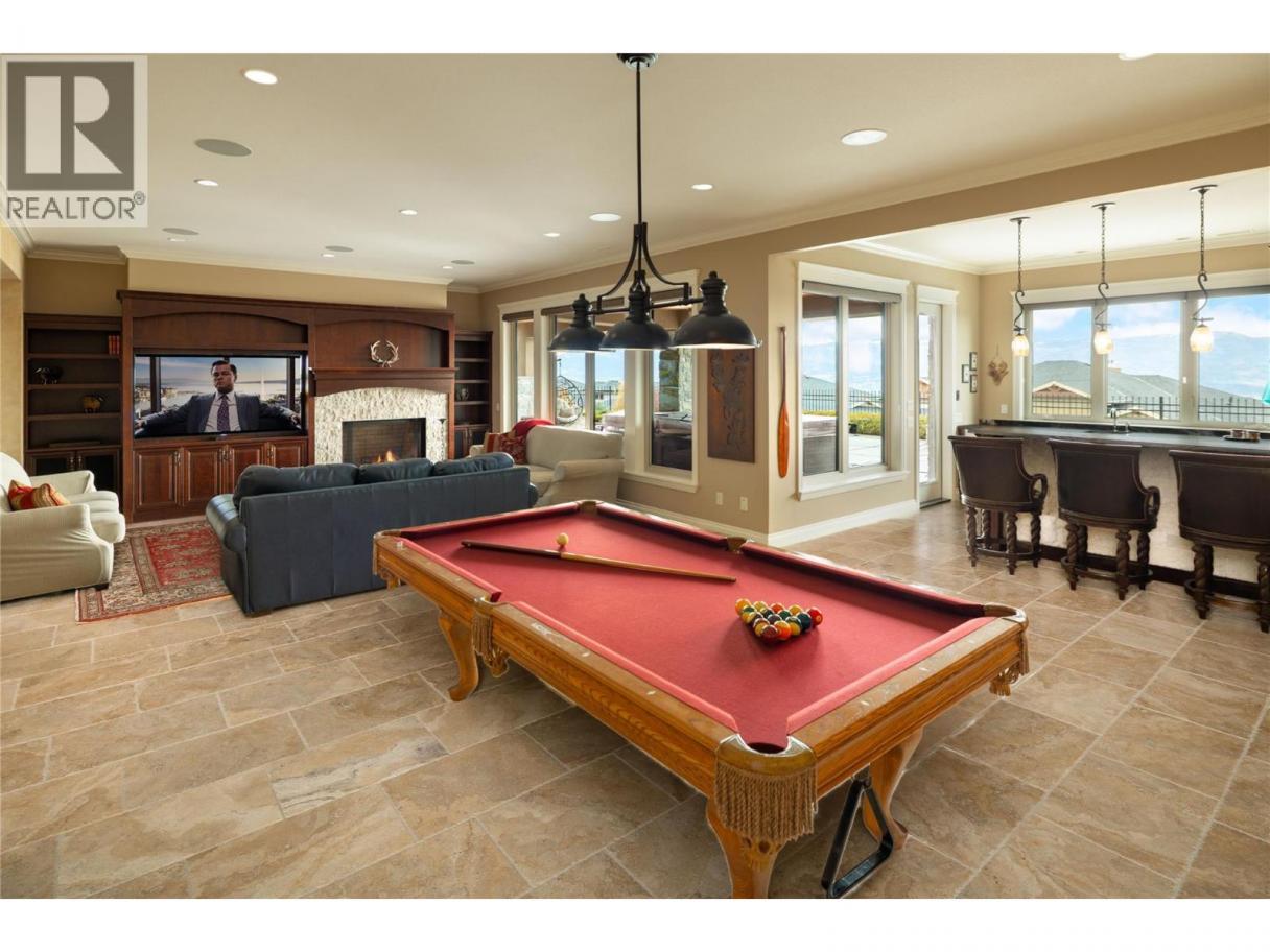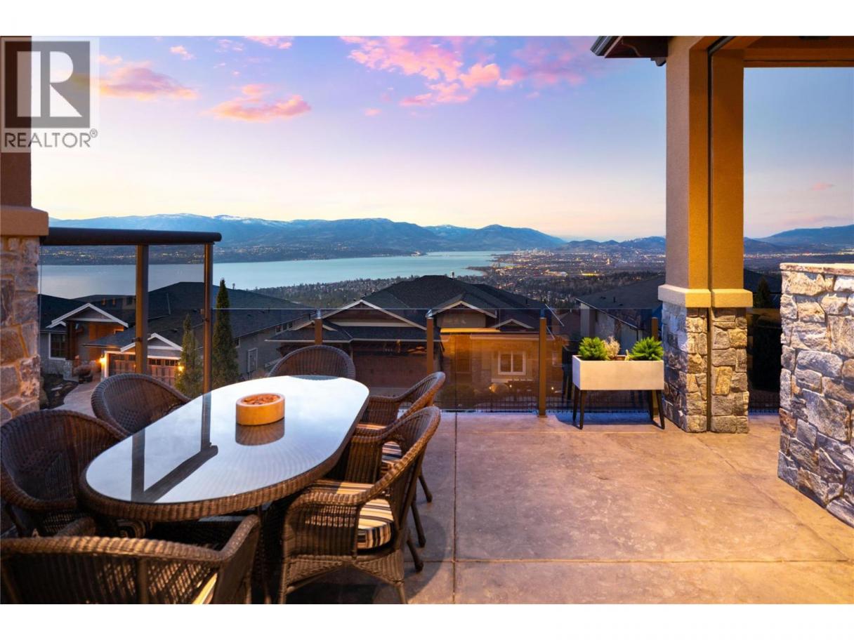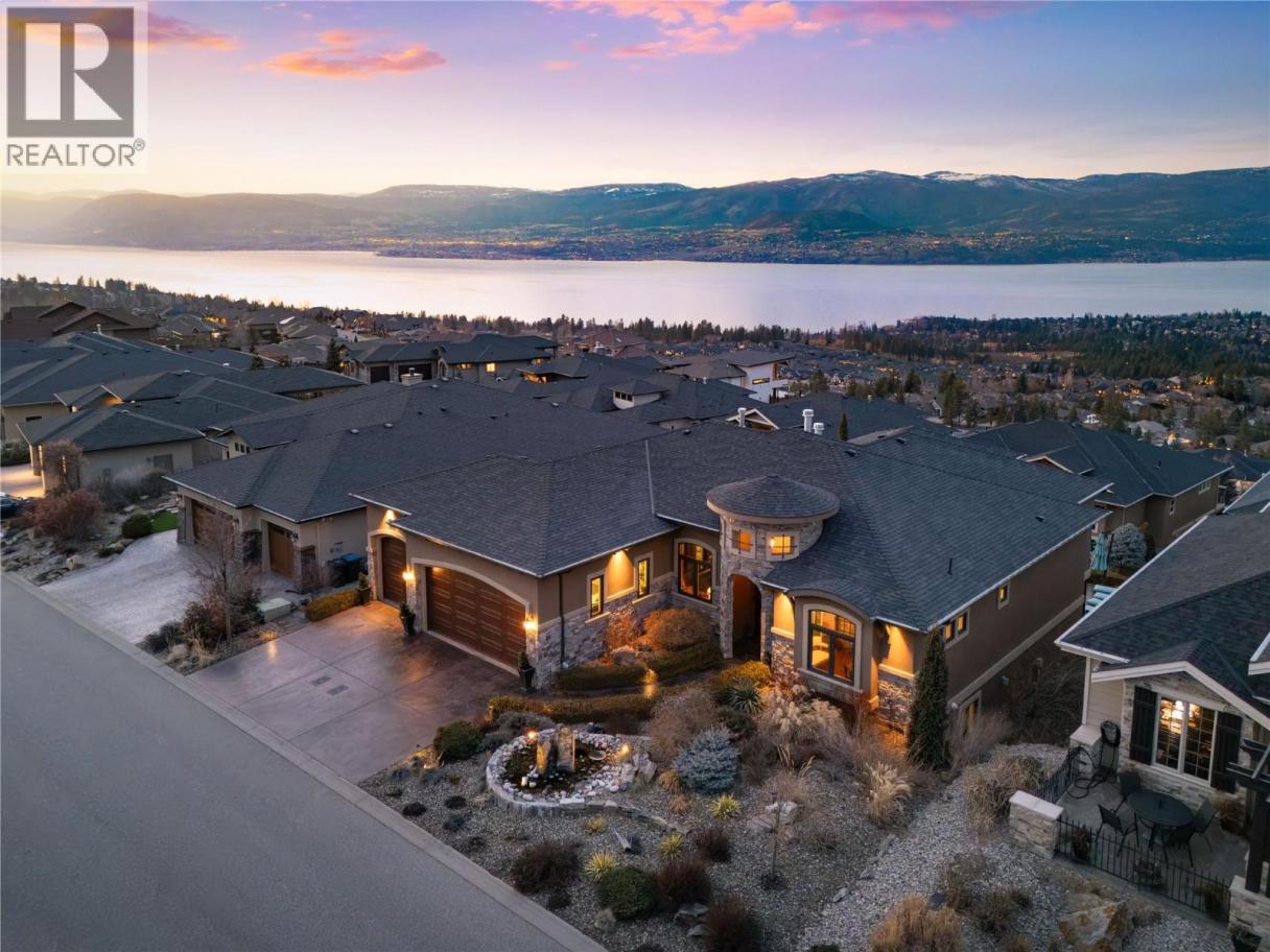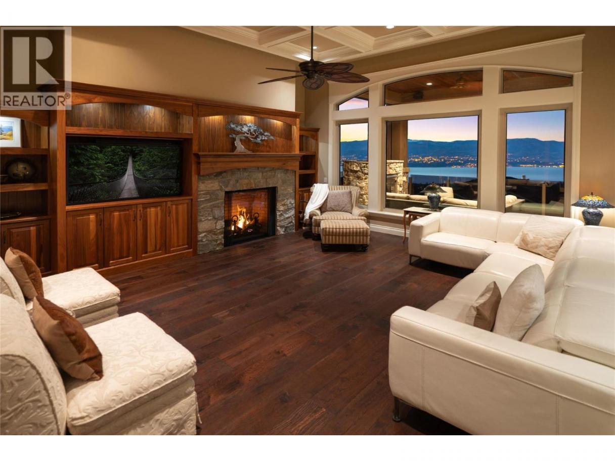 Located in the prestigious Upper Mission, this one-of-a-kind executive residence offers over 5,500 sq.ft. of refined living space with expansive lake, valley & city views. Designed for both everyday comfort & exceptional entertaining, this luxury home showcases timeless materials, quality craftsmanship & thoughtfully designed spaces throughout, offering the convenience of main-level living. The living area features coffered ceilings, wide plank oak flooring, stone fireplace & expansive windows framing the surrounding views. A statement fireplace anchors the room while the kitchen is appointed with custom cabinetry by Westwood, a large gathering island, premium appliances & Thermador gas range. Architectural details continue throughout with five fireplaces adding warmth & character across multiple living spaces. A dedicated scotch room provides an impressive setting for collectors & entertaining. The primary suite offers lake views, a spacious walk-in closet & a beautifully finished ensuite with soaker tub, dual vanities & walk-in shower. The walk-out lower level is designed for recreation & relaxation with a spacious family room, recreation area with wet bar, media room, fitness room & three king sized bedrooms. A convenient pool bathroom provides direct access to the outdoor entertaining areas. Outdoors, the property captures the Okanagan lifestyle with a stunning tile saltwater pool, expansive patio spaces & beautifully landscaped surroundings. The covered outdoor lounge features a stone fireplace, electronic TV & integrated hot tub area—perfect for year-round enjoyment. The triple garage includes epoxy flooring, an oversized RV-height garage door & ample space for vehicles, toys or workshop needs. Set among luxury homes in Kelowna’s sought-after Upper Mission, this exceptional property offers privacy, craftsmanship & a lifestyle designed to be enjoyed. (id:6769)