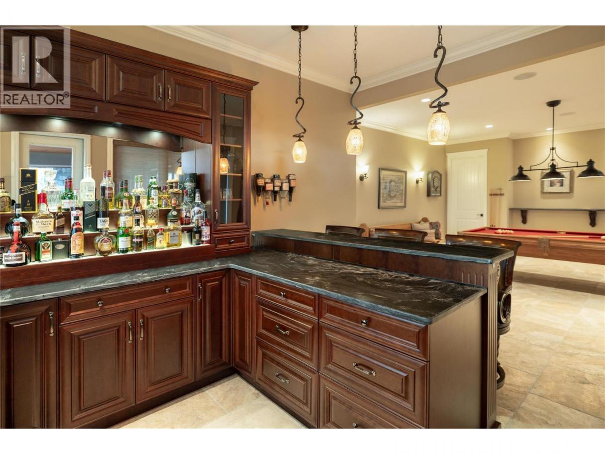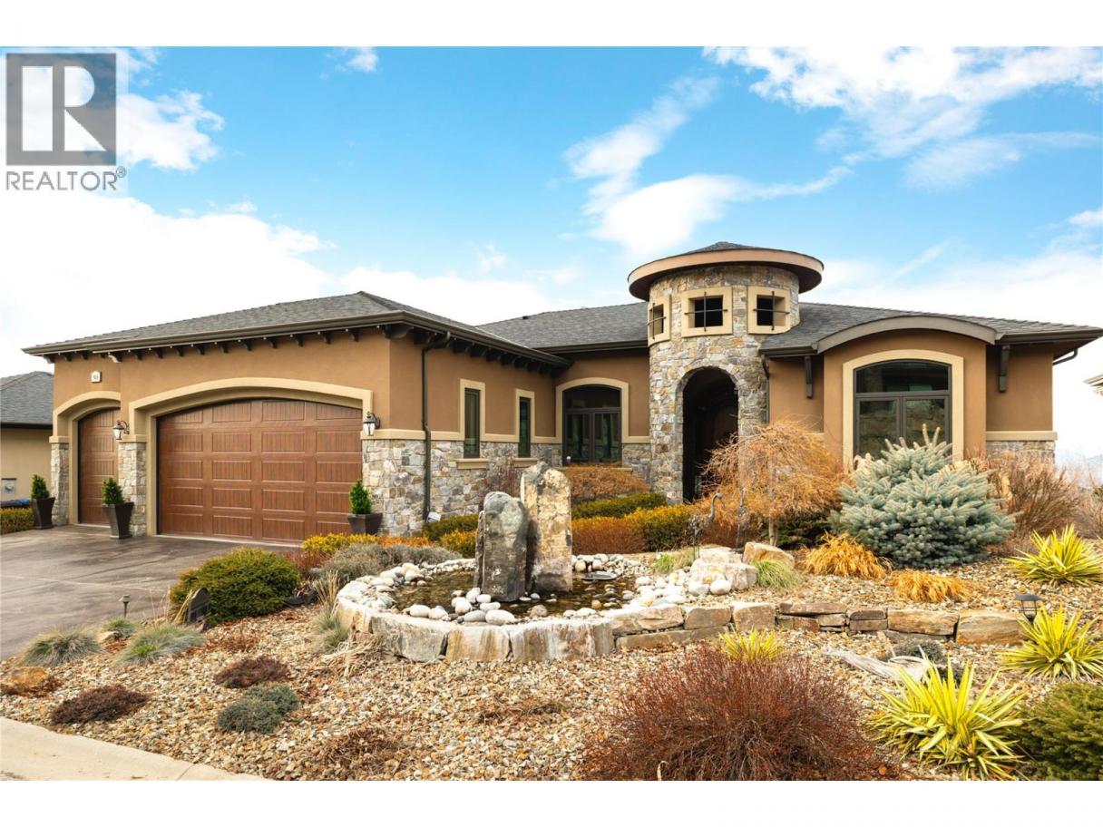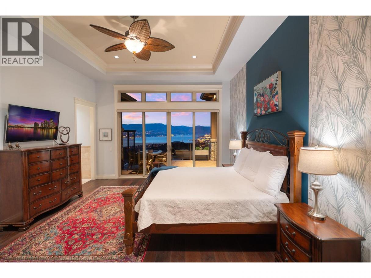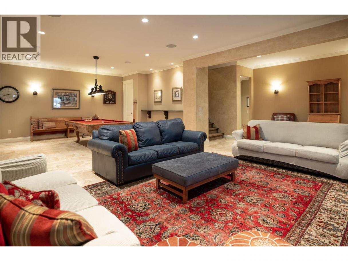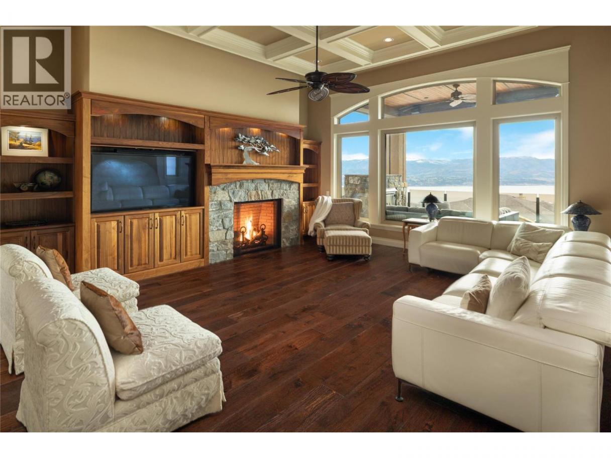 Located in the prestigious Upper Mission, this one-of-a-kind executive residence offers over 5,500 sq.ft. of refined living space with expansive lake, valley & city views. Designed for both everyday comfort & exceptional entertaining, this luxury home showcases timeless materials, quality craftsmanship & thoughtfully designed spaces throughout, offering the convenience of main-level living. The living area features coffered ceilings, wide plank oak flooring, stone fireplace & expansive windows framing the surrounding views. A statement fireplace anchors the room while the kitchen is appointed with custom cabinetry by Westwood, a large gathering island, premium appliances & Thermador gas range. Architectural details continue throughout with five fireplaces adding warmth & character across multiple living spaces. A dedicated scotch room provides an impressive setting for collectors & entertaining. The primary suite offers lake views, a spacious walk-in closet & a beautifully finished ensuite with soaker tub, dual vanities & walk-in shower. The walk-out lower level is designed for recreation & relaxation with a spacious family room, recreation area with wet bar, media room, fitness room & three king sized bedrooms. A convenient pool bathroom provides direct access to the outdoor entertaining areas. Outdoors, the property captures the Okanagan lifestyle with a stunning tile saltwater pool, expansive patio spaces & beautifully landscaped surroundings. The covered outdoor lounge features a stone fireplace, electronic TV & integrated hot tub area—perfect for year-round enjoyment. The triple garage includes epoxy flooring, an oversized RV-height garage door & ample space for vehicles, toys or workshop needs. Set among luxury homes in Kelowna’s sought-after Upper Mission, this exceptional property offers privacy, craftsmanship & a lifestyle designed to be enjoyed. (id:6769)