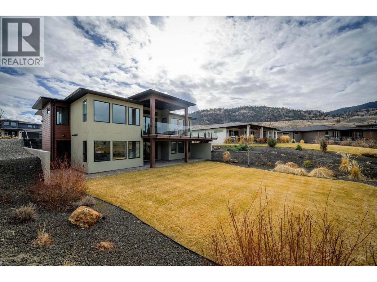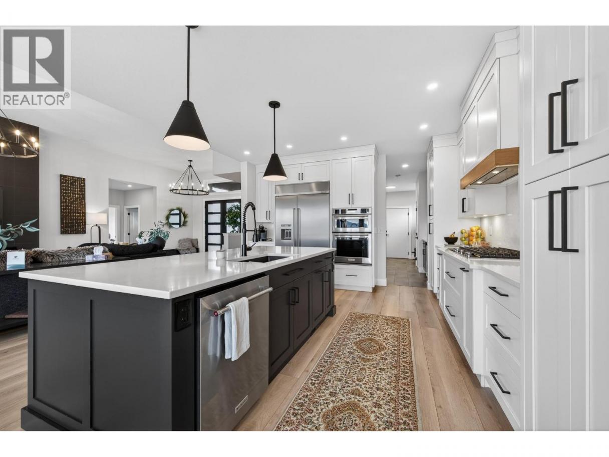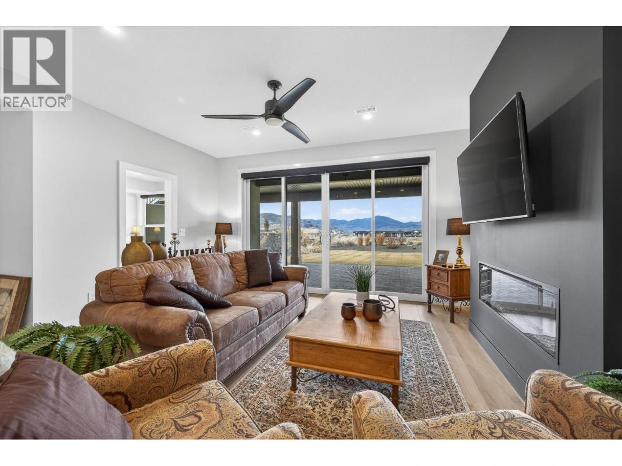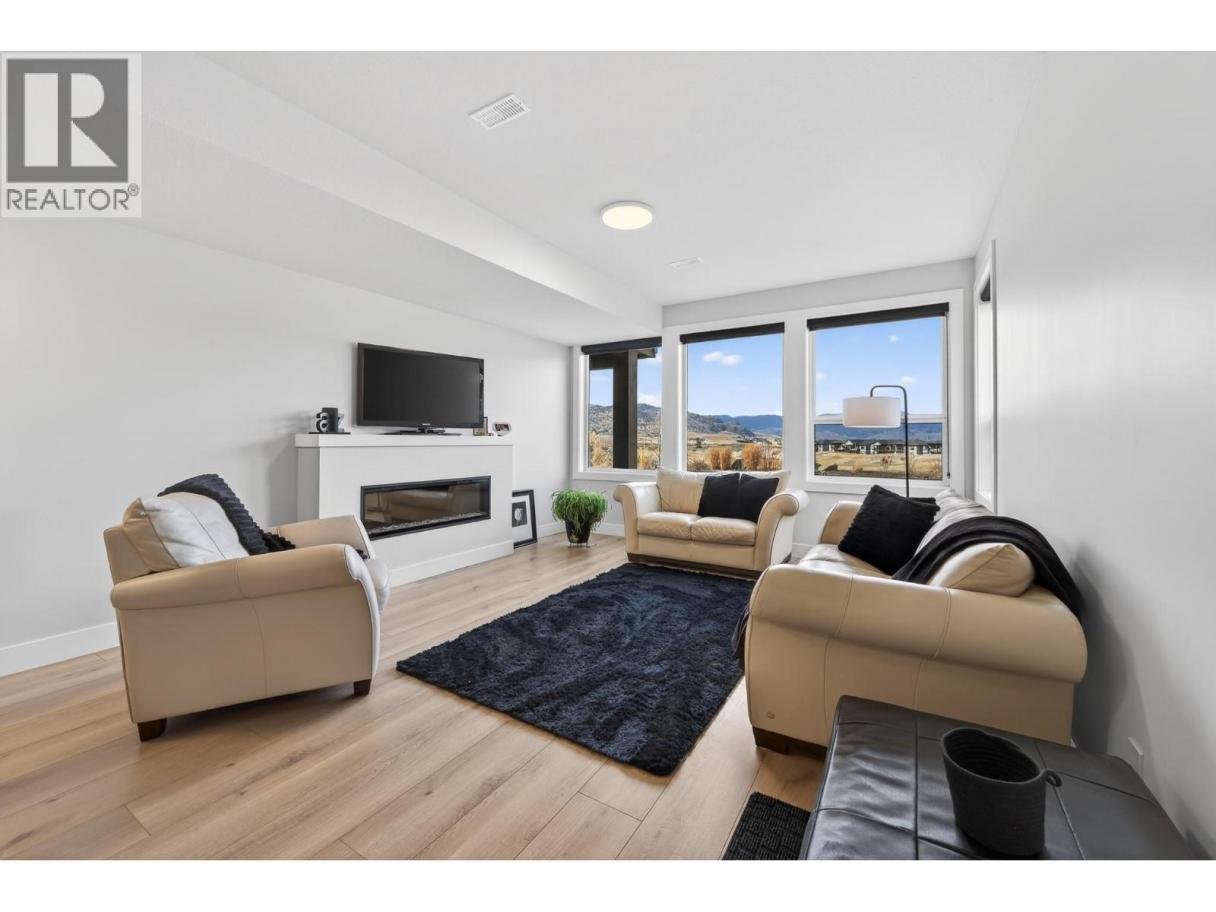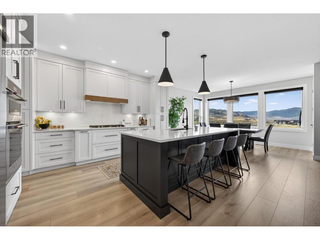 Quality craftsmanship defines this gorgeous home backing onto the 4th green at Tobiano Golf Course. The open-concept main level features a spacious kitchen with a large island, quartz countertops, and high-end KitchenAid appliances. Beautiful premium flooring runs throughout, complemented by electric fireplaces and an oversized foyer. A dedicated coffee and beverage bar adds convenience and charm. Large master bedroom with dream ensuite. The fully finished basement includes two bedrooms, a family room, a full bathroom, and walkout access to a covered patio. Additional features include custom blinds, central vacuum, hot water on demand, and a heat pump. The impressive 1,052 sq. ft. triple garage provides exceptional storage and parking. A bright, sunny suite with its own entrance and laundry offers excellent flexibility. The flat, beautifully landscaped backyard is wired for a hot tub, and natural gas is available on the covered deck for outdoor cooking and entertaining. (id:6769)