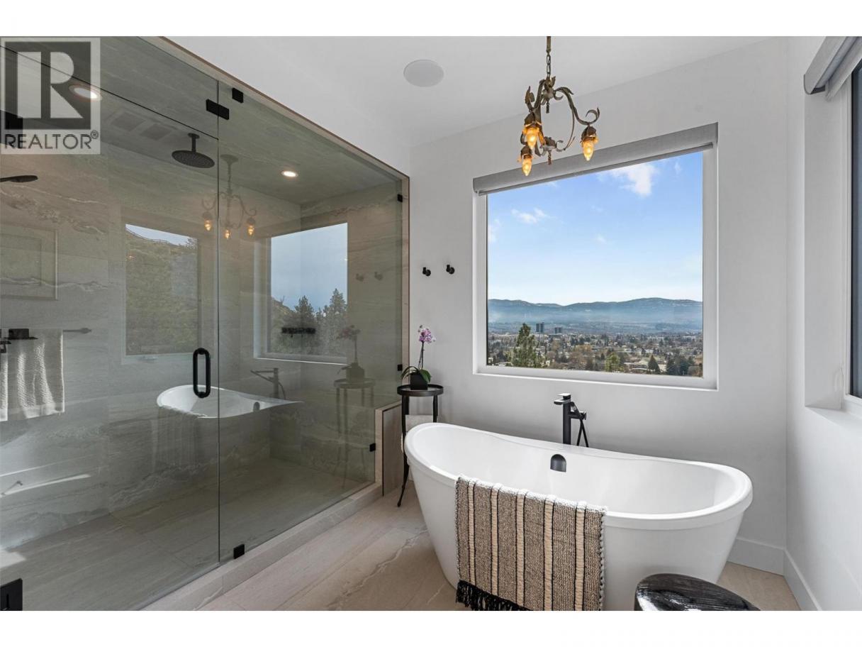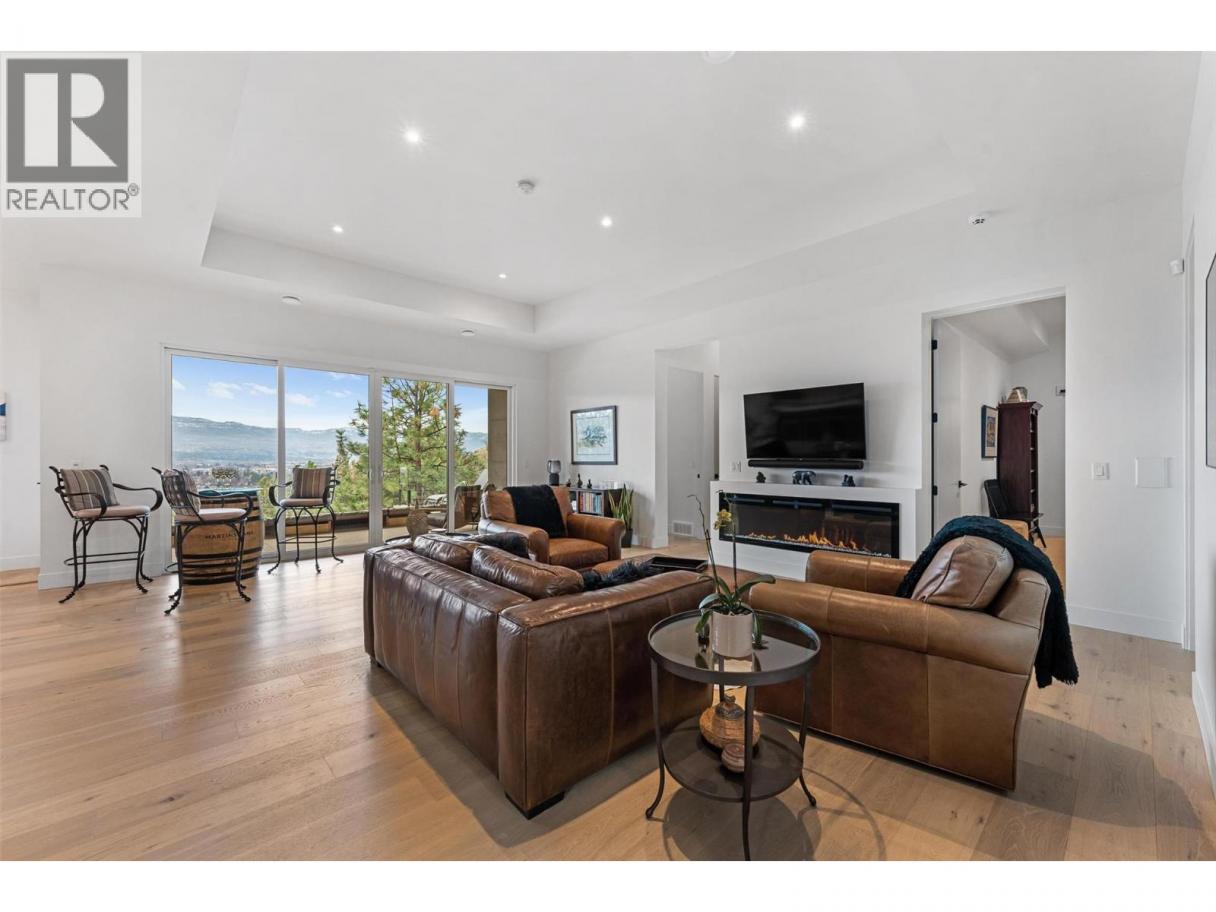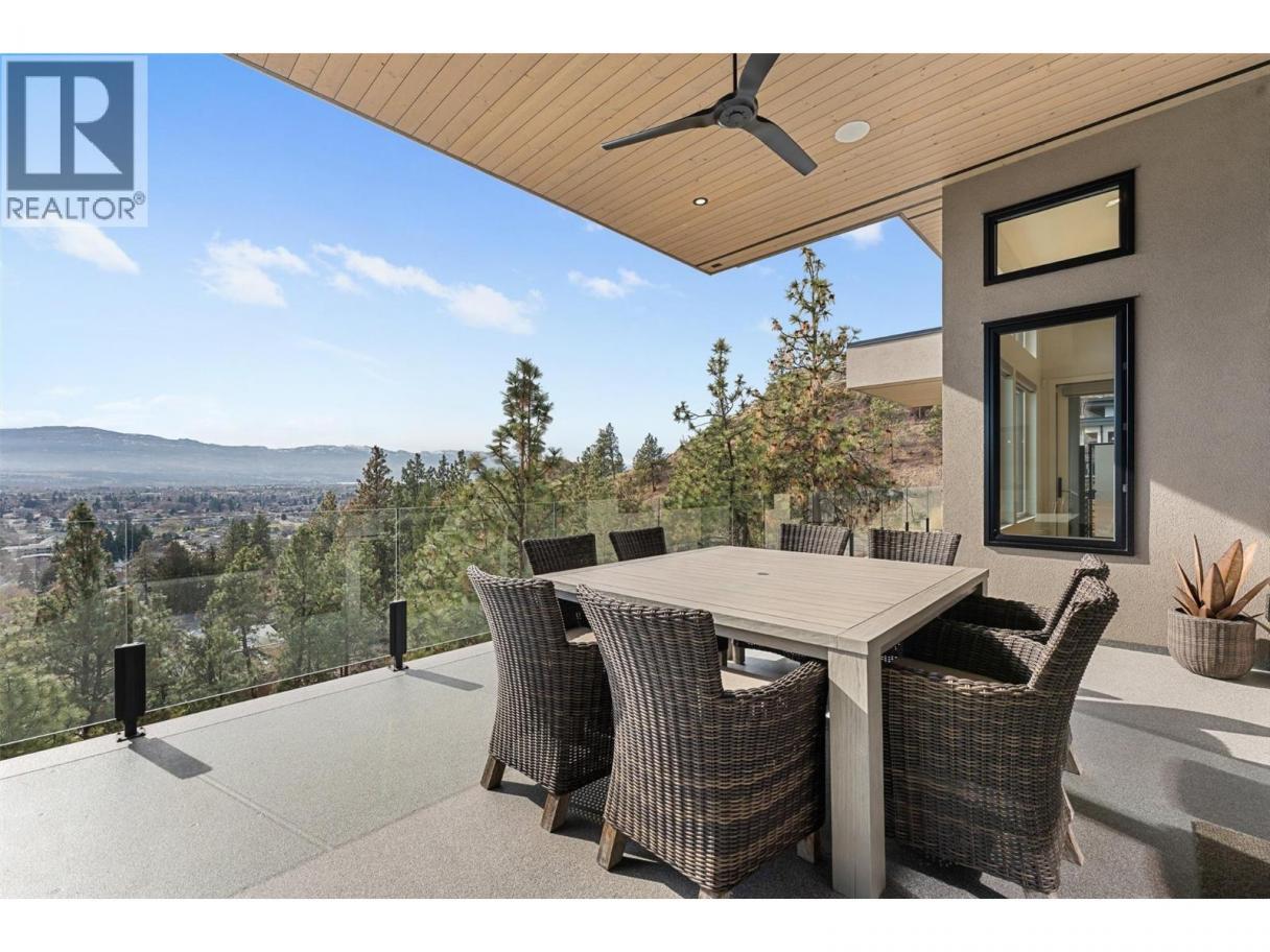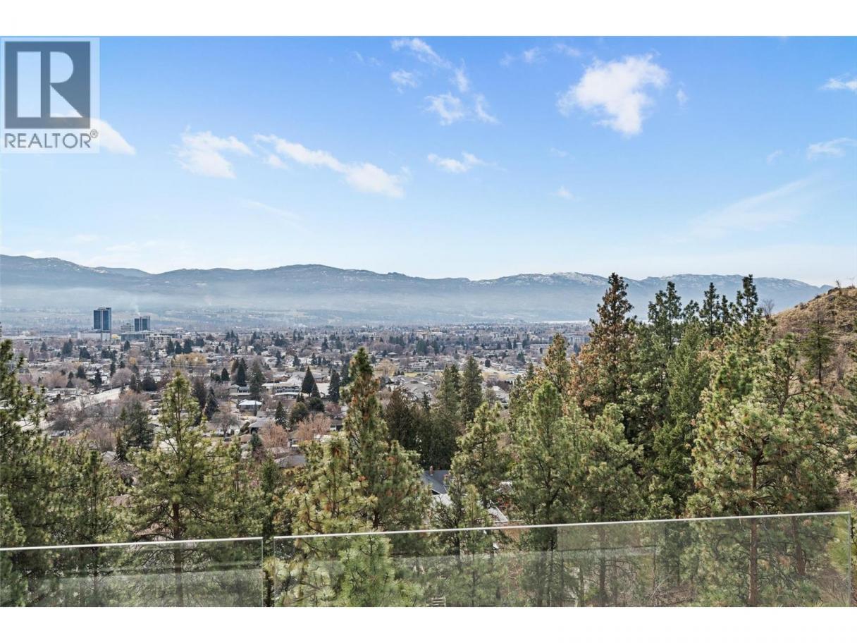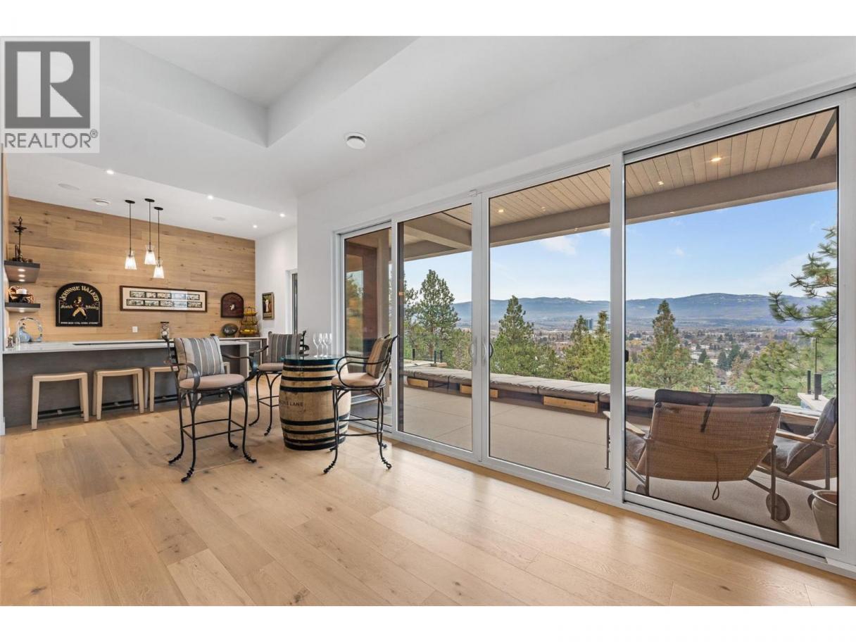 An exceptional modern residence set above the city, offering refined design, impressive craftsmanship and sweeping panoramic views of the city, mountains and Okanagan Lake. Thoughtfully designed for seamless indoor-outdoor living, this home captures the essence of the Okanagan lifestyle. The open-concept main level is defined by soaring ceilings, wide plank oak flooring and expansive windows that frame the breathtaking outlook. At the heart of the home, the gourmet kitchen showcases quartz countertops, a waterfall island, Westwood cabinetry, full-height quartz backsplash and premium appliances including a Wolf gas range and Sub-Zero refrigerator, complemented by a well-appointed butler’s pantry with beverage fridge and coffee station. The great room features a floor-to-ceiling soft white brick fireplace with custom built-ins, while sliding doors extend the living space onto the expansive south-facing covered deck with frameless glass railing and incredible views. The primary suite offers private deck access, a custom walk-in closet with laundry and a spa-inspired ensuite with steam shower and freestanding soaker tub. The lower level is designed for entertaining with a spacious family room, stylish bar area, gym or flexible recreation space and direct access to the outdoor living areas. Outside, a private resort-style setting awaits with a heated saltwater infinity pool, lounging areas and beautifully landscaped grounds. Complete with a heated garage, EV charging and smart home features. Located in the Highpointe Terraces neighborhood, on quiet no thru road, hiking and walk trails nearby and a short hop to nearby amenities. (id:6769)