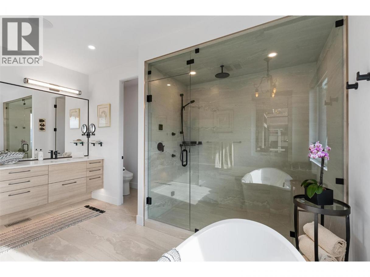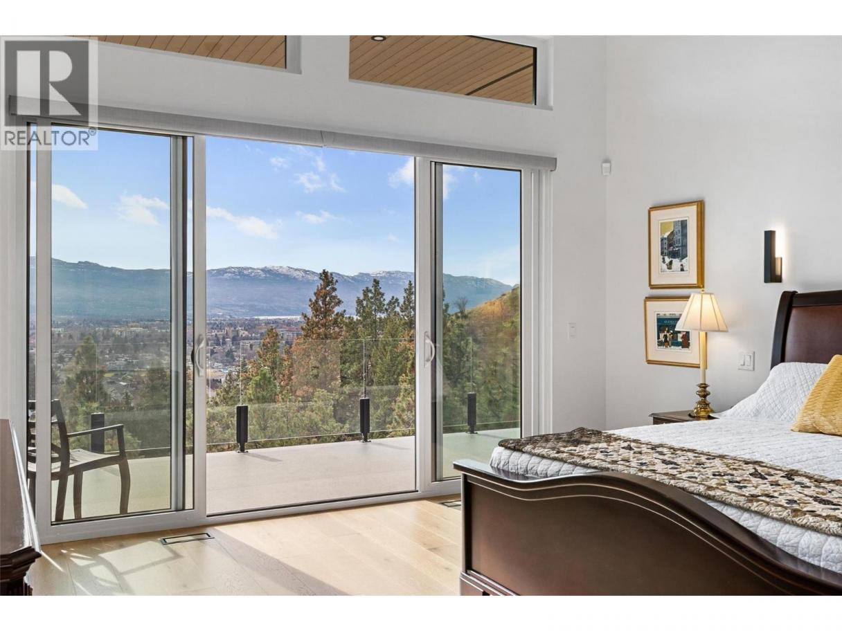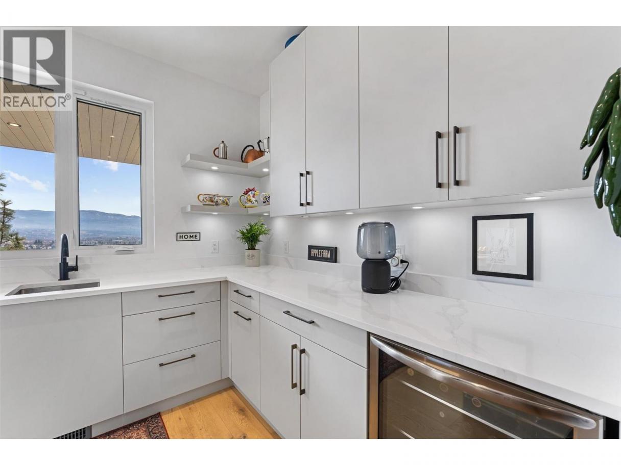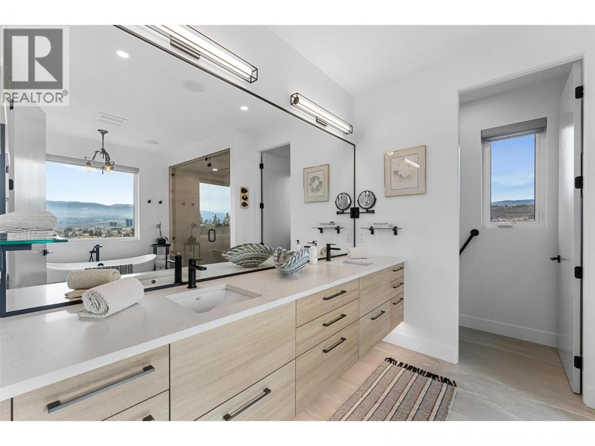 An exceptional modern residence set above the city, offering refined design, impressive craftsmanship and sweeping panoramic views of the city, mountains and Okanagan Lake. Thoughtfully designed for seamless indoor-outdoor living, this home captures the essence of the Okanagan lifestyle. The open-concept main level is defined by soaring ceilings, wide plank oak flooring and expansive windows that frame the breathtaking outlook. At the heart of the home, the gourmet kitchen showcases quartz countertops, a waterfall island, Westwood cabinetry, full-height quartz backsplash and premium appliances including a Wolf gas range and Sub-Zero refrigerator, complemented by a well-appointed butler’s pantry with beverage fridge and coffee station. The great room features a floor-to-ceiling soft white brick fireplace with custom built-ins, while sliding doors extend the living space onto the expansive south-facing covered deck with frameless glass railing and incredible views. The primary suite offers private deck access, a custom walk-in closet with laundry and a spa-inspired ensuite with steam shower and freestanding soaker tub. The lower level is designed for entertaining with a spacious family room, stylish bar area, gym or flexible recreation space and direct access to the outdoor living areas. Outside, a private resort-style setting awaits with a heated saltwater infinity pool, lounging areas and beautifully landscaped grounds. Complete with a heated garage, EV charging and smart home features. Located in the Highpointe Terraces neighborhood, on quiet no thru road, hiking and walk trails nearby and a short hop to nearby amenities. (id:6769)