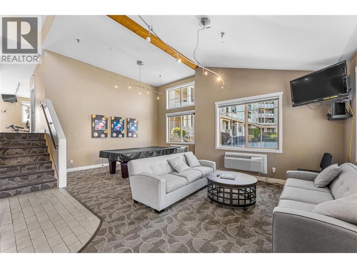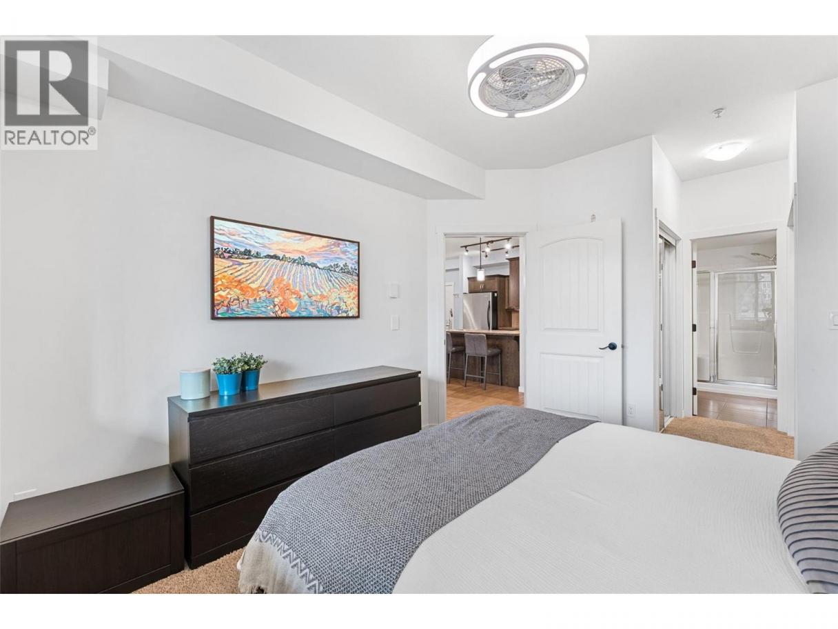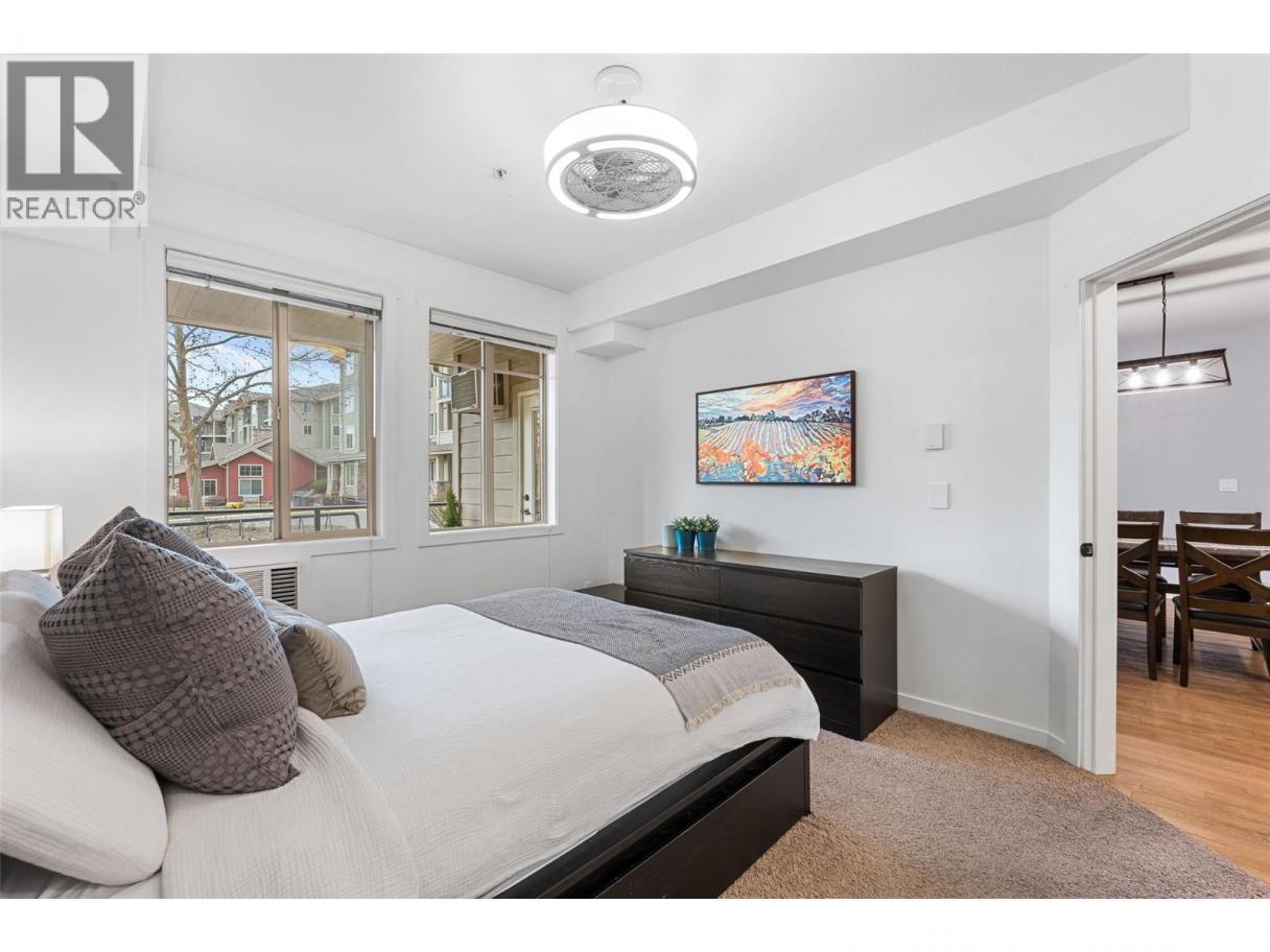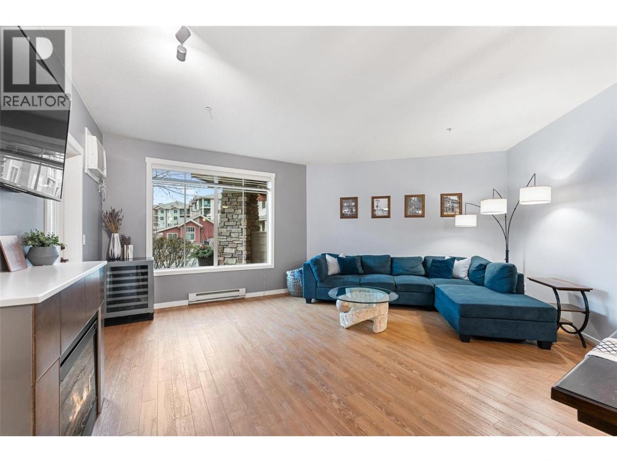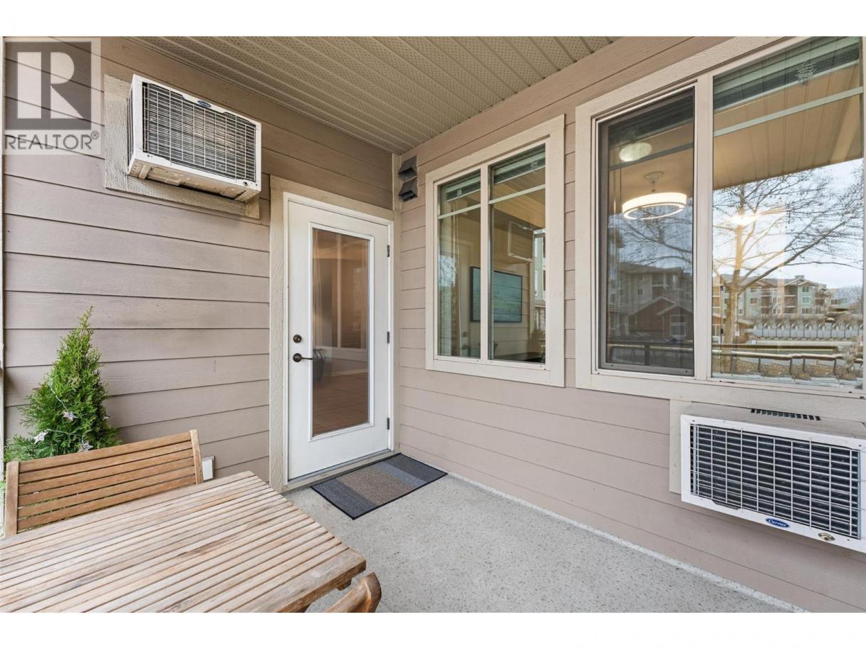 Bright and inviting ground-level residence in Mission Meadows, built by Mission Group and ideally located in Kelowna’s desirable Lower Mission. Thoughtfully designed, this home offers 1 bed plus oversized den and 2 baths, creating a functional layout ideal for first-time buyers, professionals, or downsizers. High ceilings and wide-plank flooring enhance the open-concept living spaces, while large windows fill the home with natural light. The spacious kitchen features a U-shaped layout with island seating, oak cabinetry with under-cabinet lighting, and a newer appliance package. The dining area accommodates a full table and flows into the bright living room, complete with an electric fireplace and access to the covered patio—perfect for outdoor dining or morning coffee. The primary suite offers generous natural light, a walk-through closet with built-ins, and a private ensuite. A separate den provides flexible space for a home office or reading nook. Additional highlights include fresh paint, upgraded lighting, a new kitchen faucet, in-suite laundry, excellent in-unit storage, and two wall-mounted A/C units for comfort. This well-maintained building offers a resident clubhouse with fitness centre, games room, and kitchen, plus bike storage, guest parking, a dedicated parking stall, and storage locker. Potential additional parking for rent through strata. Just steps to H2O Adventure + Fitness Centre, shopping, cafés, transit, walking trails, and everyday amenities. (id:6769)