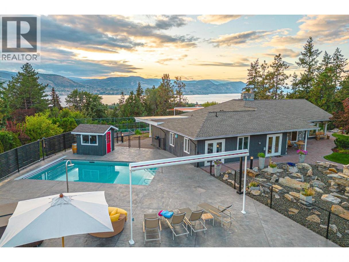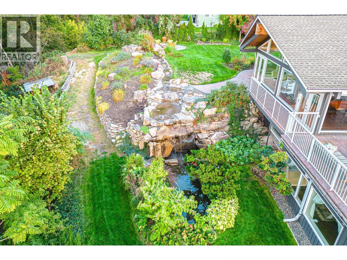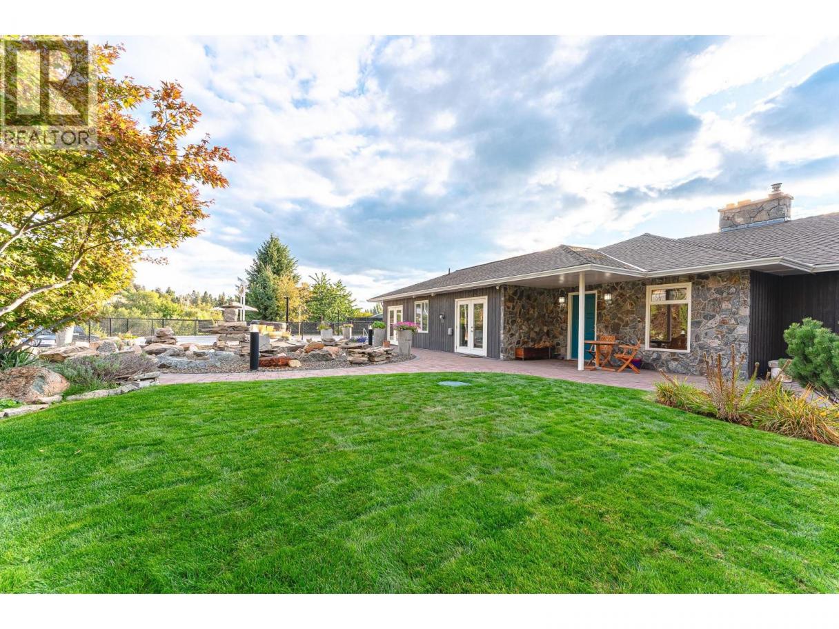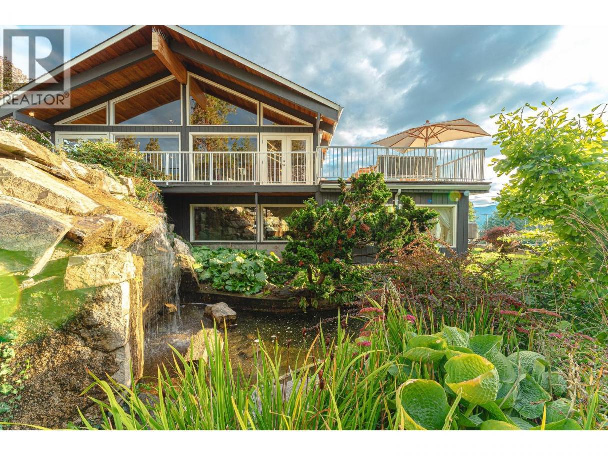 Nestled in luscious grounds this sprawling over 4700 sq ft RANCHER plus basement features: VIEWS, salt-water POOL, pickleball/tennis/basketball COURT, WORKSHOP and a GARAGE. Walk into your home with pouring natural light, massive wood beams and double sided granite fireplace overlooking the WATERFALL. This expansive home has a grand room with vaulted ceilings, room for a 10-person table, walk-out onto your vast patio with spectacular views of the lake. Perfect for entertaining or relaxing. Primary bedroom is beautifully finished with over 190sqft, walk through closet and tranquil ensuite. Bedrooms are steps away from the pool for ease. Downstairs you will find storage/den/wine cellar and a bathroom plus BONUS ROOM: gym/theater room or a potential suite. (id:6769)