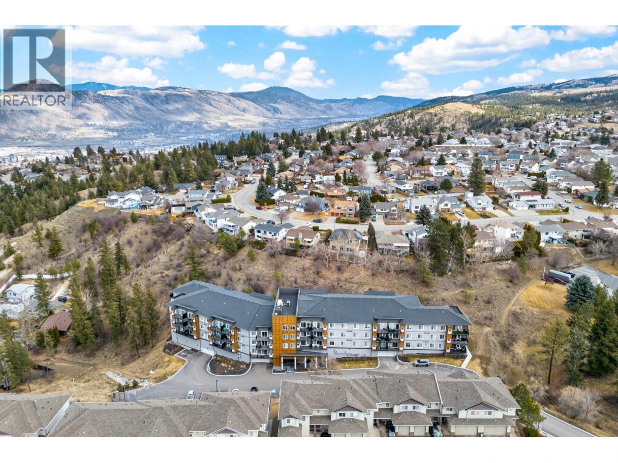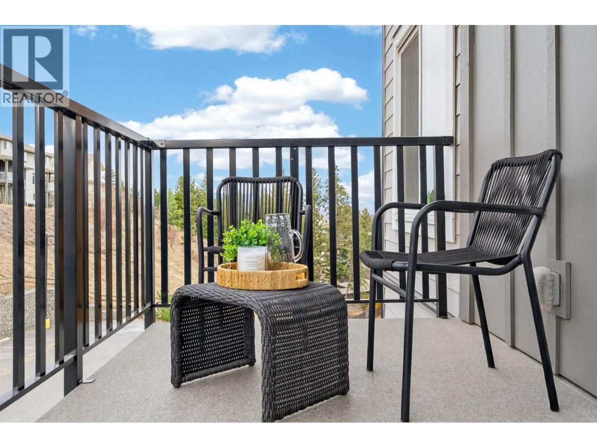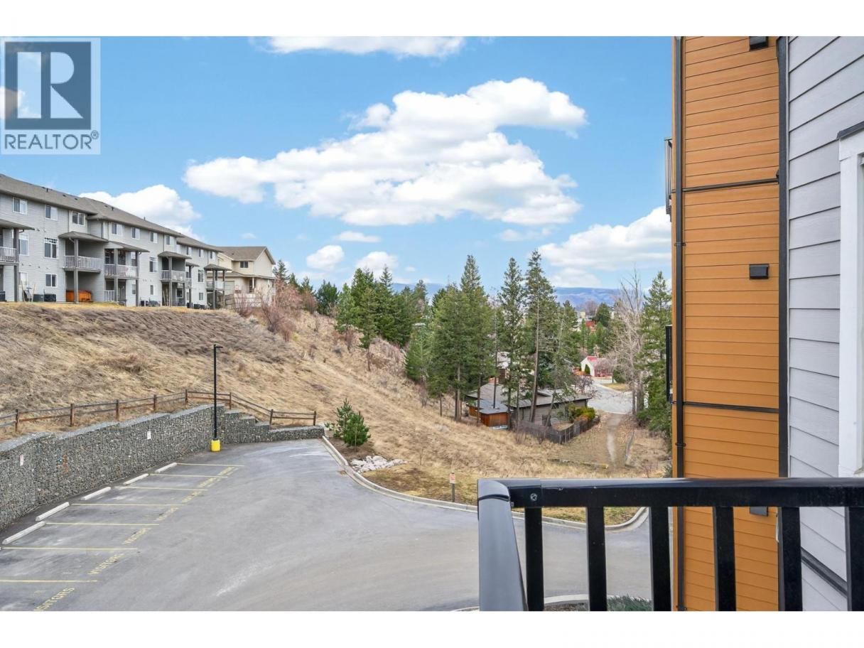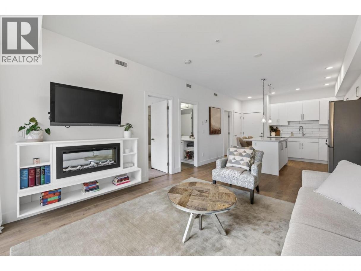 Immaculate 1 bedroom + den unit at The Rise in Sahali. Quietly located yet central to everything Kamloops has to offer, including minutes to TRU, Aberdeen Mall, restaurants, groceries, trails, and quick highway access. The modern kitchen features quartz countertops, a large island, sleek cabinetry, and stainless steel appliances including a gas stove. The open concept living area offers nine-foot ceilings and large sliding glass doors leading to the patio, bringing in perfect afternoon sunshine. Enjoy your outdoor space with a gas BBQ hookup and room for a couple of chairs or potted plants to create a cozy spot to relax. Comfort is key with central heating and A/C, ideal for Kamloops summers. The living room has built in shelving and an electric fireplace. The spacious bedroom includes a walk-in closet and convenient access to the bathroom, which features quartz counters, a generous vanity, and great storage. This unit also includes its own in-suite laundry and a versatile den that works perfectly as a home office, study space, or extra storage. Includes 1 secure underground parking stall and storage locker. Move-in ready with flexible completion available. An ideal low maintenance home for students, young professionals, first-time buyers, downsizers, or investors with a low strata fee of $239. (id:6769)