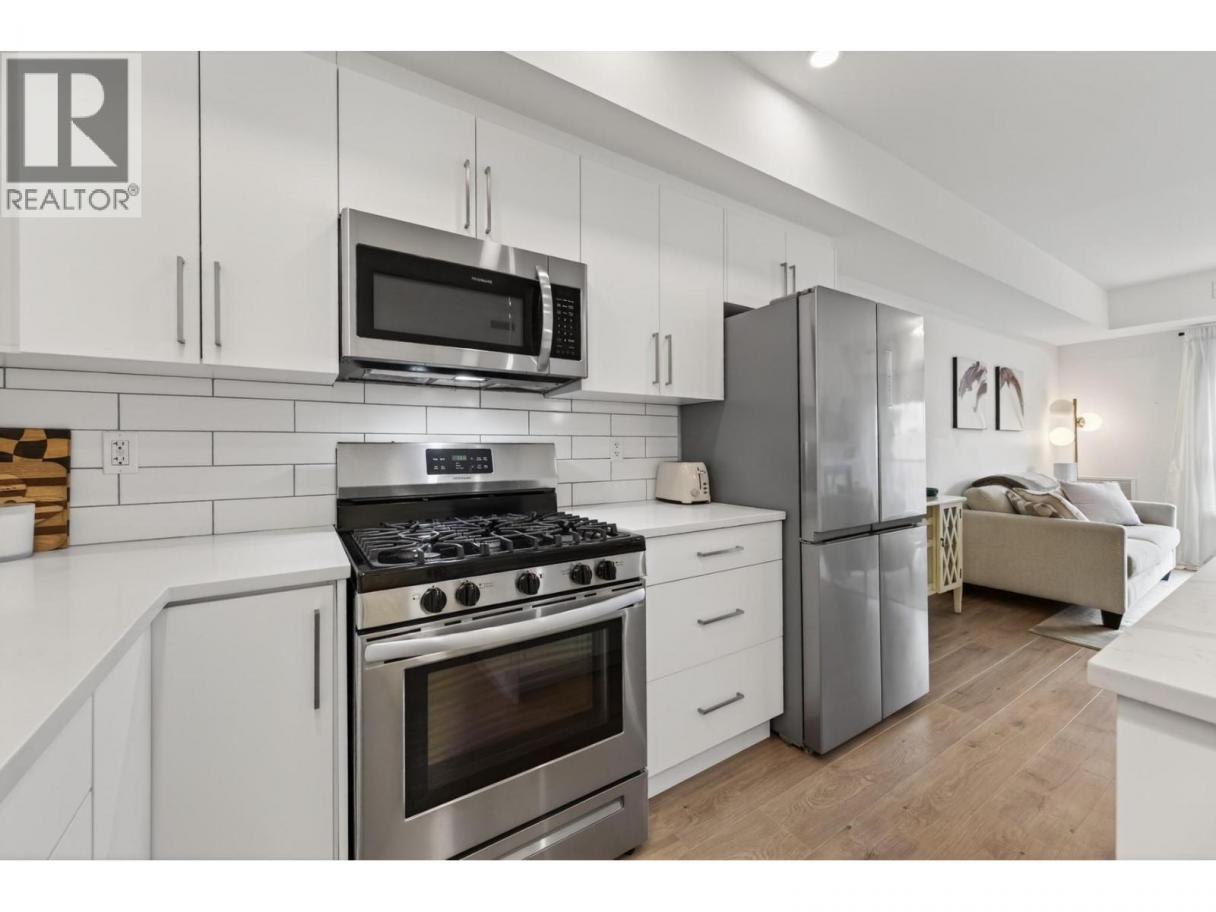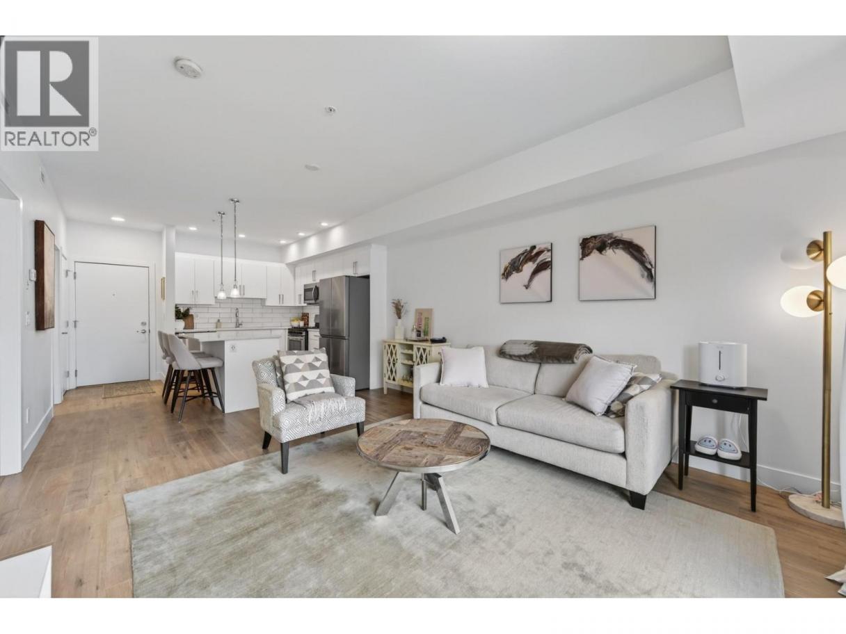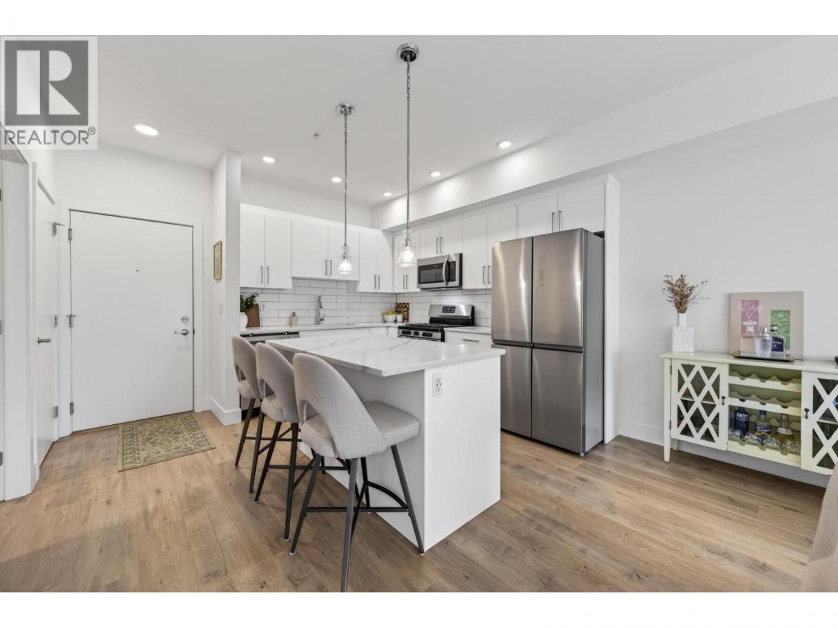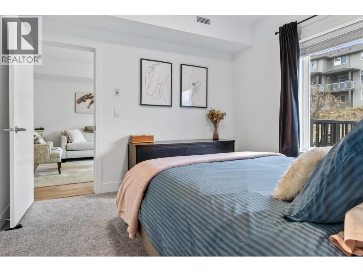 Immaculate 1 bedroom + den unit at The Rise in Sahali. Quietly located yet central to everything Kamloops has to offer, including minutes to TRU, Aberdeen Mall, restaurants, groceries, trails, and quick highway access. The modern kitchen features quartz countertops, a large island, sleek cabinetry, and stainless steel appliances including a gas stove. The open concept living area offers nine-foot ceilings and large sliding glass doors leading to the patio, bringing in perfect afternoon sunshine. Enjoy your outdoor space with a gas BBQ hookup and room for a couple of chairs or potted plants to create a cozy spot to relax. Comfort is key with central heating and A/C, ideal for Kamloops summers. The living room has built in shelving and an electric fireplace. The spacious bedroom includes a walk-in closet and convenient access to the bathroom, which features quartz counters, a generous vanity, and great storage. This unit also includes its own in-suite laundry and a versatile den that works perfectly as a home office, study space, or extra storage. Includes 1 secure underground parking stall and storage locker. Move-in ready with flexible completion available. An ideal low maintenance home for students, young professionals, first-time buyers, downsizers, or investors with a low strata fee of $239. (id:6769)