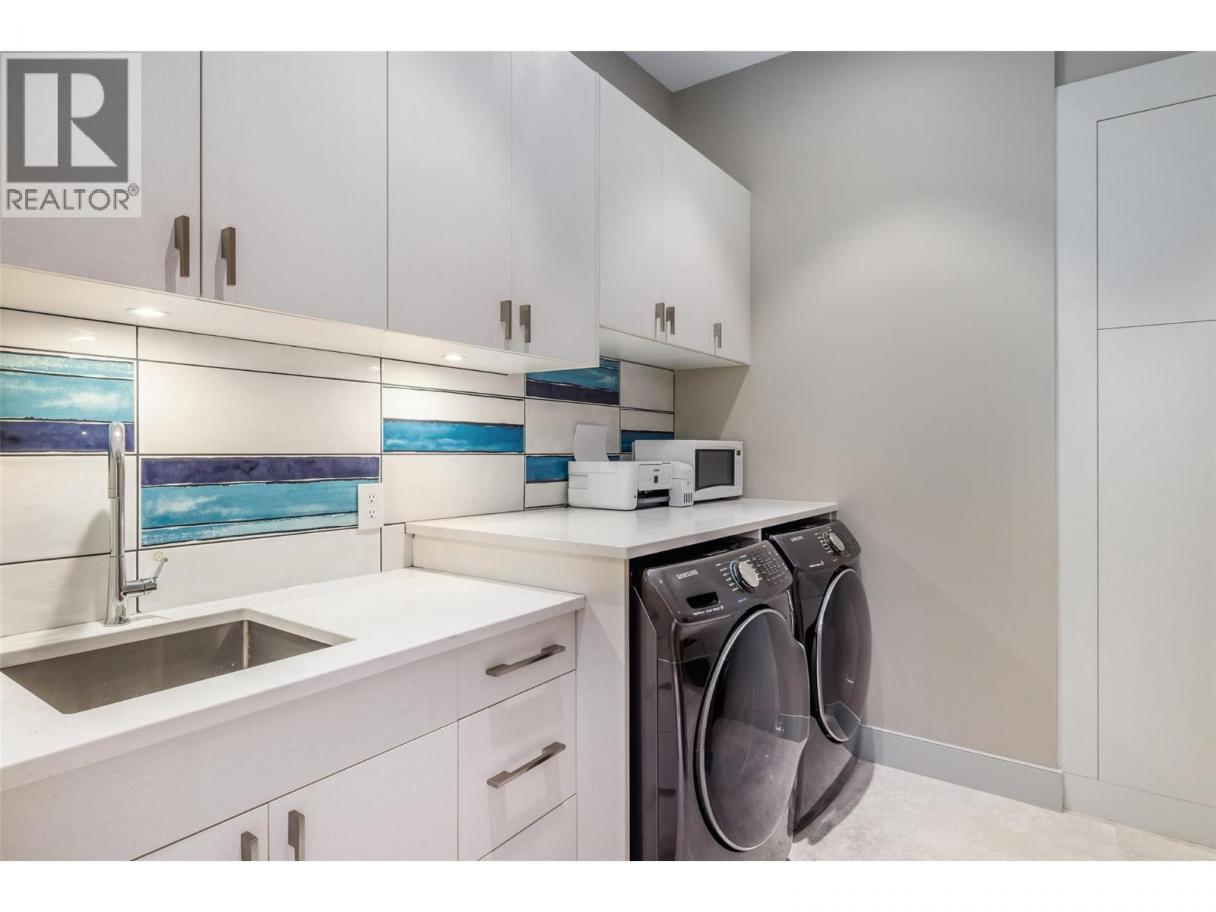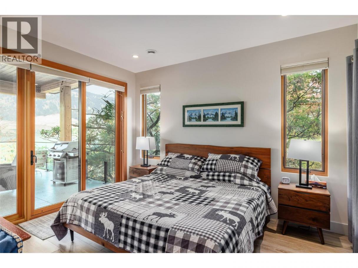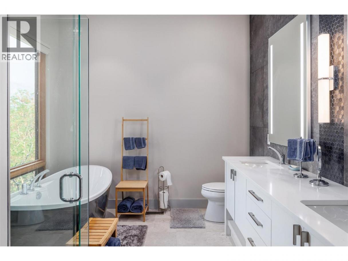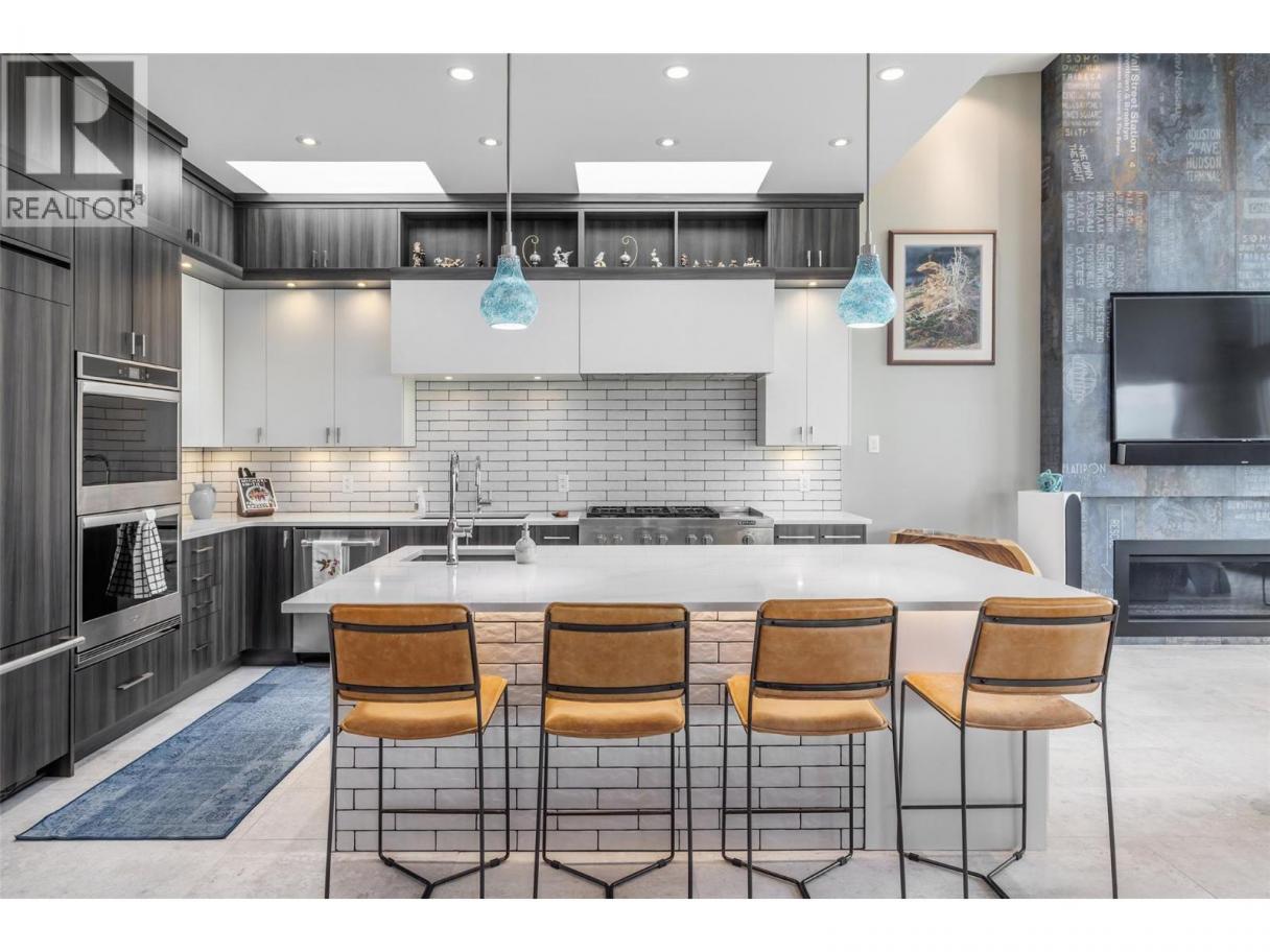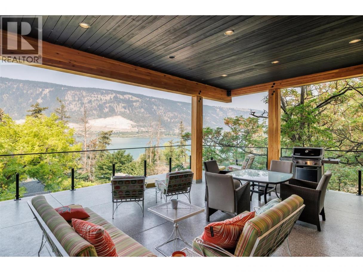 Stunning lakeside living just steps from Kalamalka and Wood Lake in Lake Country. Built in 2021, this contemporary home offers exceptional upgrades and breathtaking lake views throughout. The open-concept main living area features soaring windows and a gas fireplace with a custom tiled feature wall. Enjoy approximately 1,000 sq. ft. of covered deck space with epoxy coating, glass railings, an outdoor kitchen, and a natural gas fire-table—perfect for year-round entertaining with unobstructed views of Kal Lake. The chef’s kitchen includes double skylights, wall ovens, a gas range, and custom two-toned cabinetry. The main-floor primary suite offers a walk-in closet and luxurious 5-piece ensuite with lake-view soaker tub and dual sinks. A second bedroom or office and powder room complete the main level. Downstairs features a one-bedroom in-law suite boasting lake views, plus an additional bedroom and flexible bonus space ideal for a fifth bedroom, media room, or gym. In-floor heat roughed in, epoxy-coated decks and garage, Control-4 smart home system, and a mudroom with garage access complete this thoughtfully designed home. A rare blend of modern luxury and lakeside lifestyle. (id:6769)