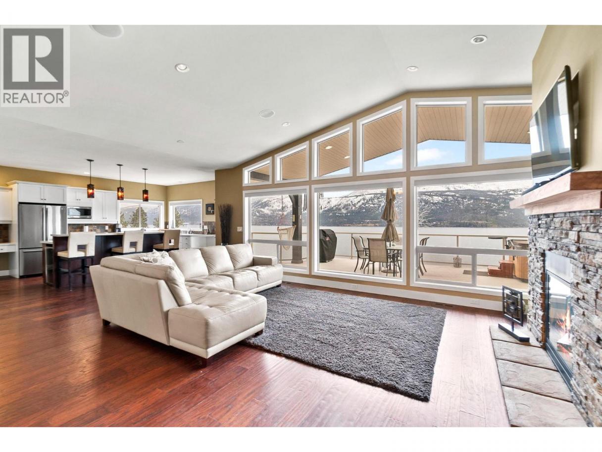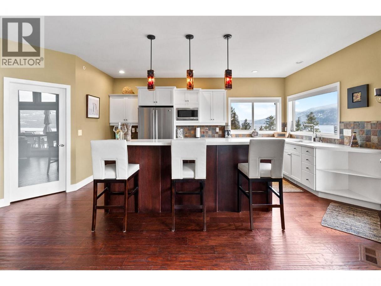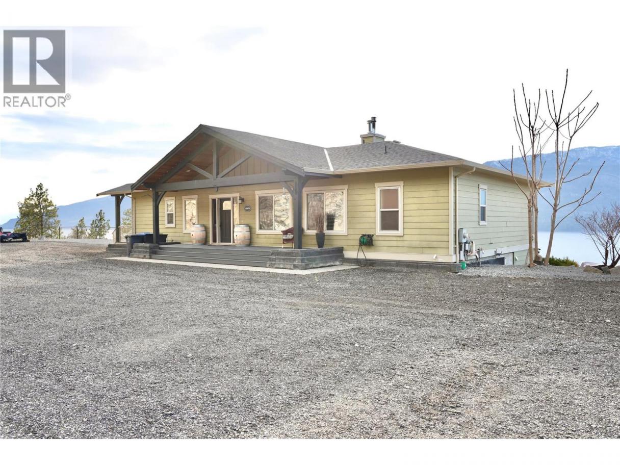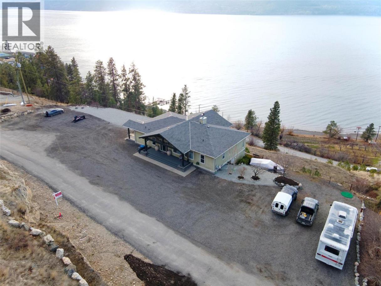 This custom built home is perched on a private 1.9-acre lot with panoramic views of Lake Okanagan. The open-concept main floor features slate & hardwood flooring, vaulted ceilings, & a floor-to-ceiling fireplace, w/large windows framing stunning lake views. The kitchen is equipped with Silestone countertops, spacious walk-in pantry, & a mudroom/laundry area w/ a convenient half bath. Heated floors run throughout the main level, & a 585 sq. ft. deck w/ a hot tub allows you to soak in the scenery. The primary suite offers private deck access, a walk-in closet, & a spa-like ensuite with double sinks. Another full bdrm, bthrm with access to the deck & a flexible room on the main floor serving as a bdrm, den, or dining rm. Lower level also has radiant in-floor heating, family rm, bar area, theatre rm, additional bdrm, full bthrm & a 1-bedroom in-law suite w/ separate entrance/parking. The private road is slated to be paved this spring & RV parking w/ electrical & sewer dump already in place. A lower building pad is ready for a secondary suite or shop, with engineered fill meeting load-bearing and compaction standards. Pad can be extended 30 ft wider, w/ engineered retaining wall drawings already completed. A new pull-in access has been started at the bottom of the property, with permit in place for a culvert for access from Carrs Landing Rd. This property is on city water w/ additional functional Well which is ideal for outside irrigation. Your piece of paradise awaits! (id:6769)