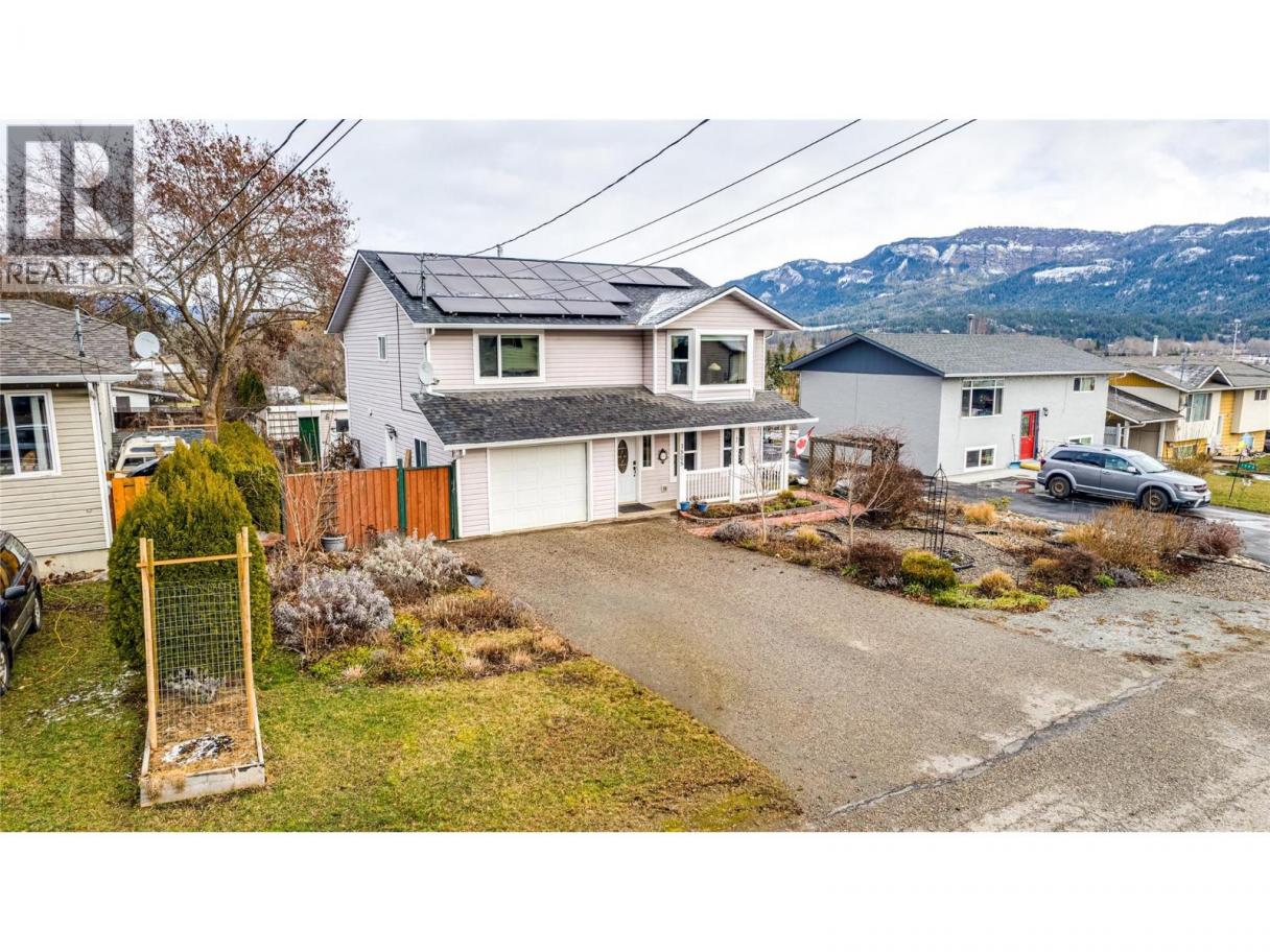 Welcome to your perfect family home in the heart of Enderby! Located in one of Enderby’s most desirable and welcoming neighbourhoods, this well-cared-for 4 bedroom, 3 bathroom home offers beautiful views of the Enderby Cliffs and a quiet, family-friendly setting within walking distance to schools, parks, downtown, and amenities. The main level includes a bright living and dining area with cozy natural gas fireplace, three bedrooms, and an eat-in kitchen with patio doors to a deck overlooking lush backyard gardens, surrounding mountains, and valley. The entry level includes a fourth bedroom, family room, bathroom/laundry, and access to the garage and lower covered deck—ideal for a rec room, home office, or kids’ hangout. The Sellers have invested approximately $40,000 in energy-efficiency upgrades, including triple-glazed windows, R-50 attic insulation, and a 7 kW grid-tied photovoltaic solar system that generates clean electricity and feeds excess power back to BC Hydro for credits. Additional updates include high-efficiency furnace (2022), central A/C (2024), Poly-B plumbing replaced (2026), and new kitchen appliances (2025) with dishwasher replaced in 2023. The usable yard features mature landscaping, garden boxes, in-ground irrigation, blackberry and raspberry bushes, Coronation grapes, RV parking, and a powered insulated workshop. Move-in ready with thoughtful updates, energy efficiency, and a fantastic Enderby location. (id:6769)