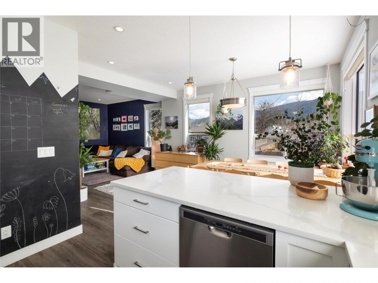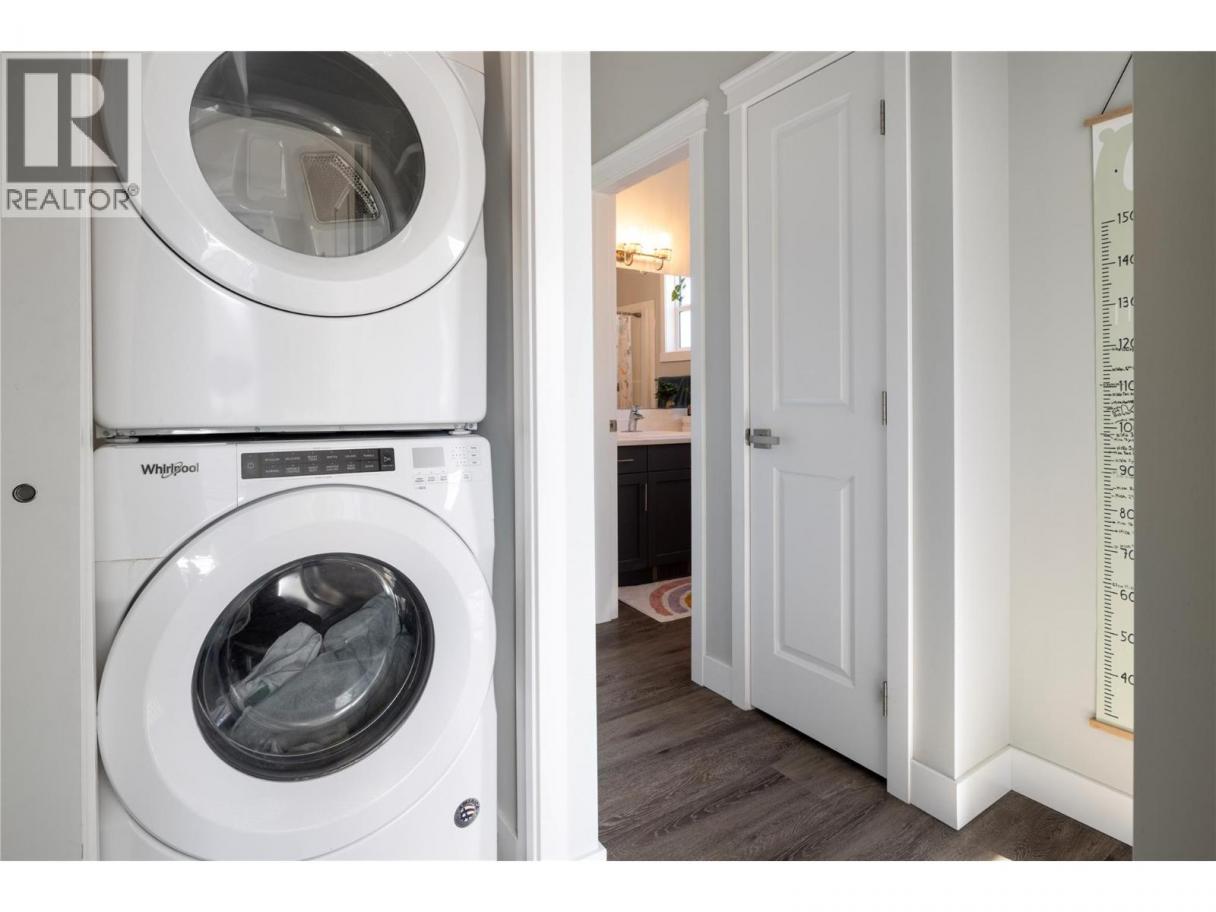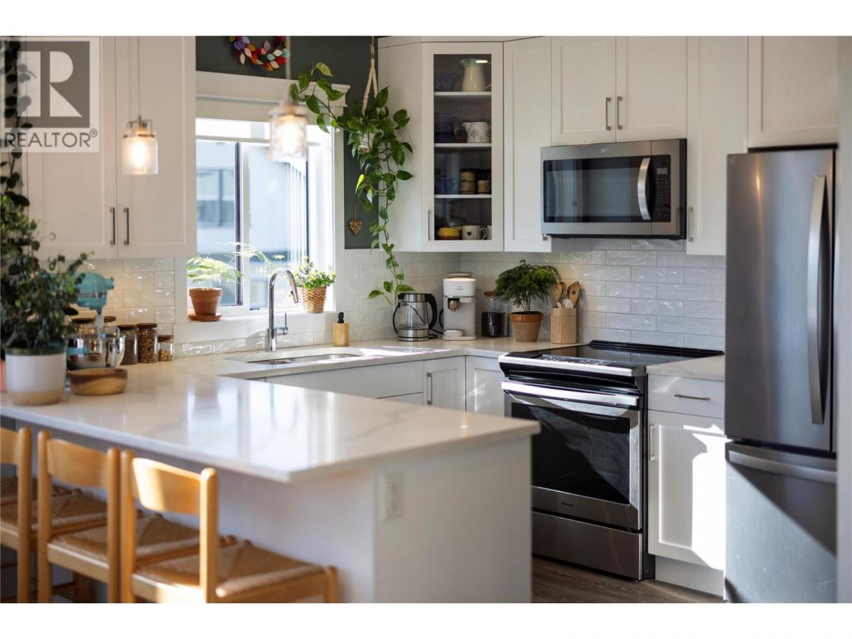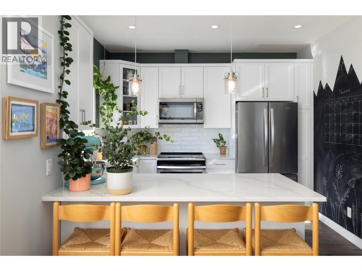 Modern corner unit townhome in the Heart of Harwood - Step into modern living with this beautifully designed three-bedroom townhouse located in the heart of Harwood. Combining contemporary style with in-town convenience, this home offers an excellent opportunity for those seeking low-maintenance, turn-key living, and a short walk to Harwood elementary school. The ground level features the front entry, and a tandem garage with the front portion offering flexibility for a second vehicle, a gym, storage, or hobby space. Upstairs, the main living area is bright and welcoming, filled with natural light and finished with luxury vinyl plank flooring throughout. The modern kitchen showcases sleek quartz countertops, stylish cabinetry, and a breakfast bar, perfect for casual dining or entertaining. The open-concept design flows seamlessly into the living area, with access to a covered balcony—an ideal spot to relax and enjoy the outdoors. The top floor provides privacy with all three bedrooms located on this level. The spacious main bedroom suite features a walk-in closet, and a beautiful ensuite with dual vanities, and a walk-in shower. Two additional bedrooms, a full bathroom, and convenient upper-level laundry complete the layout. A fantastic opportunity to enjoy modern townhouse living in one of Vernon’s most convenient neighbourhoods, close to shopping, schools, parks, and everyday amenities. (id:6769)