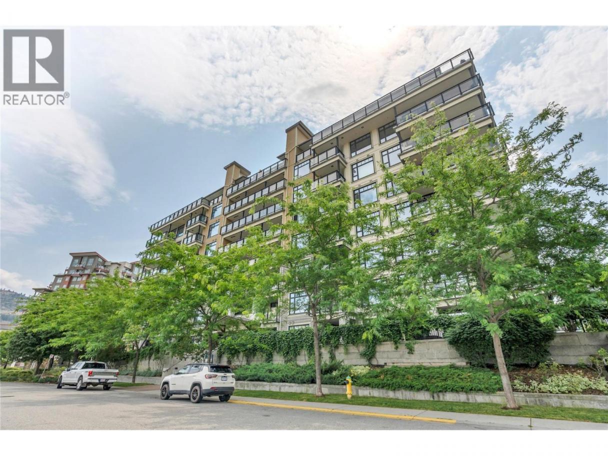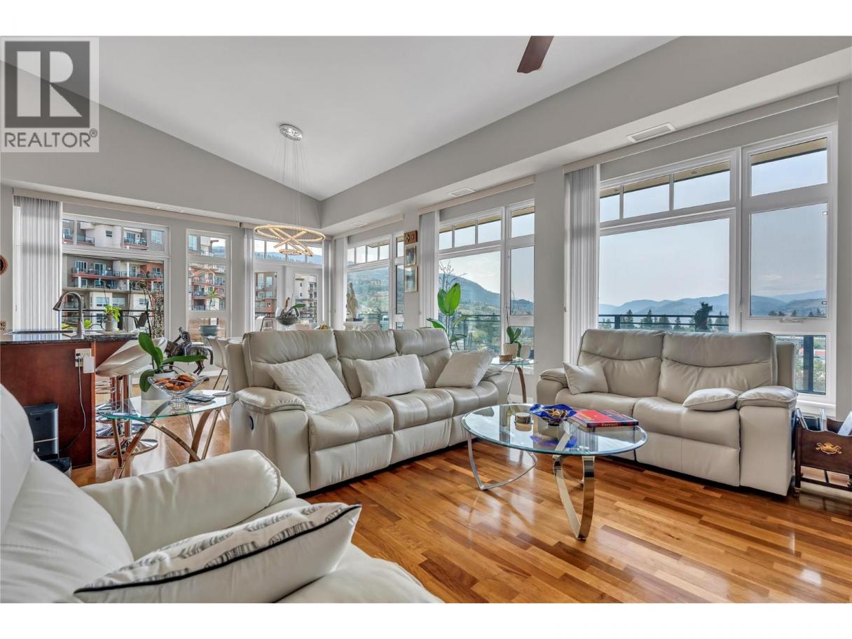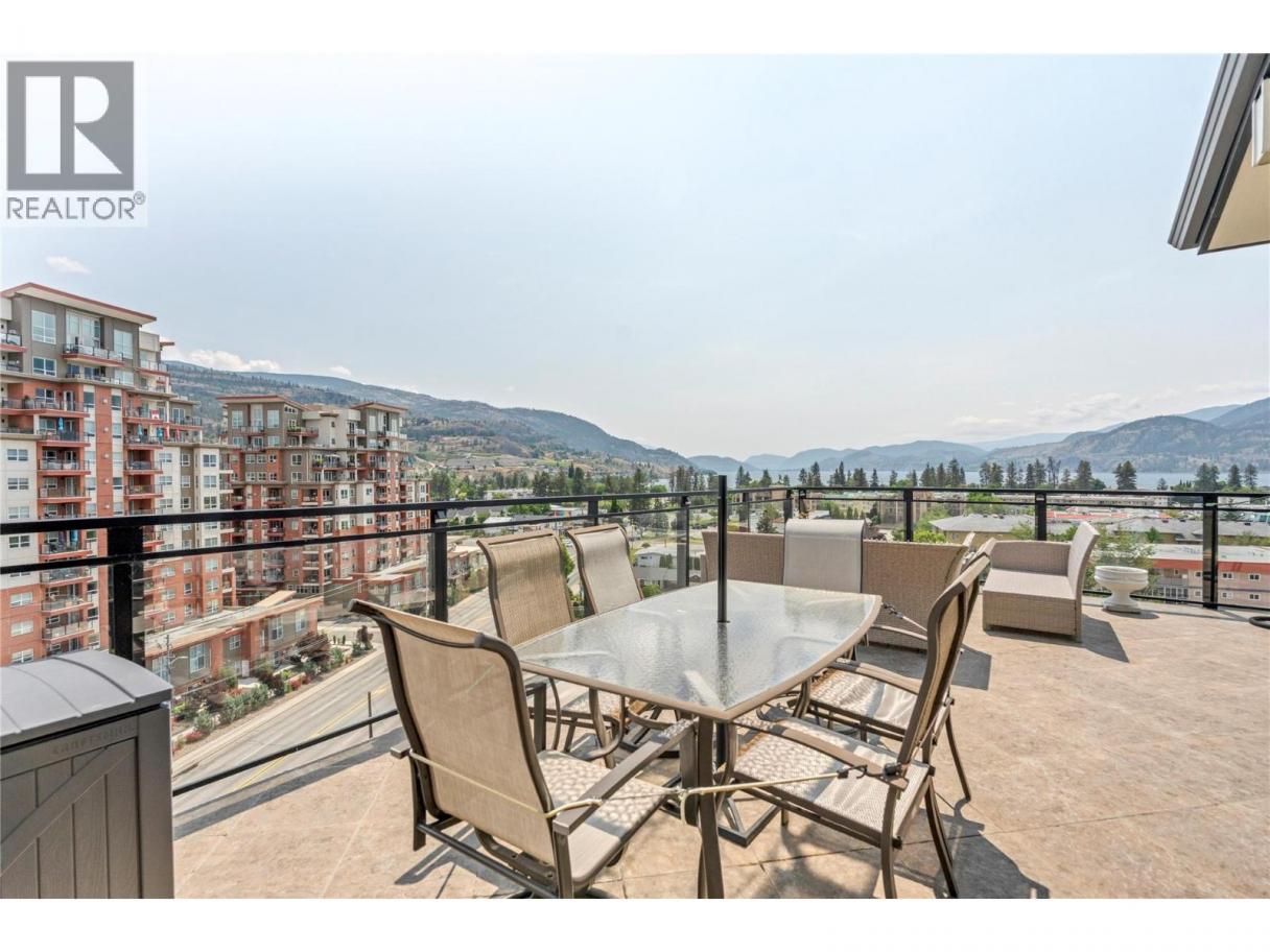 Experience luxury living in this stunning southeast corner penthouse suite at Alysen Place. Designed to impress, this beautifully customized home features floor-to-ceiling windows that capture breathtaking panoramic views of the lake and surrounding mountains. The spacious kitchen is a chef’s dream, equipped with high-end upgrades including a built-in Miele coffee maker, trash compactor, beverage fridge, vacuum kick, and a large island—perfect for entertaining. The living room boasts a soaring 14' vaulted ceiling with hidden in-wall speakers for a sleek, modern finish. Step outside to an expansive 800 sq ft covered wrap around deck, complete with tile flooring, built-in speakers, and a gas BBQ hookup—ideal for enjoying warm Okanagan evenings. Additional highlights include two premium side-by-side parking spots conveniently located near the elevator, and secured storage. The monthly strata fee of $865.64 covers heat, hot water, gas for the BBQ, and building insurance, providing comfort and peace of mind in this exceptional property. (id:6769)