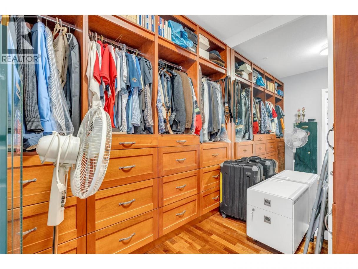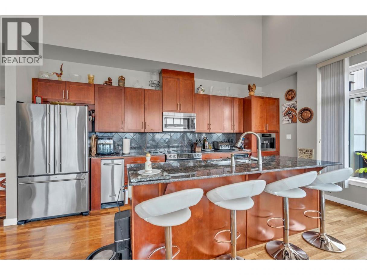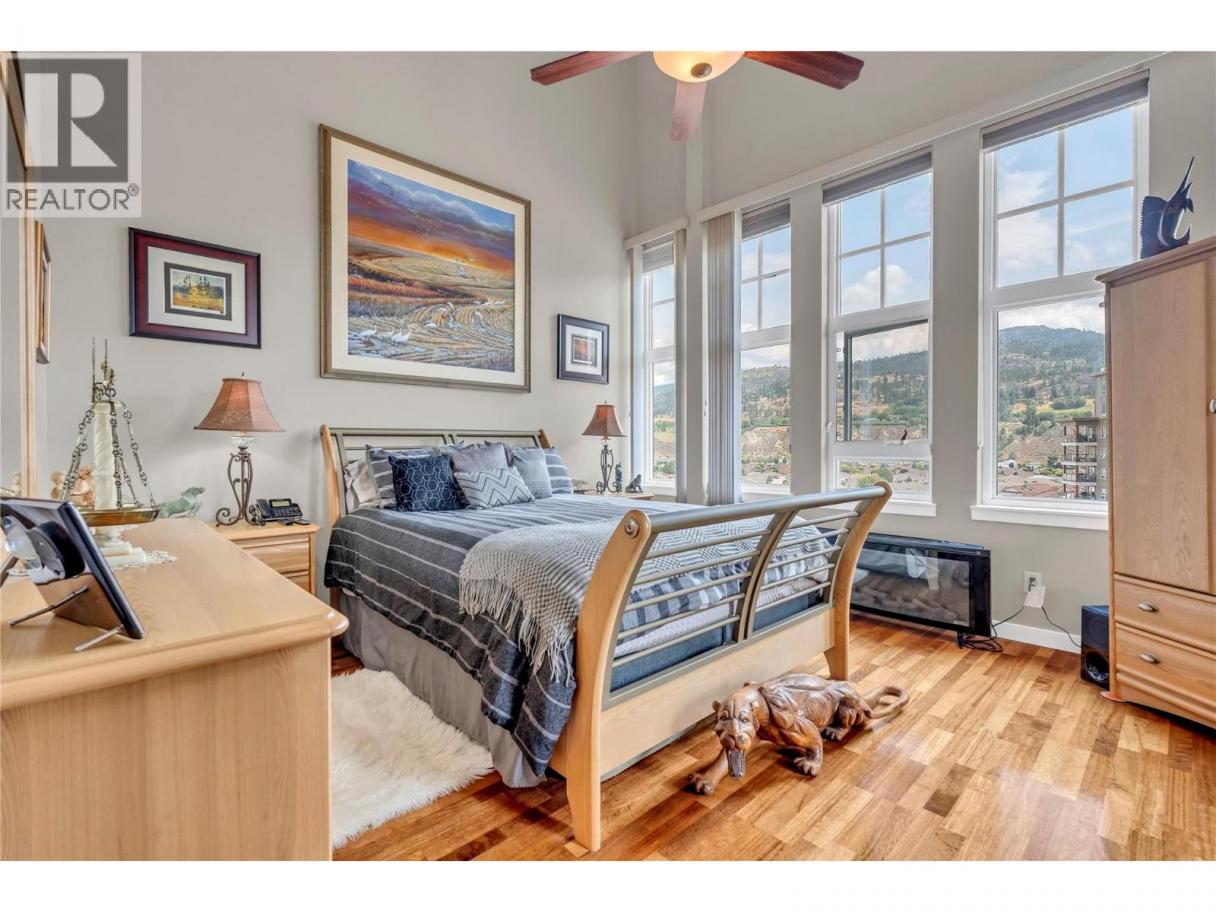 Experience luxury living in this stunning southeast corner penthouse suite at Alysen Place. Designed to impress, this beautifully customized home features floor-to-ceiling windows that capture breathtaking panoramic views of the lake and surrounding mountains. The spacious kitchen is a chef’s dream, equipped with high-end upgrades including a built-in Miele coffee maker, trash compactor, beverage fridge, vacuum kick, and a large island—perfect for entertaining. The living room boasts a soaring 14' vaulted ceiling with hidden in-wall speakers for a sleek, modern finish. Step outside to an expansive 800 sq ft covered wrap around deck, complete with tile flooring, built-in speakers, and a gas BBQ hookup—ideal for enjoying warm Okanagan evenings. Additional highlights include two premium side-by-side parking spots conveniently located near the elevator, and secured storage. The monthly strata fee of $865.64 covers heat, hot water, gas for the BBQ, and building insurance, providing comfort and peace of mind in this exceptional property. (id:6769)