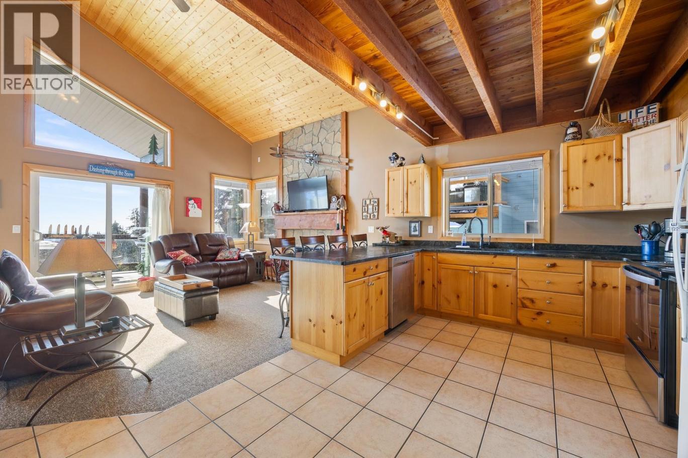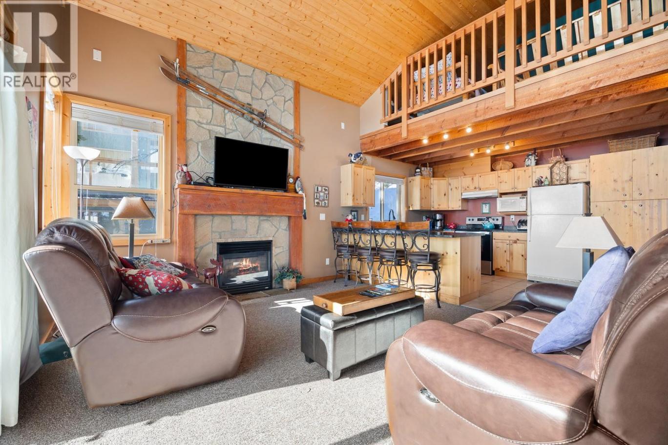 Welcome to Unit A at 5825 Snow Pines Way, the ultimate ski-in retreat at Big White. This top-floor 2 bedroom + huge loft, 2 bathroom condo offers 1,394 sq.ft. of well-designed living space with vaulted ceilings and the ability to ski right to your front door. The open concept living area features a cozy fireplace and charming cottage feel, perfect for unwinding after a day on the mountain. The spacious loft adds incredible flexibility for additional sleeping or entertaining, making it ideal for hosting family and friends. Step outside onto the large balcony and take in stunning panoramic valley views while enjoying your private hot tub. The front entry is set up as a functional boot room with plenty of space to store and dry all your gear after a day on the slopes. There is also a secure ski locker conveniently located just outside your front door. This unit includes two parking stalls, plus a third stall that has been generously cleared and maintained. Located right across from the end of the ski run, you truly get seamless ski-in access. With turn-key potential, making it ready for immediate use or rental. Easy financing available through RBC, please contact Stephanie Camps at 604-761-3979 for more info! Just a short walk or shuttle ride to the village! Beyond skiing, enjoy year-round activities including snowshoeing, tubing, skating, hiking, and mountain biking. Whether you're looking for a personal mountain escape or a strong rental investment, this checks all the boxes. (id:6769)
