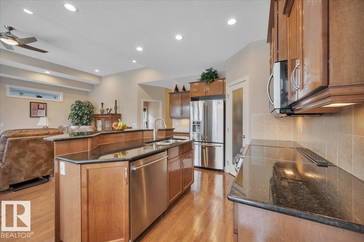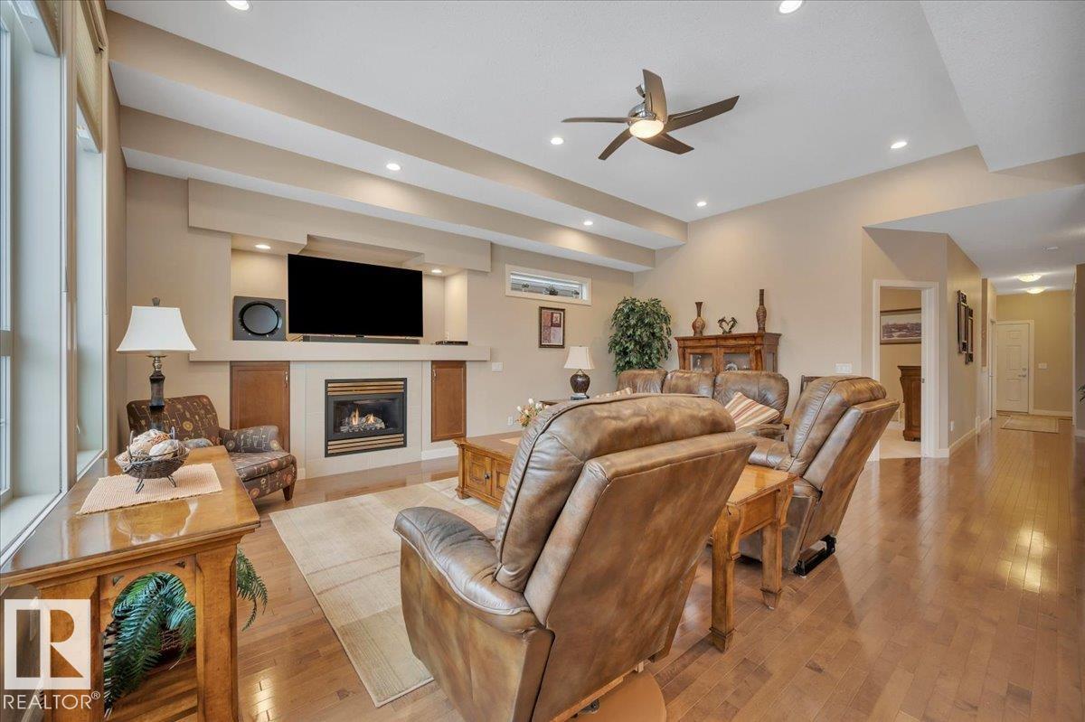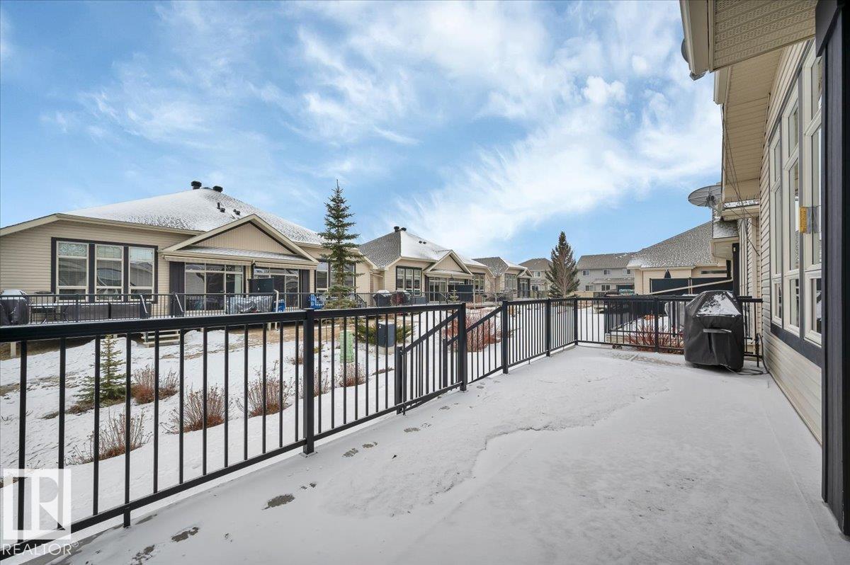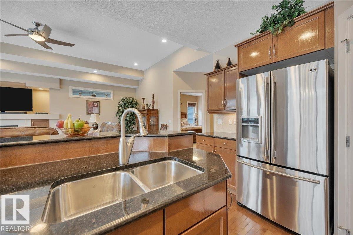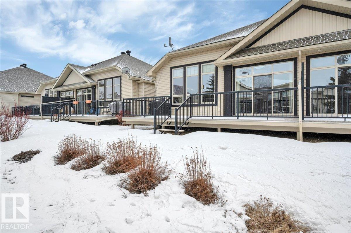 Welcome to BRINDAVAN ESTATES! The perfect retirement community consisting of half duplex bungalows situated in a private setting with only local traffic, adjacent to a large pond which attracts ducks & a variety of birds. This A/C home has an open design with high ceilings & huge windows allowing plenty of natural light. Spacious living/dining room with gas fireplace, hardwood floors, gorgeous kitchen with island, granite counters, stainless steel appliances & walk-in pantry. The den offers privacy with French doors, the primary bedroom has a 5 piece ensuite and walk-in closet. Additional guest bathroom & laundry room complete the main floor. Excellent basement development perfect for out of town guests with two bedrooms, 4 pce bath, big recreation area with second gas fireplace, wet bar & fridge plus a hobby room & plenty of storage. In summer enjoy BBQs on the large deck & take leisurely walks on the trails nearby. Quick access to shopping & Anthony Henday Dr. You'll love the easy lifestyle here! (id:6769)