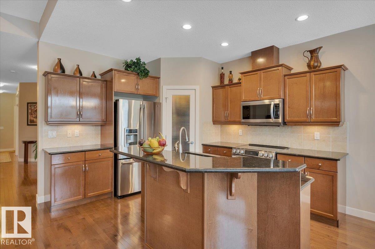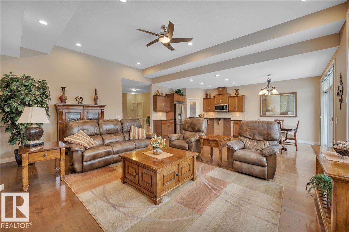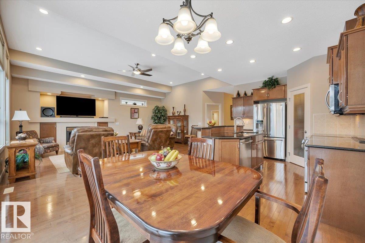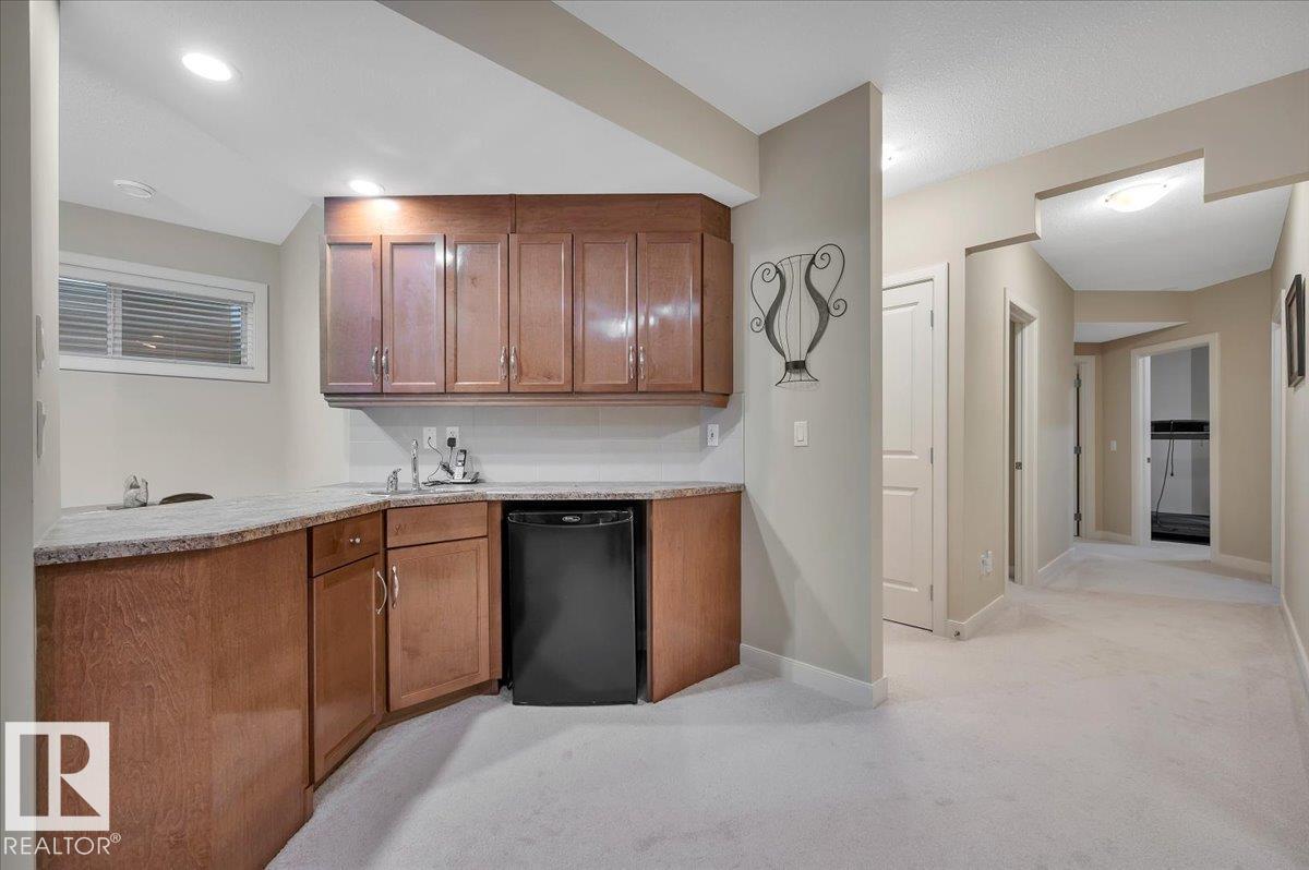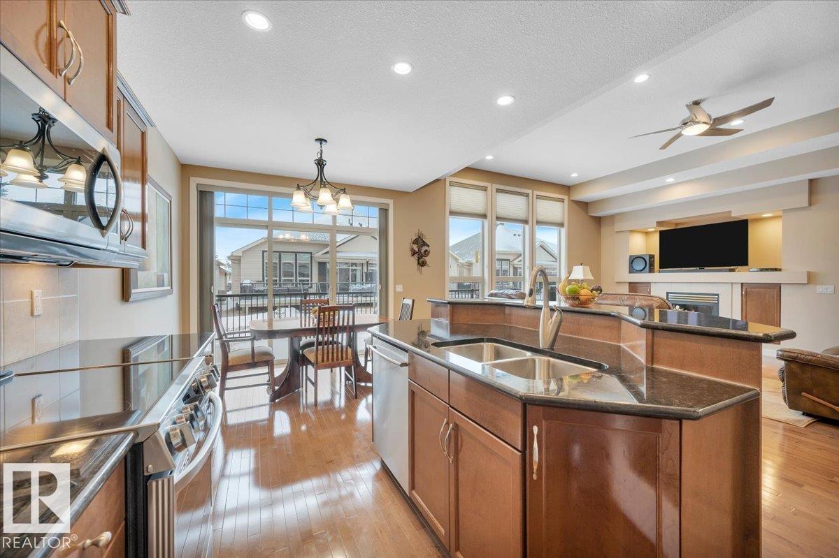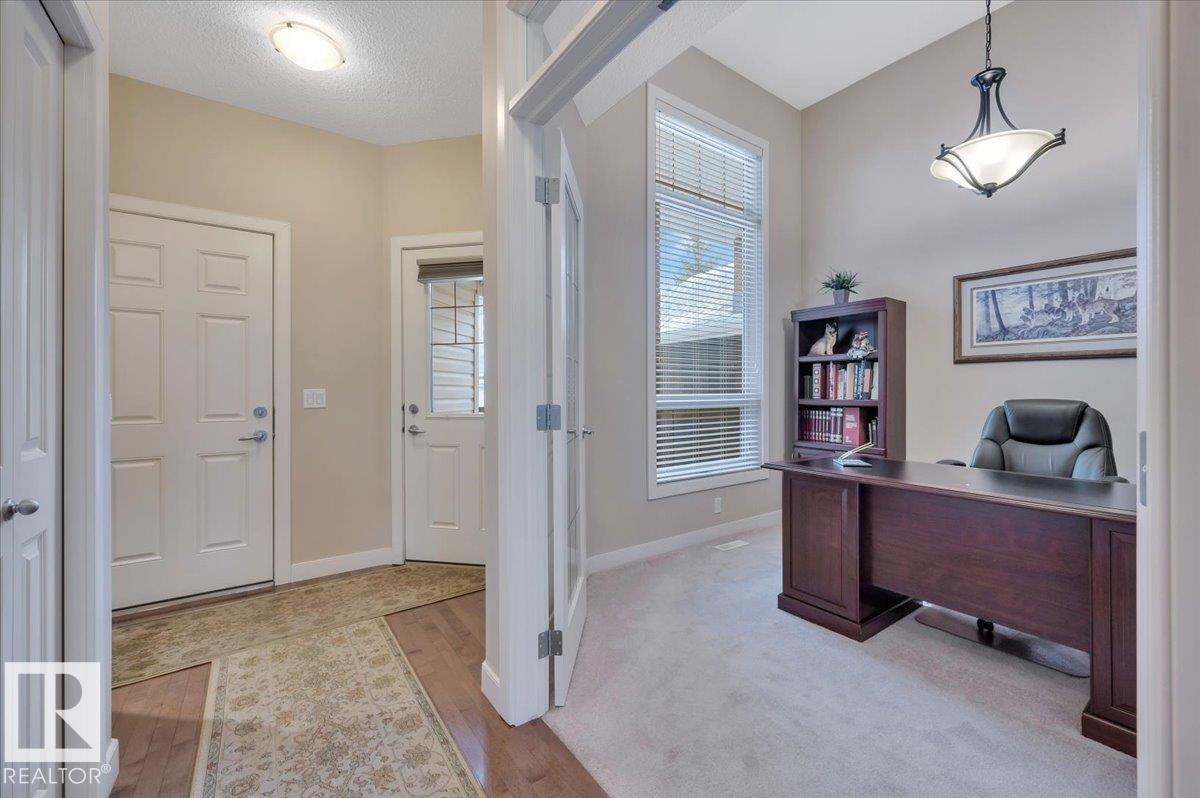 Welcome to BRINDAVAN ESTATES! The perfect retirement community consisting of half duplex bungalows situated in a private setting with only local traffic, adjacent to a large pond which attracts ducks & a variety of birds. This A/C home has an open design with high ceilings & huge windows allowing plenty of natural light. Spacious living/dining room with gas fireplace, hardwood floors, gorgeous kitchen with island, granite counters, stainless steel appliances & walk-in pantry. The den offers privacy with French doors, the primary bedroom has a 5 piece ensuite and walk-in closet. Additional guest bathroom & laundry room complete the main floor. Excellent basement development perfect for out of town guests with two bedrooms, 4 pce bath, big recreation area with second gas fireplace, wet bar & fridge plus a hobby room & plenty of storage. In summer enjoy BBQs on the large deck & take leisurely walks on the trails nearby. Quick access to shopping & Anthony Henday Dr. You'll love the easy lifestyle here! (id:6769)