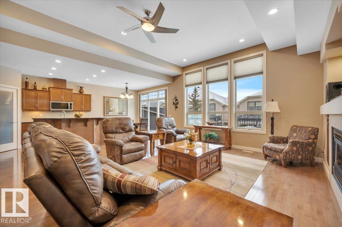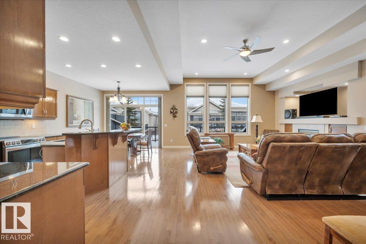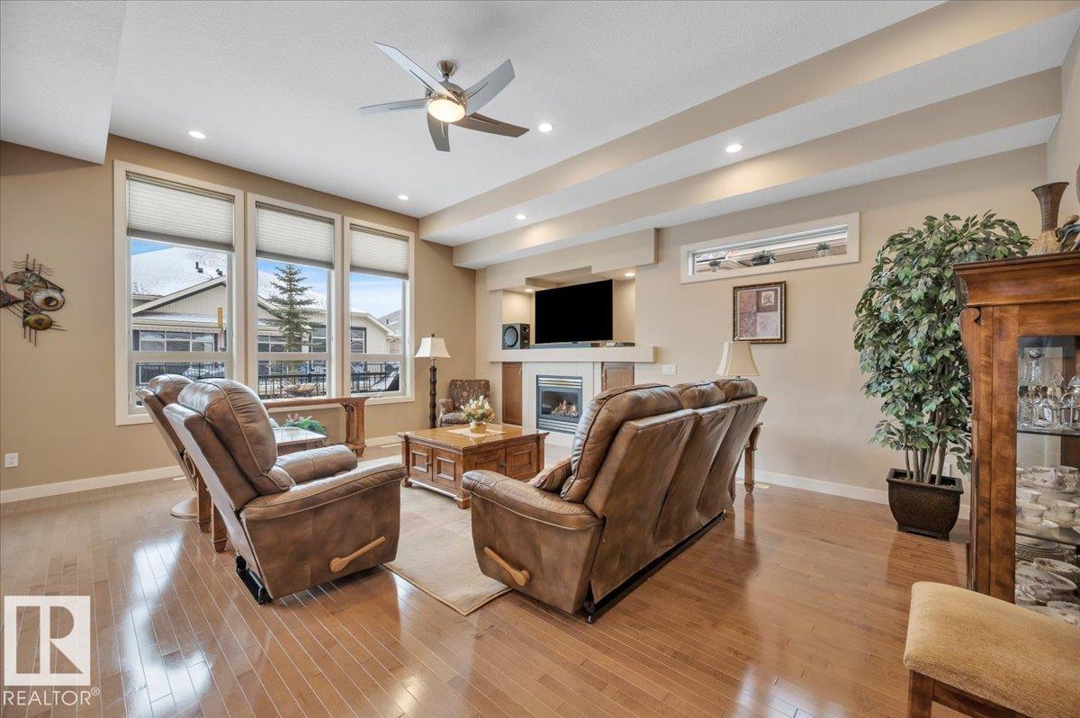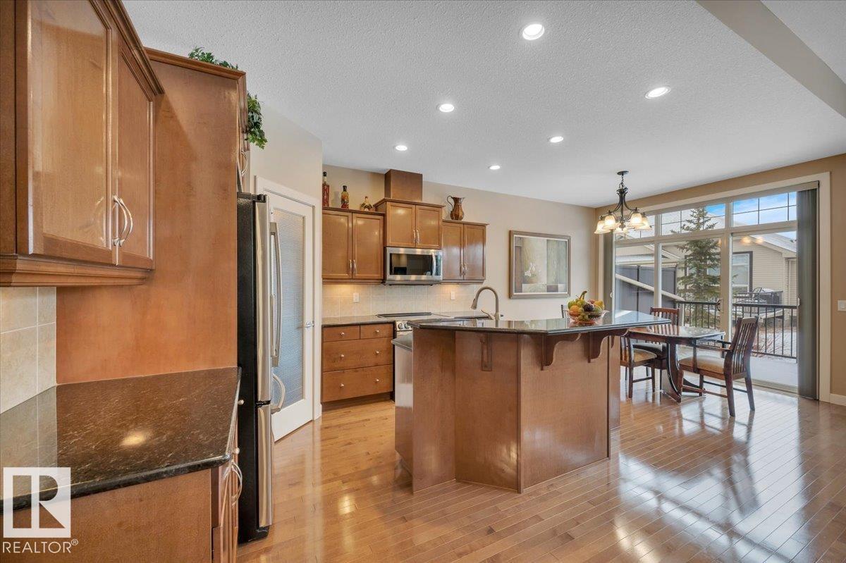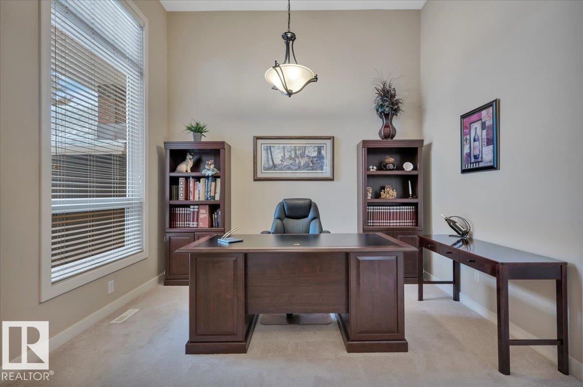 Welcome to BRINDAVAN ESTATES! The perfect retirement community consisting of half duplex bungalows situated in a private setting with only local traffic, adjacent to a large pond which attracts ducks & a variety of birds. This A/C home has an open design with high ceilings & huge windows allowing plenty of natural light. Spacious living/dining room with gas fireplace, hardwood floors, gorgeous kitchen with island, granite counters, stainless steel appliances & walk-in pantry. The den offers privacy with French doors, the primary bedroom has a 5 piece ensuite and walk-in closet. Additional guest bathroom & laundry room complete the main floor. Excellent basement development perfect for out of town guests with two bedrooms, 4 pce bath, big recreation area with second gas fireplace, wet bar & fridge plus a hobby room & plenty of storage. In summer enjoy BBQs on the large deck & take leisurely walks on the trails nearby. Quick access to shopping & Anthony Henday Dr. You'll love the easy lifestyle here! (id:6769)