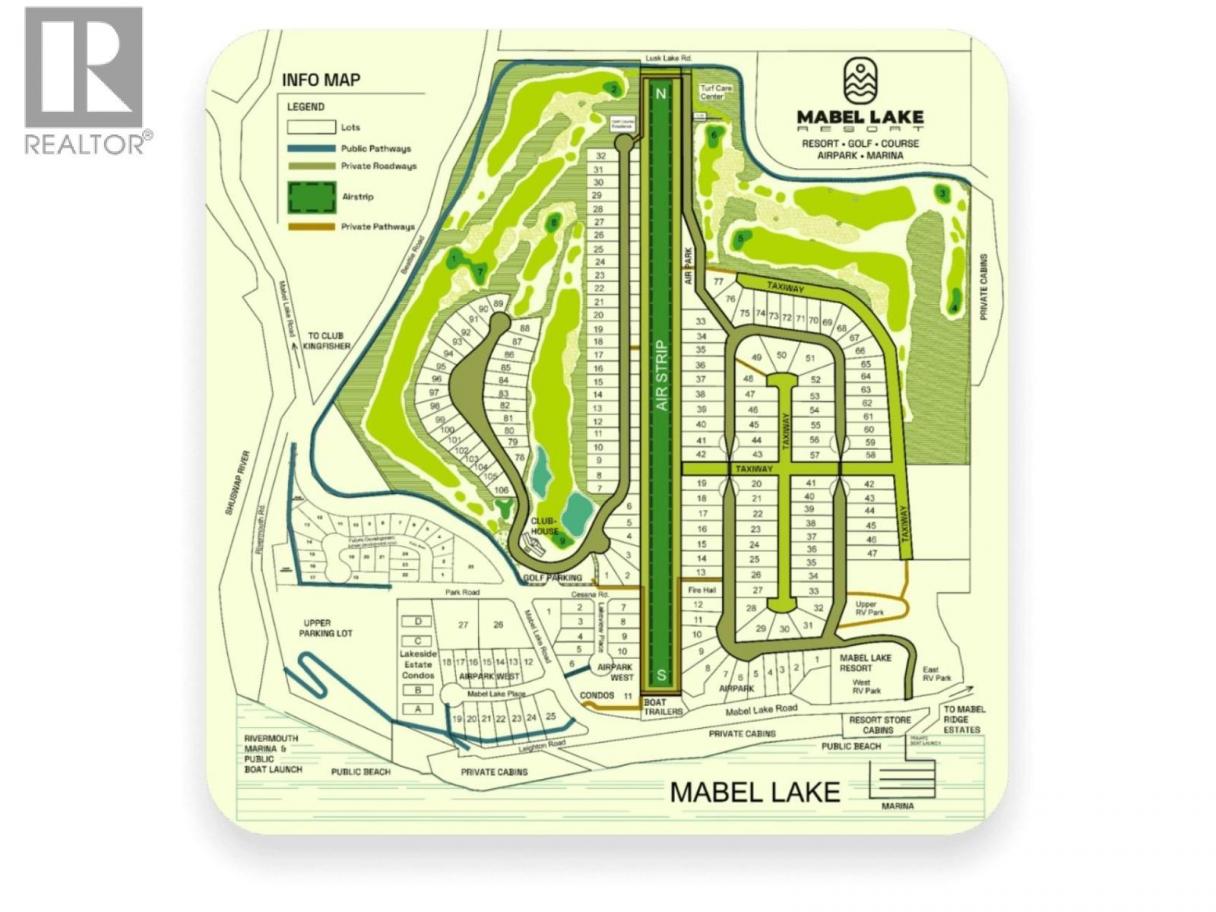 One of the last full sized building lots backing on to the 9th fairway of the Mabel Lake Golf Course, beautifully landscaped. There are 2 separate water/power/septic RV hookups on the lot, as well as a small garden shed & a custom steel circular fire pit. The lot has been cleared, leveled & filled with crush for easy maintenance should you wish to continue RV living. If that's not for you there is plenty of space to build your dream home. Mabel Lake Resort & Marina is one of BC's premiere family vacation destinations offering a full selection of activities & accommodations-there's even a Pickle Ball Court for extra family fun! The Golf Course is designed & built by Les Furber, a par 36, regulation size 9-hole public golf course, boasting fairways winding through mature forests, rock walls, ponds & paved cart trails nestled between mountain ranges & the seasonal clubhouse to enjoy after a round or enjoy a great meal on the deck overlooking the course. The resort is a year round destination with a walking & cycling trail system & there's fishing abound in pristine Mabel Lake including Lake, Rainbow, Bull Trout & even wild Salmon for a short season & the Kokanee arrive in the hotter summer months. Residents enjoy Snowmobiling during the winter months. The property is a one hour drive from Vernon, 30 minutes from Enderby & 1.5 hours to the Kelowna International airport. Truly a property to be enjoyed by the whole family, year round. Don't delay paradise awaits! (id:6769)