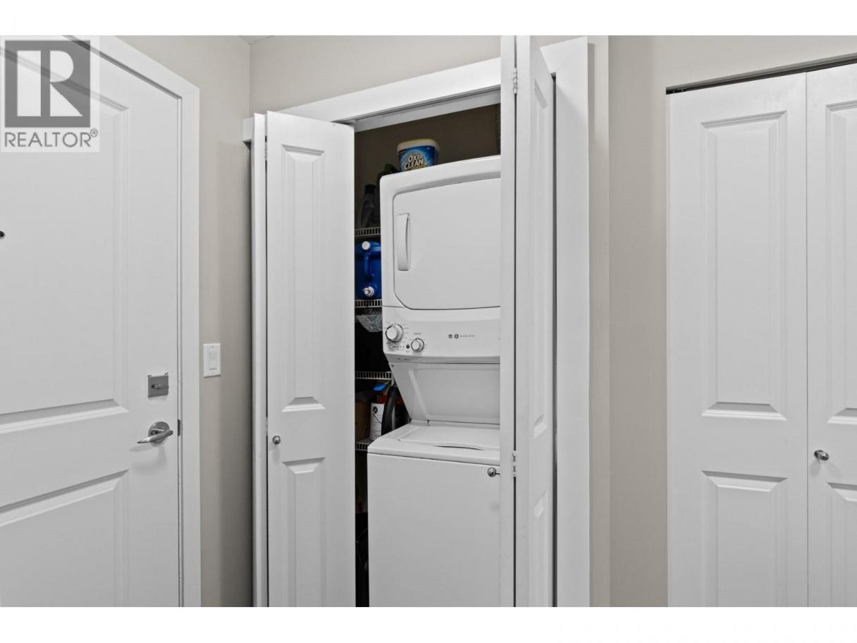 Rare find for this Top floor Corner condo with 2 bedrooms + Den! Stylish ""Espresso"" finishing package & recent paint and carpets in this 1003 sqft of fresh living space. Relax on the spacious covered deck with views of the pool and volleyball court — perfect for recharging or entertaining. Easy maintenance laminate flooring in main living areas is perfect for pet owners. Open-concept kitchen boasts granite countertops and tile backsplash. The split-bedroom layout provides ideal privacy for roommates living together. The large Primary suite features a walk-in closet and 4-piece ensuite, while the second bedroom is located next to the main bath. A convenient den/office is located near the front entrance. The washer and dryer were upgraded to full size for ease of washing bedding/comforters and the laundry space was professionally finished. Enjoy your wall-mounted air conditioning unit during those warm Okanagan days & evenings. The current Tenants would consider staying for any interested Investors. 1 secure underground parking stall and bike storage available. The Verve is a sought-after complex with outdoor pool, volleyball court, picnic and BBQ areas and a fully fenced dog park. Pet-friendly (up to 2 dogs or 2 cats, or 1 of each), no age restrictions, and rentals allowed. Centrally located close to downtown Kelowna, UBCO, public transit, shopping, restaurants, and schools. Enjoy nearby golf courses, beaches, and the beautiful Brandt’s Creek linear park trail. (id:6769)