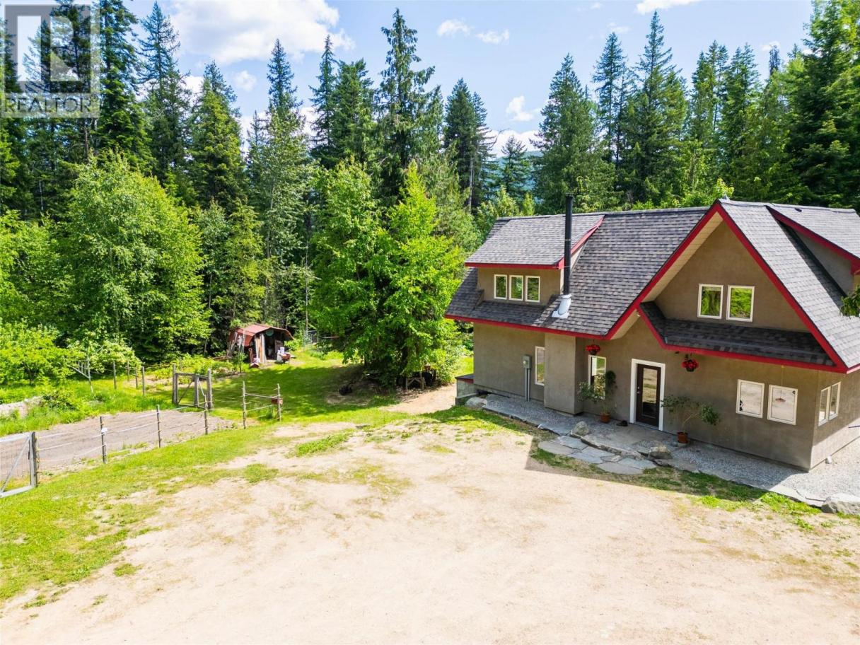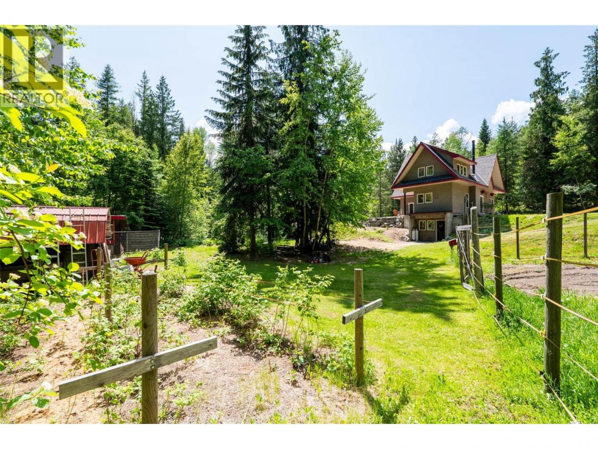 Nestled on 4.14 acres of meticulously firesmarted forested land in the serene community of Bonnington, this well-crafted three-bedroom, two-bathroom home offers a tranquil retreat born from a love of nature and designed for comfortable family living. Built by the current owners, every detail reflects deep care and attention, making it a truly unique and inviting space. The property boasts an expansive, fully electric-fenced garden area—a gardener's paradise brimming with fruit trees and the promise of delicious harvests throughout the seasons. A dedicated chicken coop adds the joy of fresh eggs, while the back patio provides a perfect vantage point to overlook the lush garden and tranquil forest, ideal for morning coffee, outdoor meals, or evening gatherings. Inside, the kitchen and dining room are bathed in natural light from ample windows on three sides, creating a bright and airy atmosphere. A beautiful wood-burning fireplace offers cozy warmth and ambiance and, with a vent that moves heat upstairs, supplements the radiant in-floor heat. Beautiful wood doors and windows, and thoughtful construction, are apparent throughout. A new roof was installed in 2025. This property is more than just a house—it’s a lovingly cultivated lifestyle offering peace, privacy, and the joys of rural living. The home and surrounding forest have been carefully managed for wildfire mitigation and offer endless opportunities for exploration, enjoyment, and play—all just 15 minutes from Nelson. (id:6769)