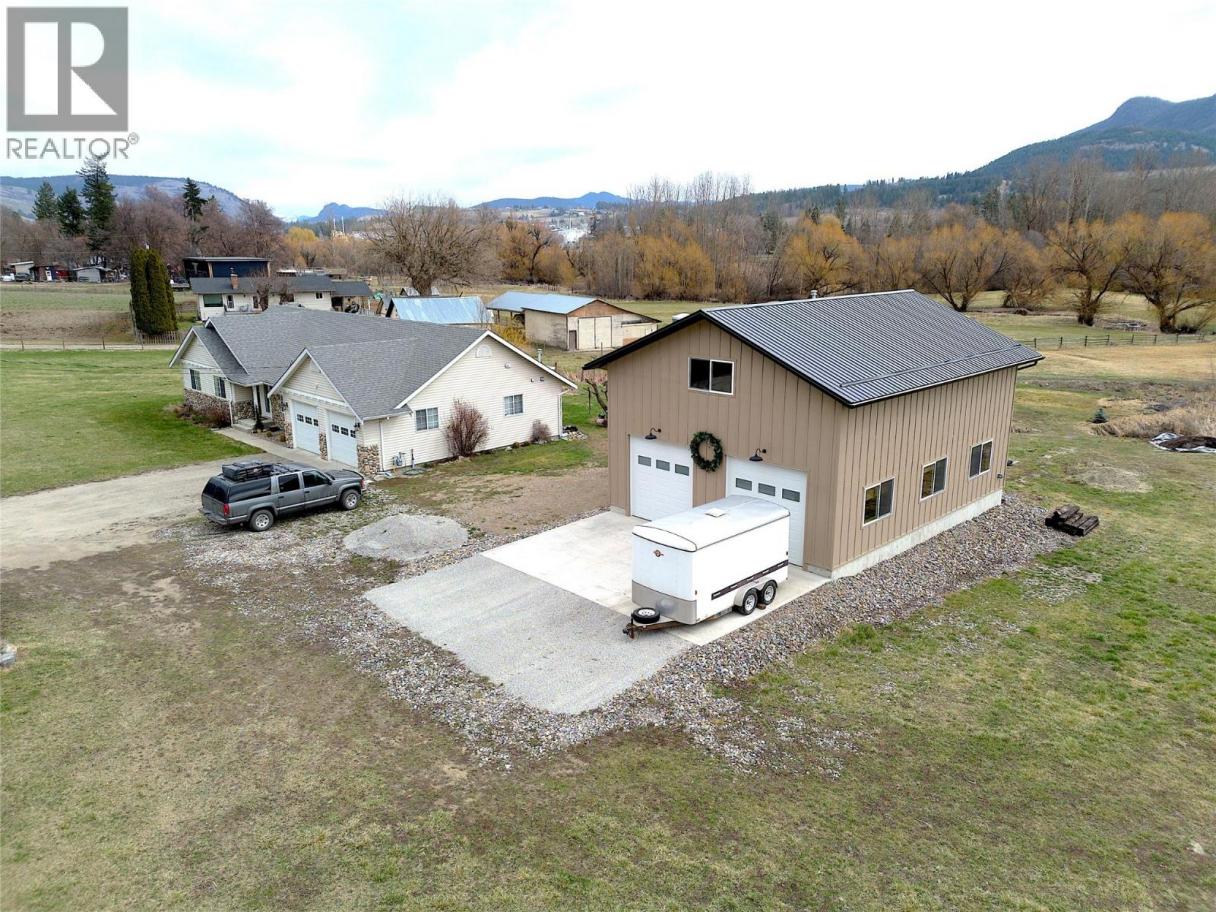 Welcome to your own private slice of country living in Coldstream - an adventure-filled acreage offering the perfect blend of lifestyle, functionality, and future potential. Set on (6.89 acres) a diverse property with lawn, open field, wetlands, mature trees, and the gentle flow of Coldstream Creek winding through, this is a truly special setting just 10 minutes to Vernon or Lumby. The 1,676 sq ft Rancher home (built in 2002) offers 3 bedrooms and 2 bathrooms, including a spacious primary with walk-in closet and 3-piece ensuite. Enjoy a functional kitchen with eat-in bar, dedicated dining area, and living space that opens onto a back deck with glass-covered pergola - perfect for relaxing or entertaining. Major updates include a newer furnace & A/C (3 yrs), roof (~5 yrs), and ALL major appliances (4 yrs). Additional features include a crawl space, roughed-in central vac, hot water recirculation system, natural gas, and an attached 23’ wide double garage with extra space. The impressive newer 40’ x 30’ deluxe shop (built with permits, ~$200K) features 2 oversized side-mounted automatic doors, 150,000 BTU gas heat, and an additional 700 sq ft loft - ideal for hobbies, storage, or future ideas (carriage suite?). With some cross-fencing, ample parking, RV plug, lean-to, firepit area, and bridges crossing the creek, this property offers space, versatility, and a true country lifestyle. Zoned A1 with potential for additional uses including a secondary or carriage suite. (id:6769)