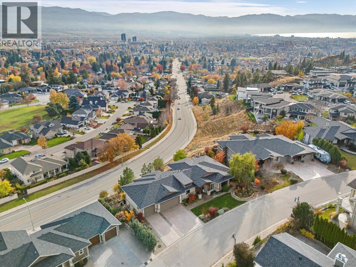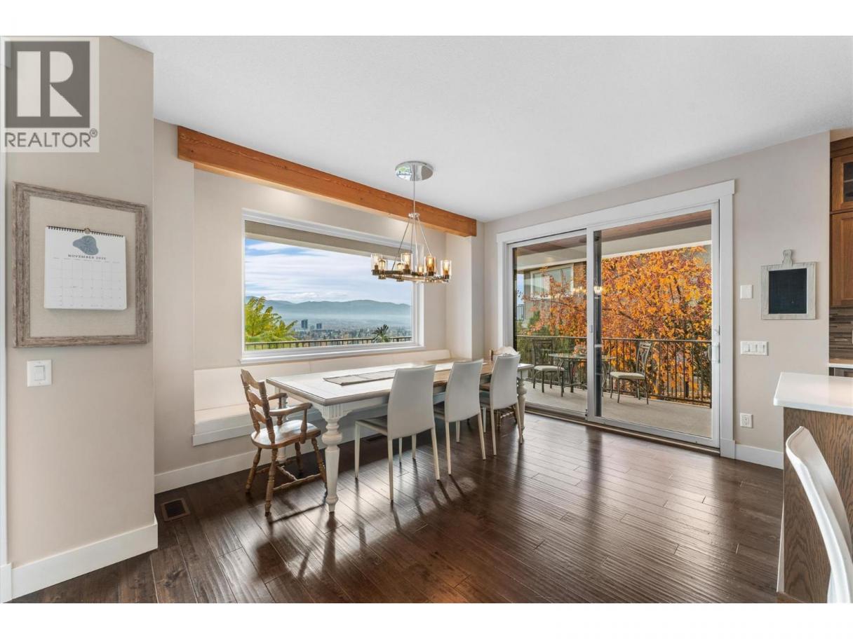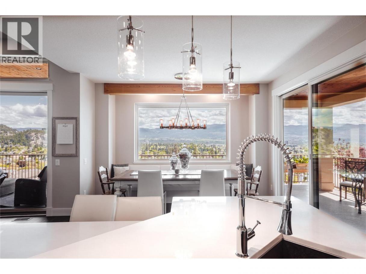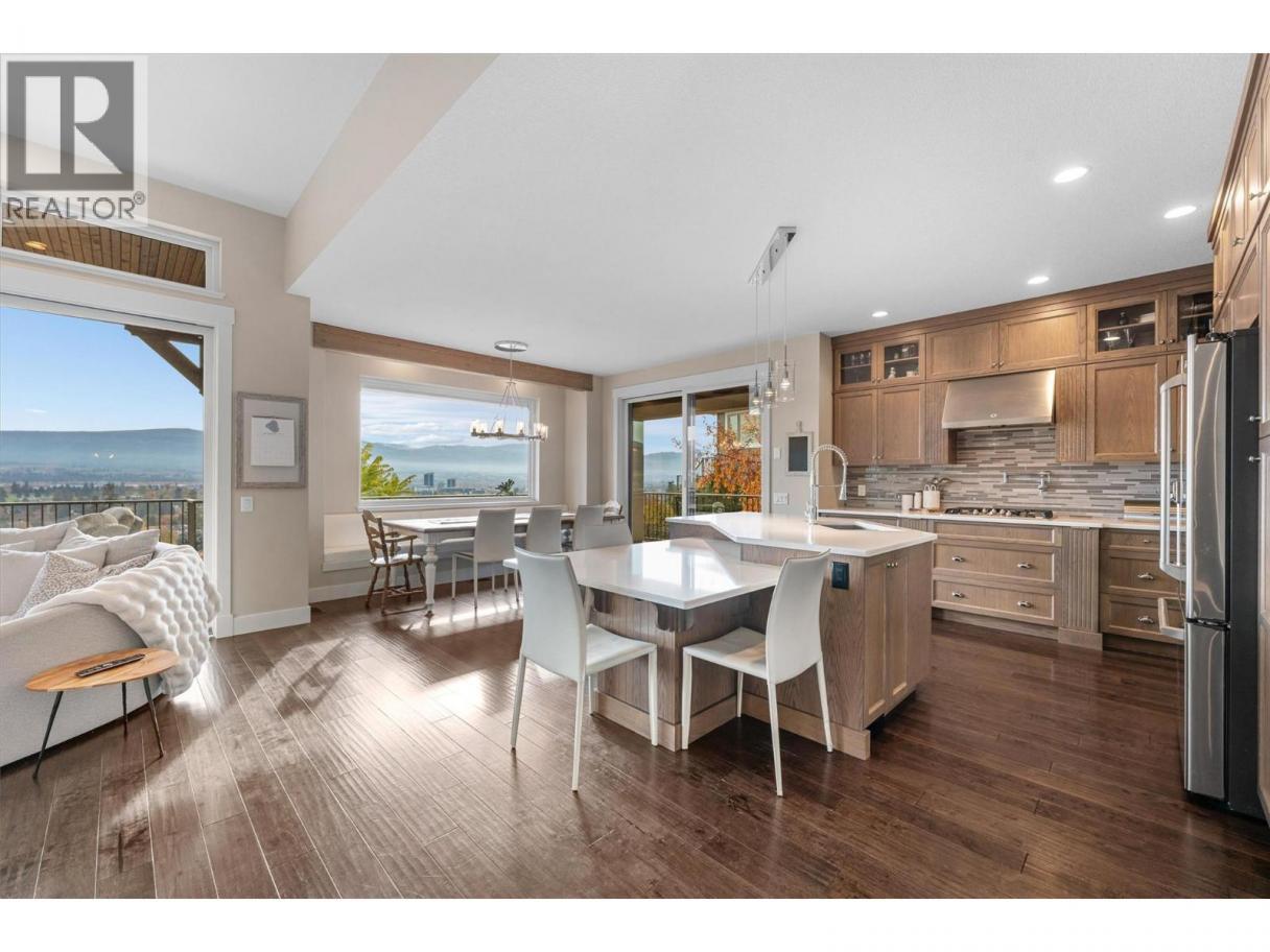 This meticulously crafted walkout rancher offers the best of Okanagan living. A wall of windows frames views of Dilworth Mountain, the city skyline, and Okanagan Lake. The open-concept main level features hardwood floors, 11’ ceilings, and a wraparound sun deck perfect for morning coffee or evening wine. A gas fireplace and dual sliding doors with phantom screens enhance the bright, open feel. The chef’s kitchen is outfitted with GE Cafe appliances, a gas stove with pot filler, quartz counters, and a two-tiered island. Soft-close white oak cabinetry, open shelving, and hidden organizers elevate the functionality. The dining space includes built-in bench seating and access to the deck and BBQ area. The primary suite showcases city views, a spa-inspired ensuite, soaker tub, glass shower, heated tile floors, dual vanities, and a walk-in closet with custom built-ins. A second bedroom or office and powder room round out the main floor. Downstairs offers a bright rec room, wet bar, theater room, two bedrooms, and a 5-piece bath. Outside, enjoy your private oasis: in-ground heated pool, hot tub and a fully fenced yard. Other features include radiant in-floor heating on the lower level, Sonos speakers throughout, Navien instant hot water, triple car garage and multi-zone irrigation. A 1-bed legal suite with private entrance adds flexibility for guests or family. Close to downtown, bus routes and Knox Mountain hiking and biking trails, this home blends comfort, luxury, and location. (id:6769)