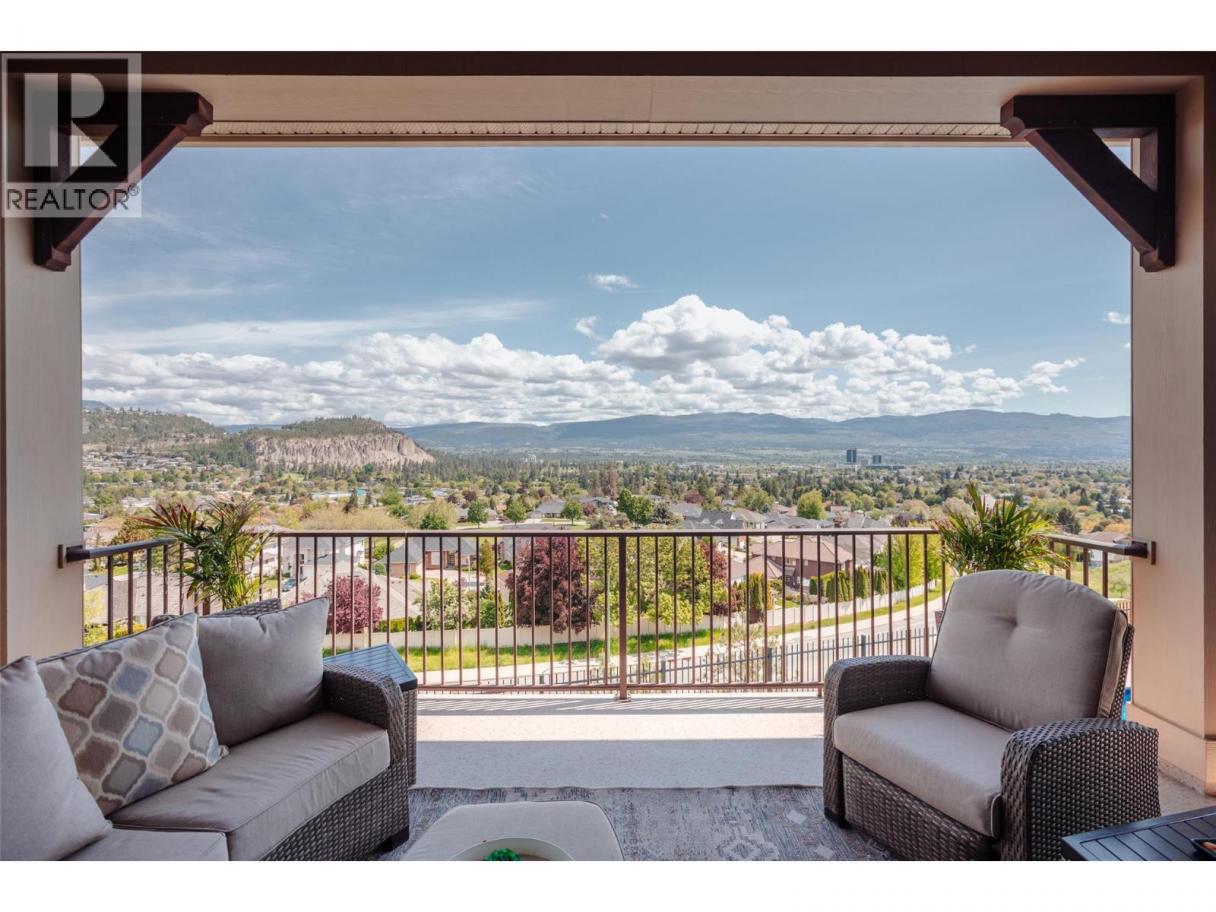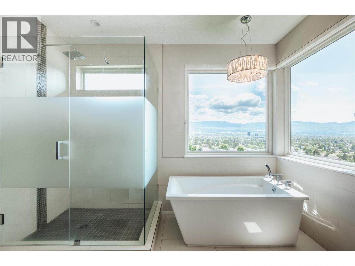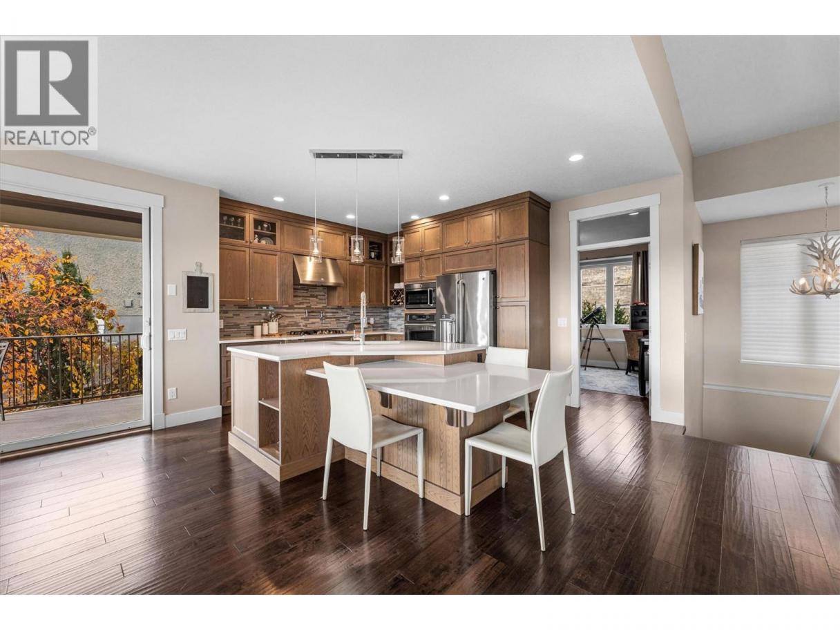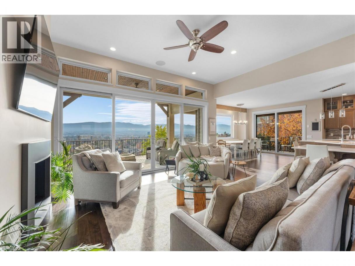This meticulously crafted walkout rancher offers the best of Okanagan living. A wall of windows frames views of Dilworth Mountain, the city skyline, and Okanagan Lake. The open-concept main level features hardwood floors, 11’ ceilings, and a wraparound sun deck perfect for morning coffee or evening wine. A gas fireplace and dual sliding doors with phantom screens enhance the bright, open feel. The chef’s kitchen is outfitted with GE Cafe appliances, a gas stove with pot filler, quartz counters, and a two-tiered island. Soft-close white oak cabinetry, open shelving, and hidden organizers elevate the functionality. The dining space includes built-in bench seating and access to the deck and BBQ area. The primary suite showcases city views, a spa-inspired ensuite, soaker tub, glass shower, heated tile floors, dual vanities, and a walk-in closet with custom built-ins. A second bedroom or office and powder room round out the main floor. Downstairs offers a bright rec room, wet bar, theater room, two bedrooms, and a 5-piece bath. Outside, enjoy your private oasis: in-ground heated pool, hot tub and a fully fenced yard. Other features include radiant in-floor heating on the lower level, Sonos speakers throughout, Navien instant hot water, triple car garage and multi-zone irrigation. A 1-bed legal suite with private entrance adds flexibility for guests or family. Close to downtown, bus routes and Knox Mountain hiking and biking trails, this home blends comfort, luxury, and location. (id:6769)