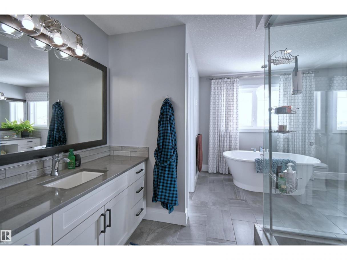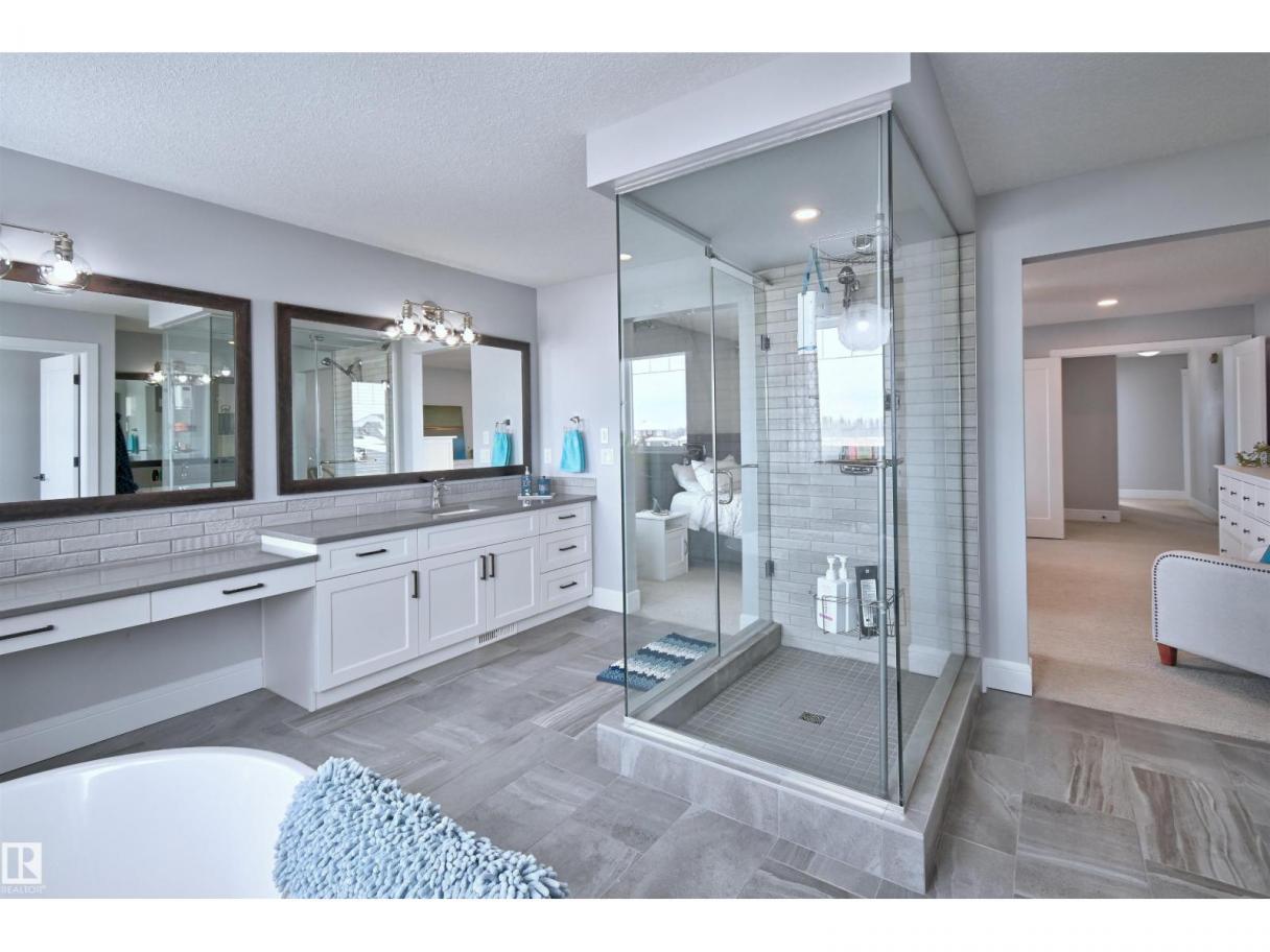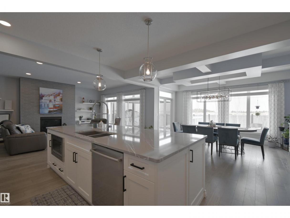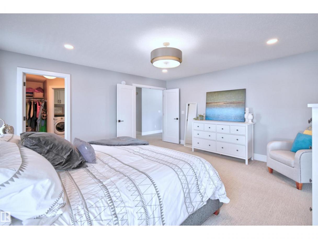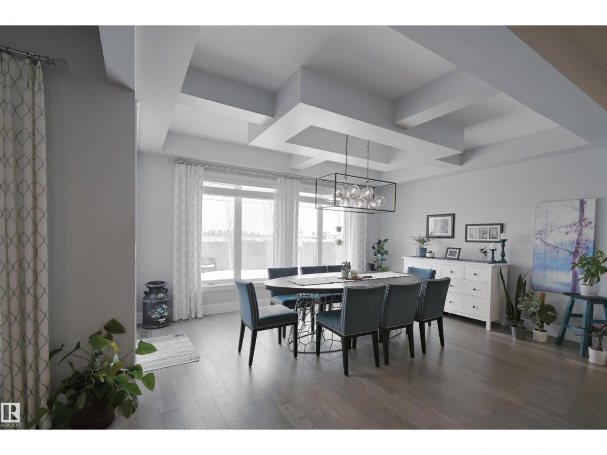 Welcome to Genesis Lake, an exceptional residence combining luxury, function and thoughtful upgrades. This home features a four-car heated garage with convenient pass-through to a private backyard, professionally landscaped beds with concrete curbing, and a composite deck with gazebo for summer entertaining. Inside, enjoy 9-foot ceilings, 8-foot doors, engineered hardwood, central A/C, and a front office overlooking the patio. The gourmet kitchen offers white cabinetry to the ceiling, a massive island, stainless hood, and chevron tile backsplash. Adjoining dining with coffered ceiling opens to a generous eating area. A walk-through pantry,with butler/coffee bar lead to a mudroom with custom shelving. A tiled dog wash with glass door and abundant storage add everyday convenience. Upstairs, a vaulted bonus room, spacious bedrooms with views, and a primary suite with laundry access and a luxurious 5-piece ensuite complete the home. The basement is fully finish & solar power and LED lighting (id:6769)