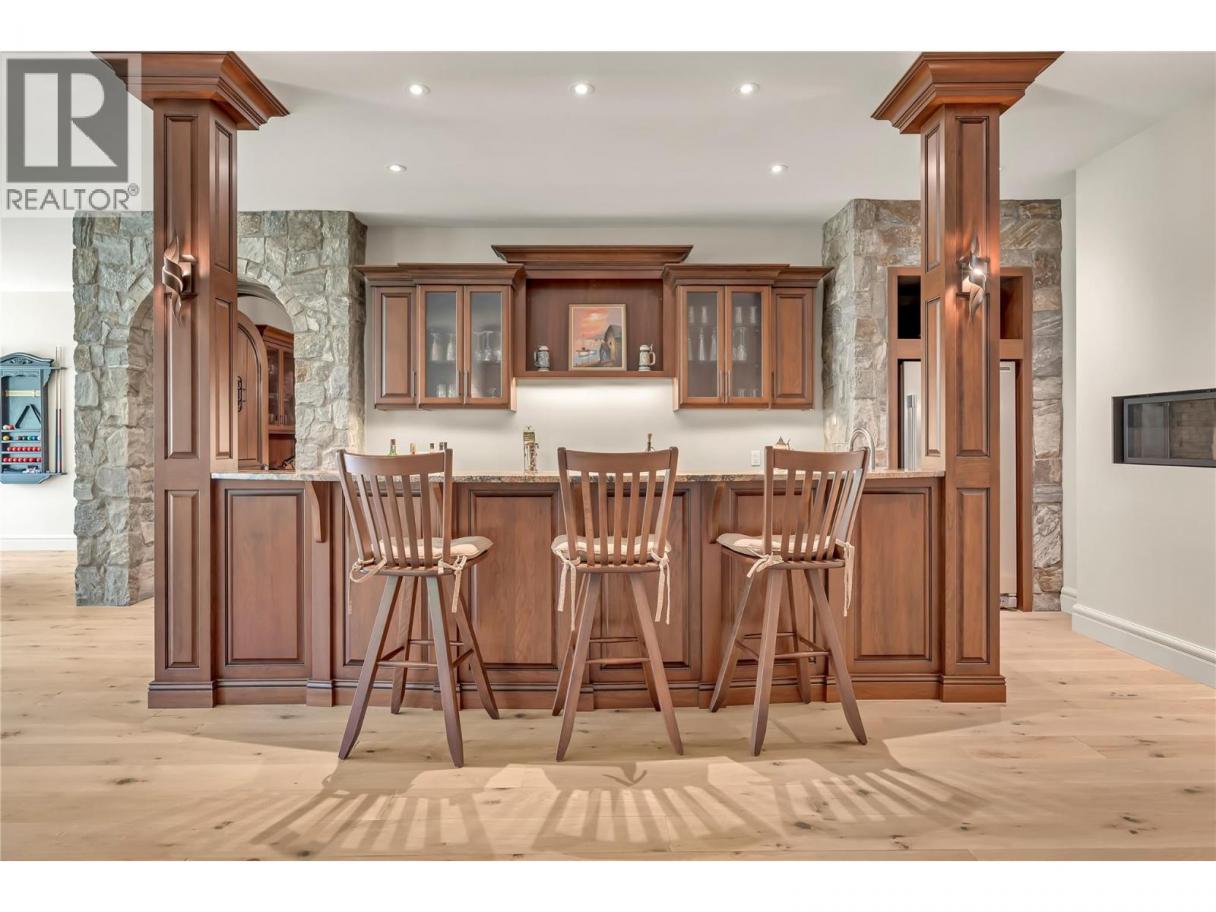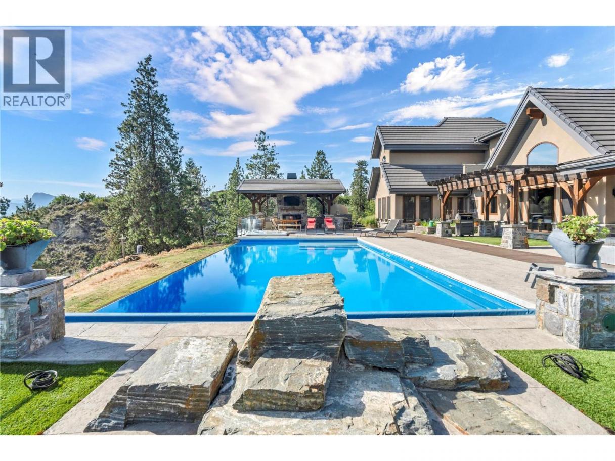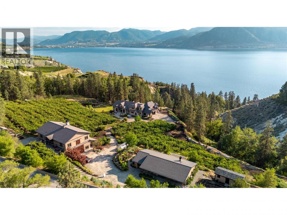 Imagine waking to breathtaking lake views from your master suite, then stepping onto your infinity pool deck surrounded by 4 acres of income-producing cherry trees. This isn't just a home—it's your private resort. Relax under cathedral ceilings in the great room where a stunning 2-story stone fireplace anchors gatherings, or retreat to your wine cellar for evening tastings. The chef's kitchen becomes your culinary playground with Wolf/Sub-Zero/Miele appliances and dual granite islands perfect for entertaining. Unwind in your spa-like master ensuite with rain shower and soaker tub, or host movie nights in your private theatre. Step outside to your gazebo with outdoor kitchen, pizza oven, and natural waterfall soundtrack. Your guests stay comfortably in the separate 2-bedroom residence while you enjoy ultimate privacy. With geothermal efficiency, solar power, greenhouse gardening, and underground irrigation maintaining your paradise, this Naramata gem offers the perfect blend of luxury living and agricultural income. Stop dreaming—start living your best life here. (id:6769)