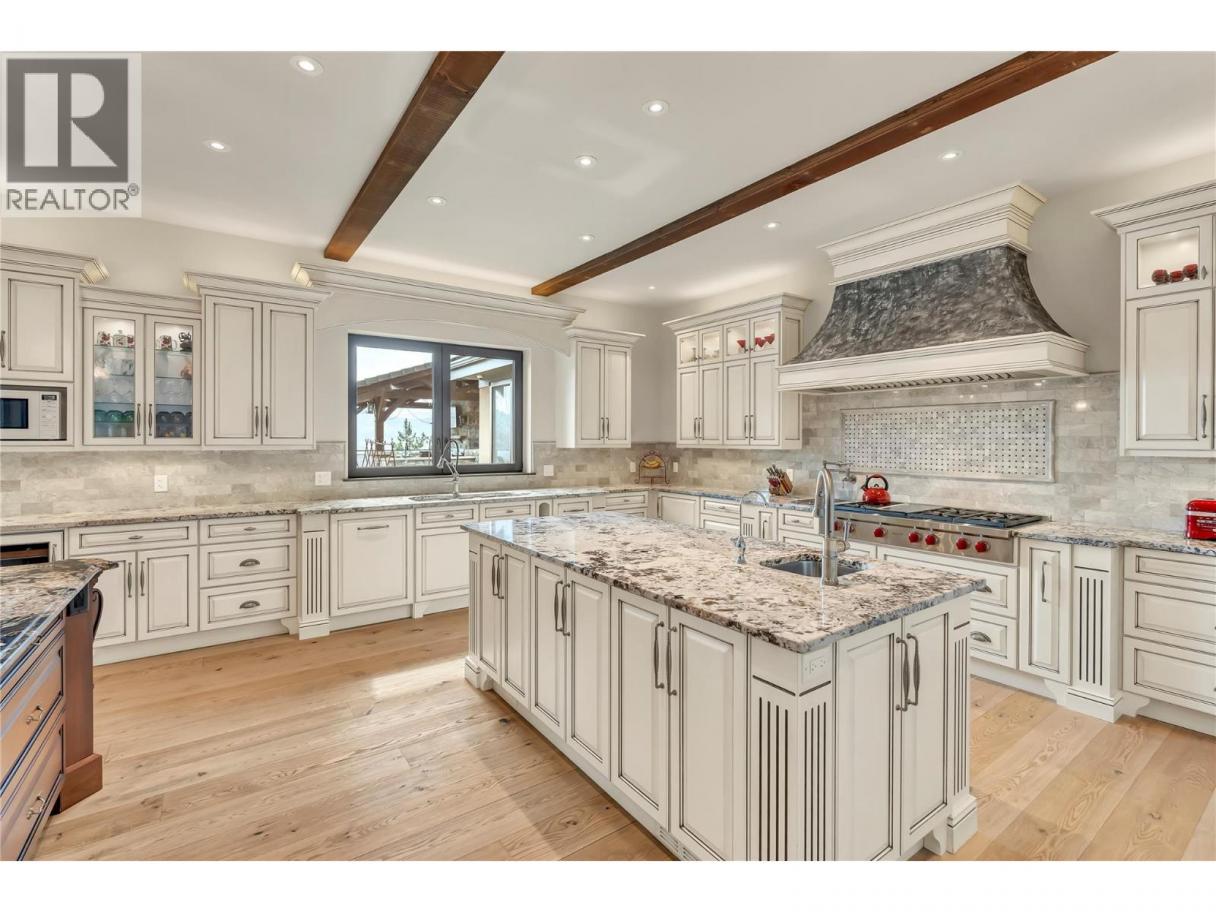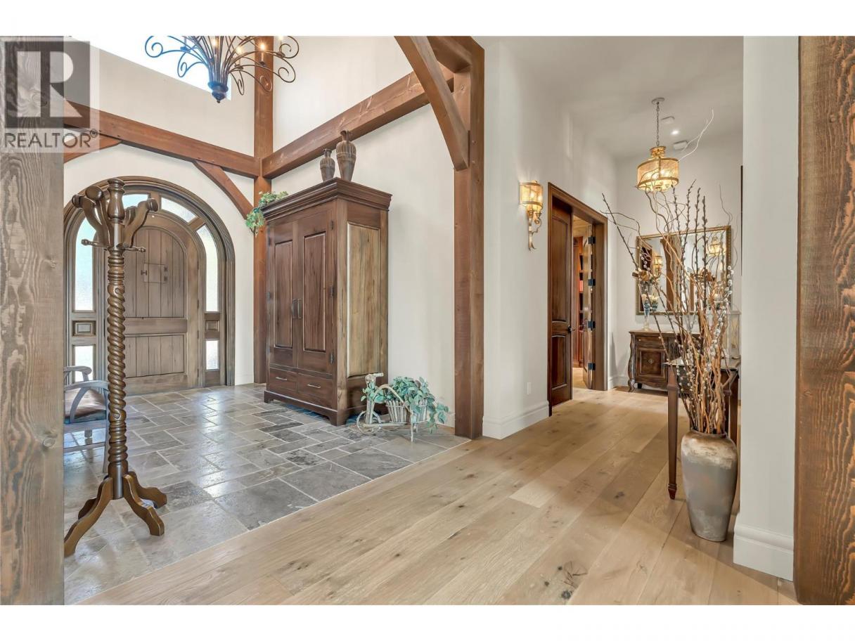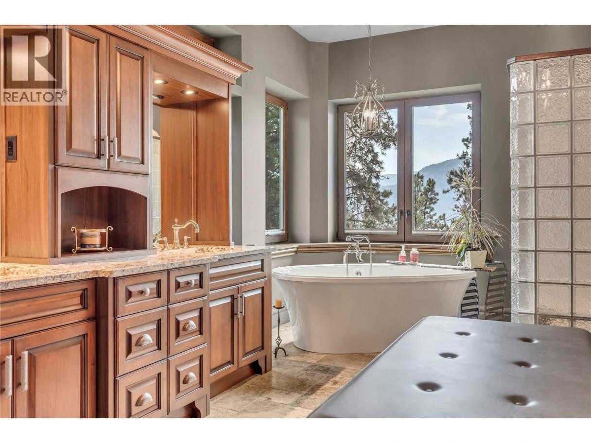 Imagine waking to breathtaking lake views from your master suite, then stepping onto your infinity pool deck surrounded by 4 acres of income-producing cherry trees. This isn't just a home—it's your private resort. Relax under cathedral ceilings in the great room where a stunning 2-story stone fireplace anchors gatherings, or retreat to your wine cellar for evening tastings. The chef's kitchen becomes your culinary playground with Wolf/Sub-Zero/Miele appliances and dual granite islands perfect for entertaining. Unwind in your spa-like master ensuite with rain shower and soaker tub, or host movie nights in your private theatre. Step outside to your gazebo with outdoor kitchen, pizza oven, and natural waterfall soundtrack. Your guests stay comfortably in the separate 2-bedroom residence while you enjoy ultimate privacy. With geothermal efficiency, solar power, greenhouse gardening, and underground irrigation maintaining your paradise, this Naramata gem offers the perfect blend of luxury living and agricultural income. Stop dreaming—start living your best life here. (id:6769)