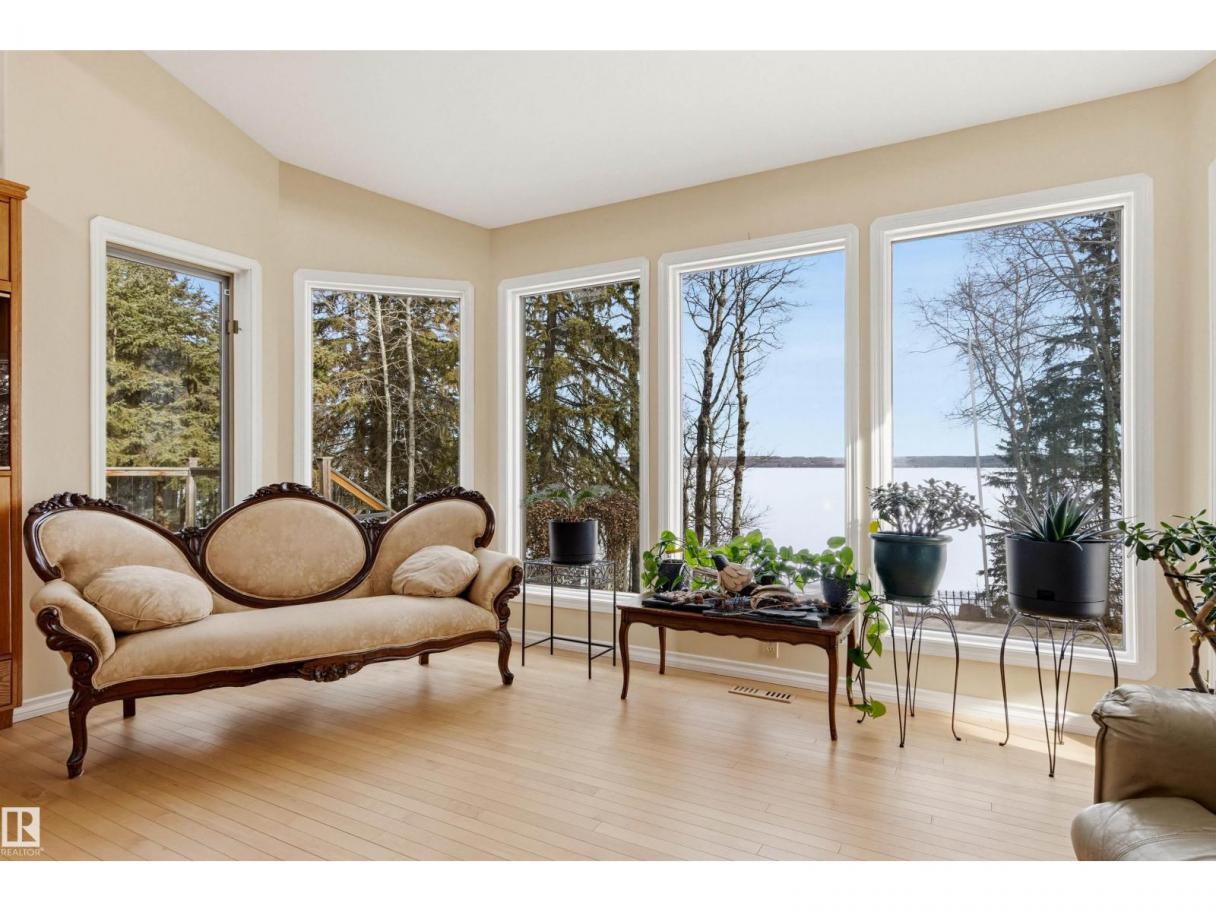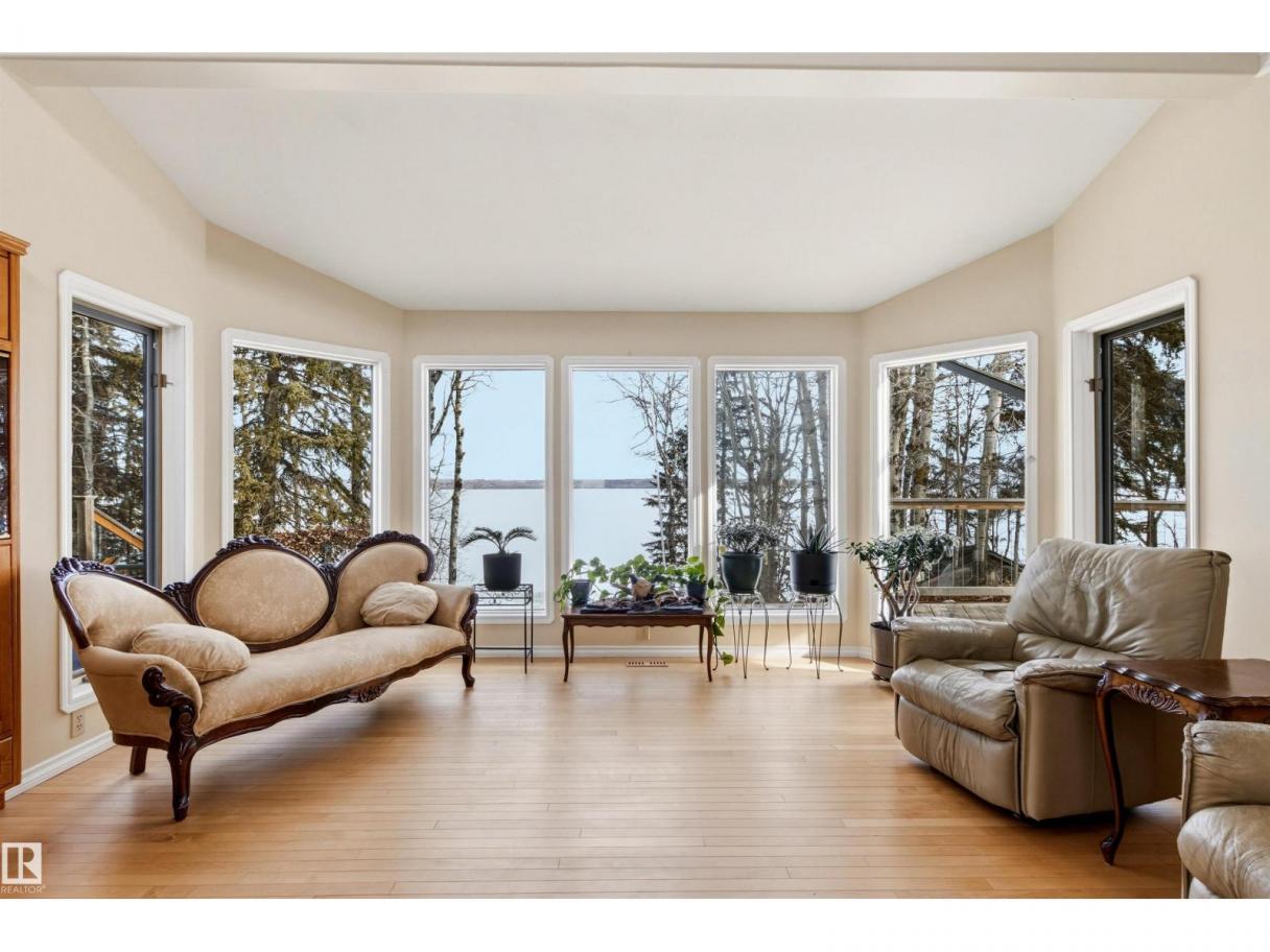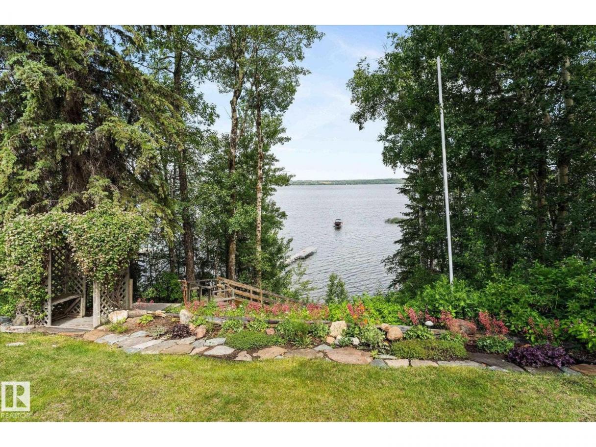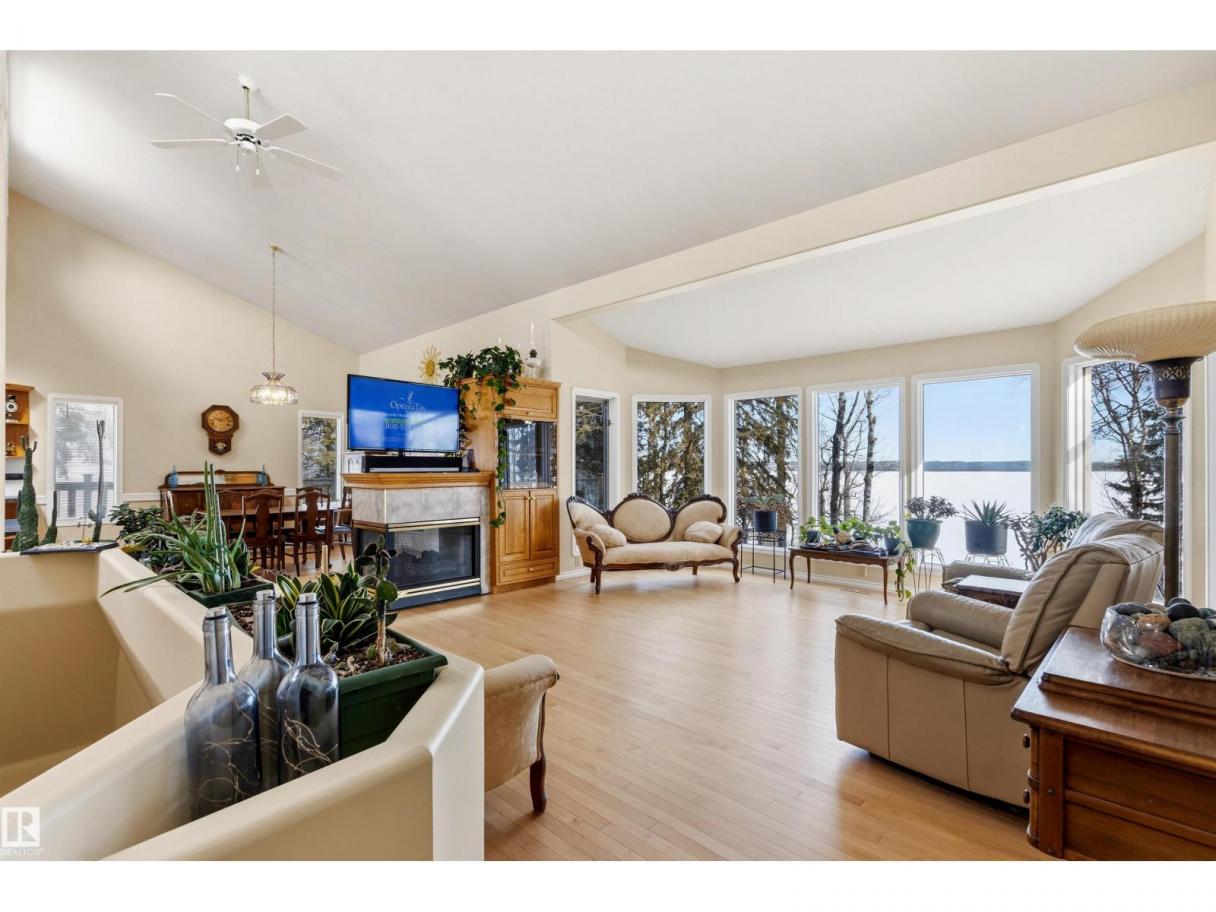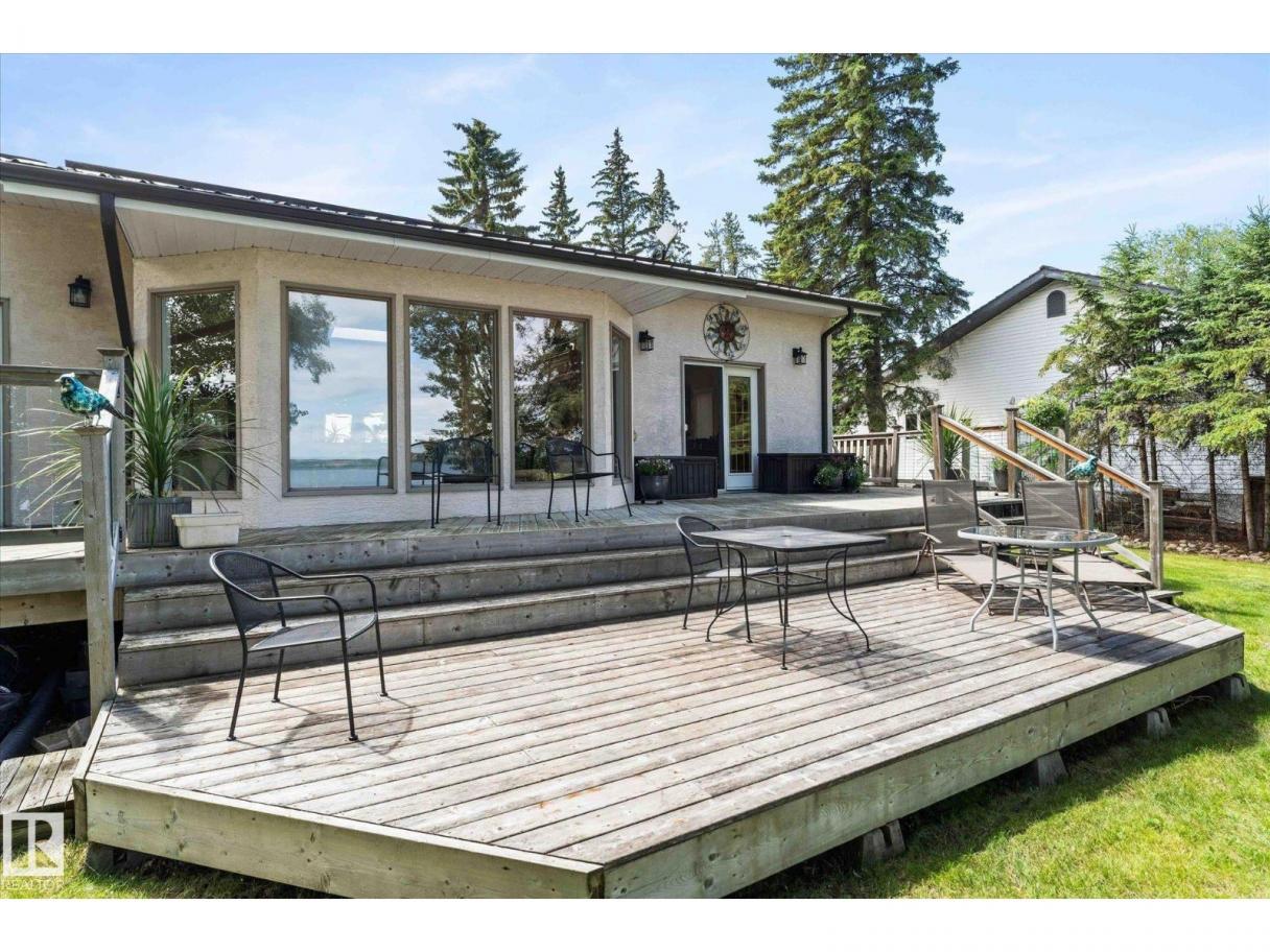 Nestled above the water in South Seba Beach and less than 1 hour from Edmonton, this stunning bungalow w/ over 2400 sq. ft. of total living space provides private lakefront living, peaceful enjoyment of lake views & bird watching. The interior features vaulted ceilings, a three-sided fireplace & maple hardwood floors throughout the spacious main level, which is flooded in natural light from skylights & plentiful windows. From the dining room, French doors open onto a glass-railed deck overlooking the perfect water backdrop. The main floor bdrm w/ its own French doors, offers deck access, lake views, a walk-in closet & a 4-pc ensuite. A main-level laundry area & 2nd bathroom add to everyday convenience. The fully finished basement w/ a roomy rec. area & 2 more bdrms provide space for family & friends. Exterior highlights include a wraparound deck, mature landscaping, perennial flower beds & private stairs to the shoreline. A dbl heated garage, metal roof & 3 storage sheds complete this exceptional offering (id:6769)