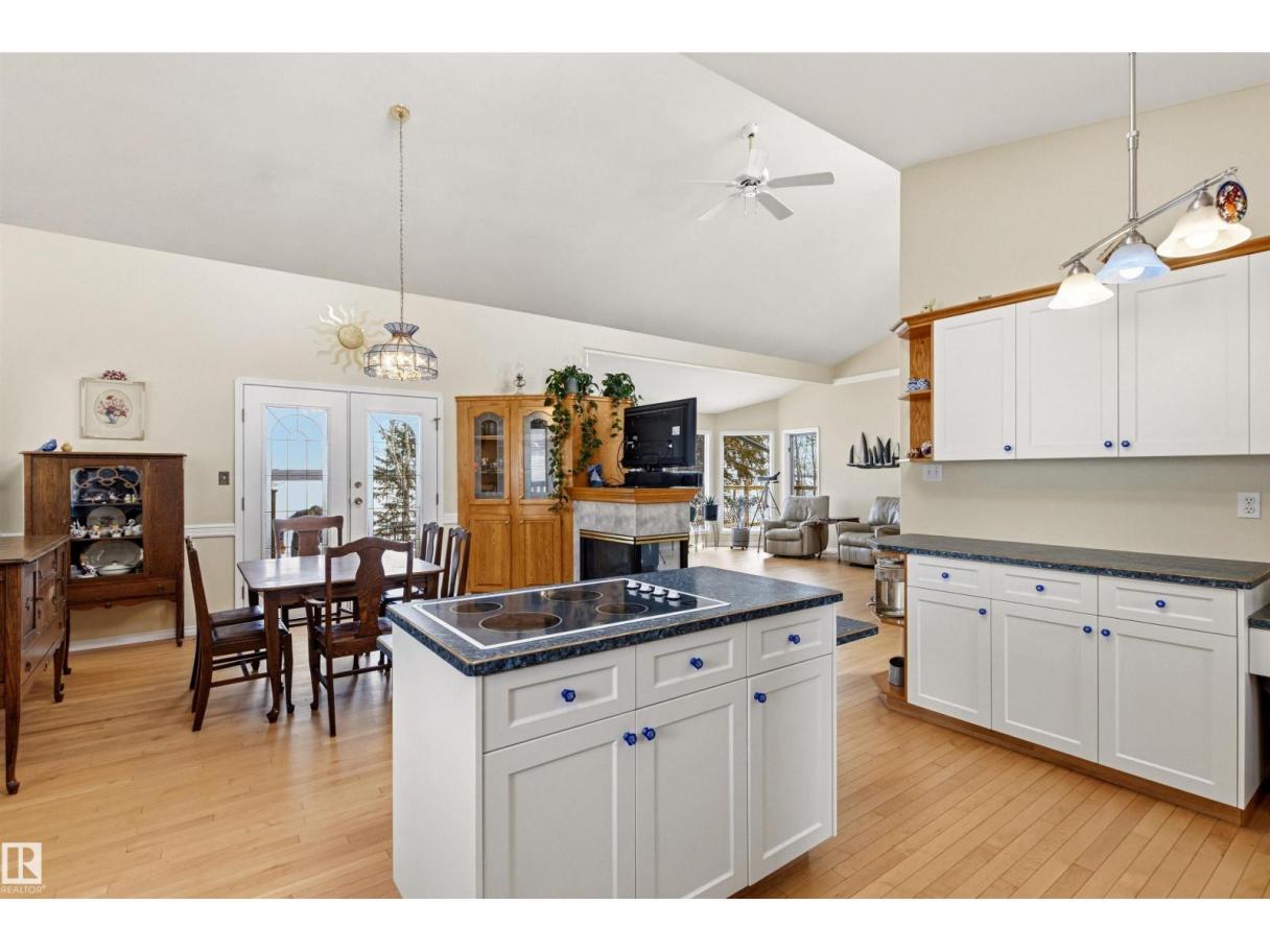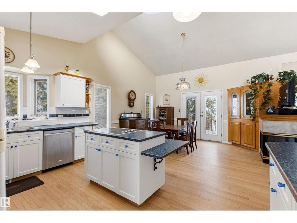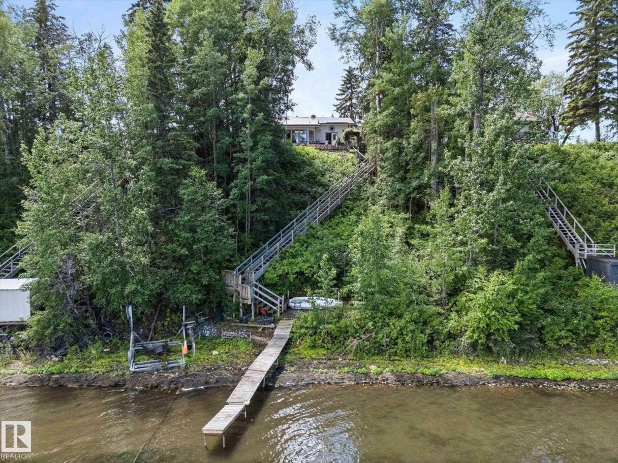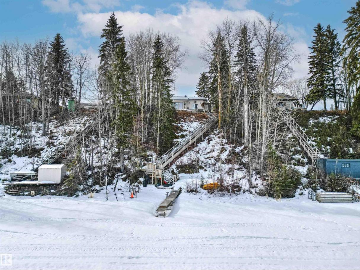 Nestled above the water in South Seba Beach and less than 1 hour from Edmonton, this stunning bungalow w/ over 2400 sq. ft. of total living space provides private lakefront living, peaceful enjoyment of lake views & bird watching. The interior features vaulted ceilings, a three-sided fireplace & maple hardwood floors throughout the spacious main level, which is flooded in natural light from skylights & plentiful windows. From the dining room, French doors open onto a glass-railed deck overlooking the perfect water backdrop. The main floor bdrm w/ its own French doors, offers deck access, lake views, a walk-in closet & a 4-pc ensuite. A main-level laundry area & 2nd bathroom add to everyday convenience. The fully finished basement w/ a roomy rec. area & 2 more bdrms provide space for family & friends. Exterior highlights include a wraparound deck, mature landscaping, perennial flower beds & private stairs to the shoreline. A dbl heated garage, metal roof & 3 storage sheds complete this exceptional offering (id:6769)