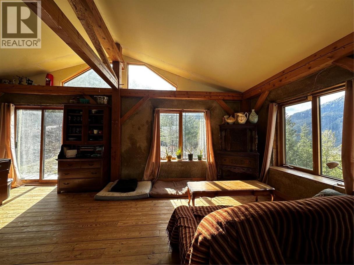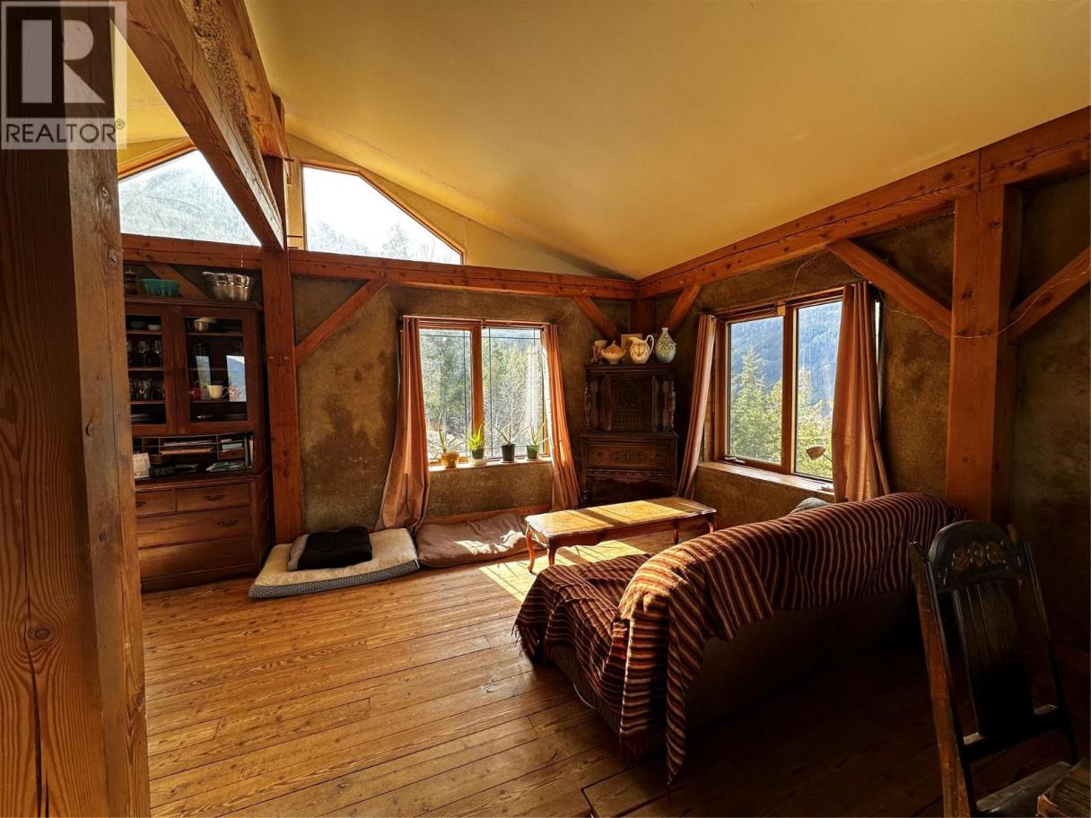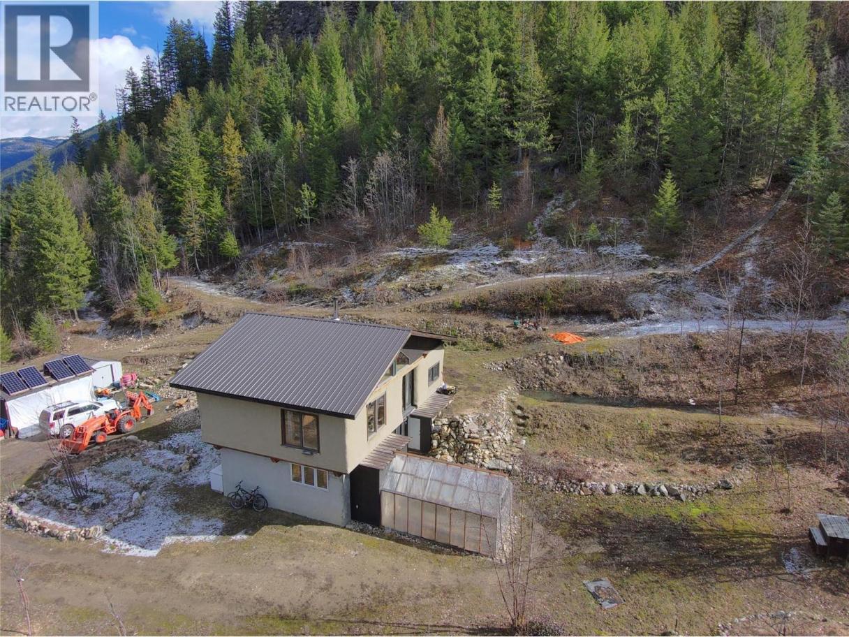A quarter share of 78.78 acres made affordable through a co-operative share structure. The title, covering only four exclusive lots, is owned by Slocan 4566 Co-operative Association (CP-0002012). Purchasing this share grants you exclusive use of Housing Site 4 and 1.5 acres of a cleared bench of land and buildings. This unique off-grid homestead built in 2007, offers a blend of rustic craftsmanship and modern sustainability on unzoned land with direct access to Crown land. The home is a two-story, open-concept house featuring straw-bale insulation, metal roofing, wood flooring, and granite countertops. It also features Italian marble tiles and a traditional fireplace. The home is fully self-sufficient with 4 solar panels, a spring-fed water system, a composting toilet, and on-demand propane hot water. Operating costs average just $500 per month, insurance included. The sun-exposed acreage features a greenhouse, chicken coop, and a variety of fruit trees and berries (apple, cherry, plum, grape, and more). A secondary 12' x 16' straw-bale cabin with a loft, wood stove, and wood flooring is included. There are one woodshed, two 16'x8' storage sheds, and a dedicated root cellar that houses the electrical battery bank. Despite its remote feel, internet is available. Very rare, move-in-ready opportunity for anyone seeking a self-sufficient lifestyle, a creative off-grid retreat, or a sustainable hobby farm with breathtaking panoramic views. Click on the ""Multimedia"" link below for the 3D tour. (id:6769)