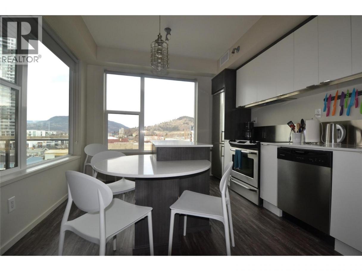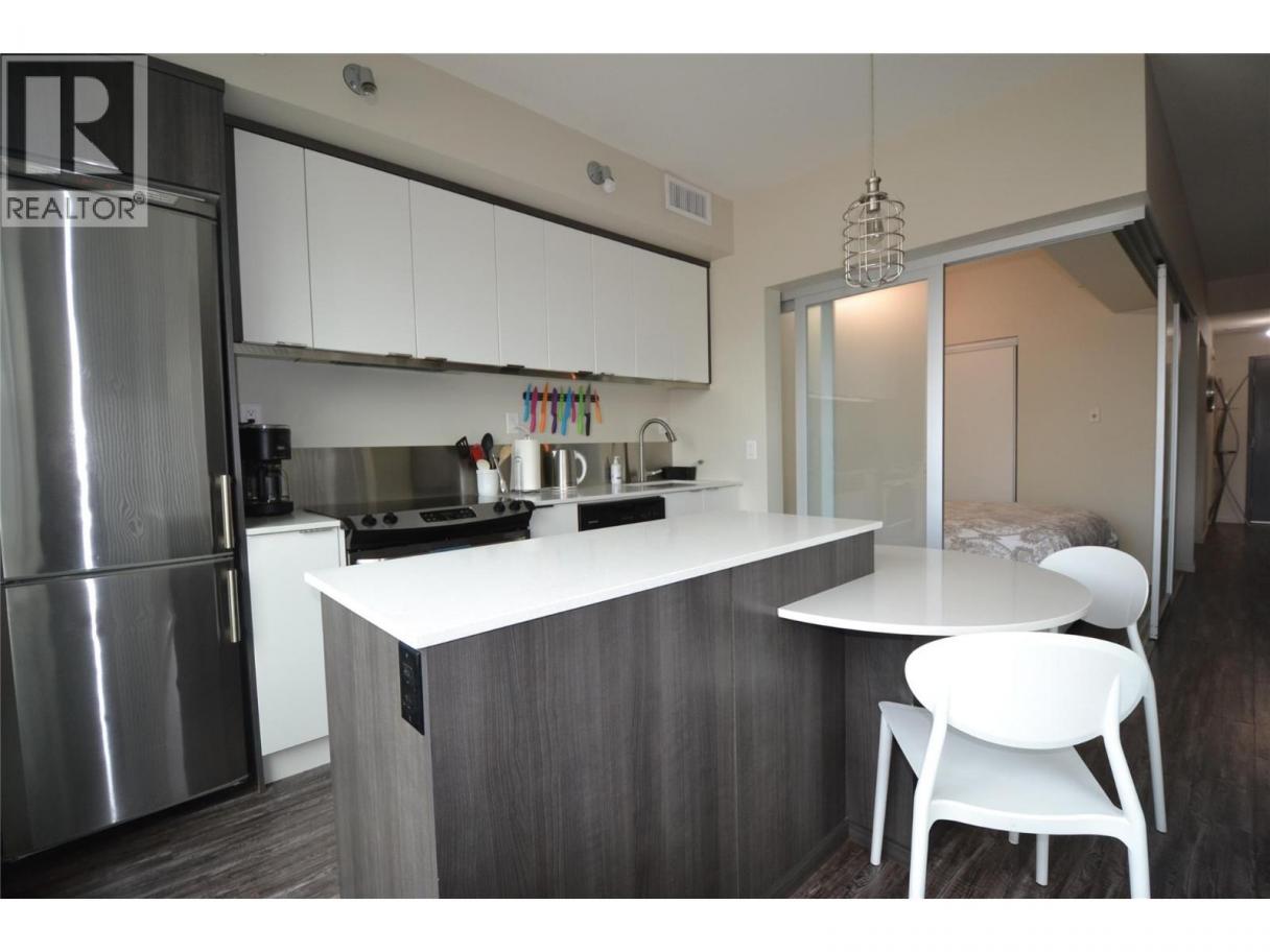 This amazing 5th floor condo is in the sought after Sole building in the heart of Kelowna's cultural district. This centrally located 1 bedroom and den/ 1 bath condo with views to Knox Mountain, has quartz counters, vinyl plank flooring, stainless appliances, washer, dryer and roller blinds. Smart spaces, edgy design and located within easy walking distance to the new UBCO downtown campus, library, pubs, restaurants, art walk and Prospera Place. The 6th floor offers great fitness facilities and a beautiful outdoor rooftop patio with a view to the lake and city; ideal for entertaining. Walk to all major amenities and the fabulous beaches of Okanagan Lake in minutes. Pet friendly building. Can be fully furnished or not. This building is zoned for short term rentals so can be rented (with a city license) if it is your primary residence, or when short term rentals are permitted again. The unit is set up for STR with locking cabinets so is perfect if you want to live in the unit and regularly travel! (id:6769)