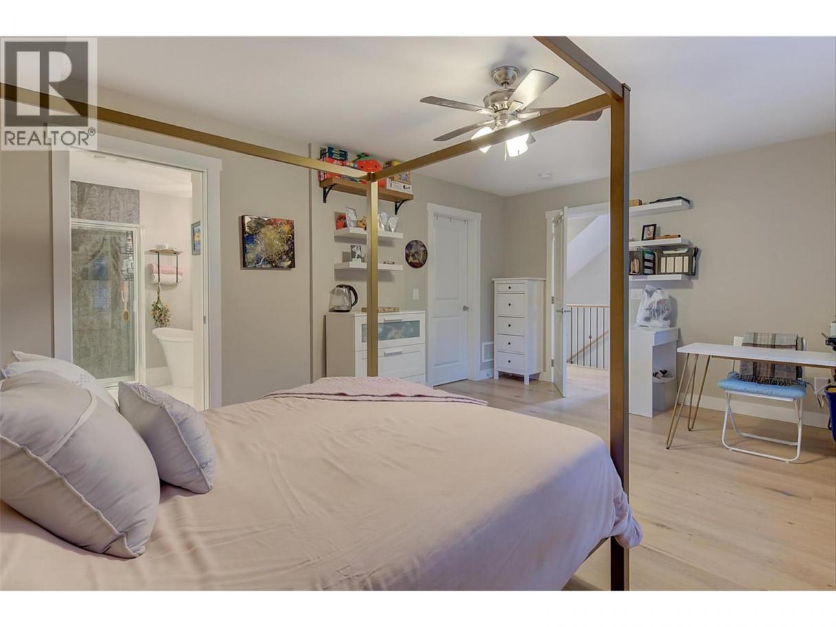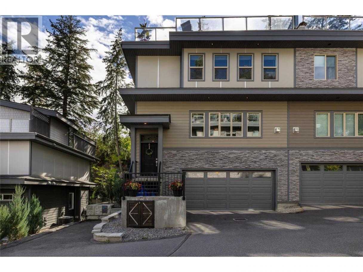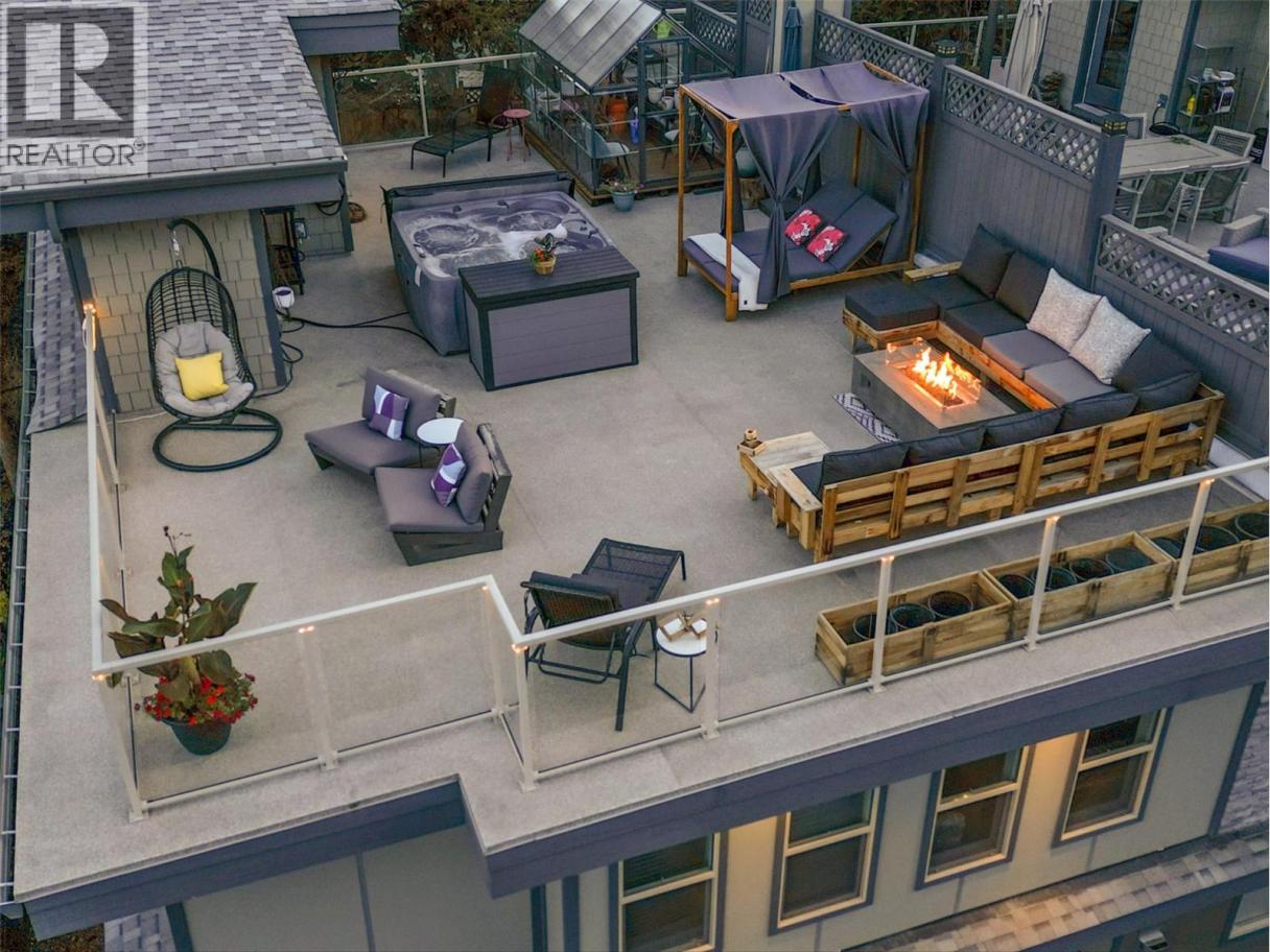 MASSIVE ROOFTOP PATIO, with unobstructed views of LAKE and MOUNTAINS. Rooftop HOT TUB and Rooftop GREENHOUSE included!! Personal gas-powered WINE BARREL SAUNA both dry or steam included! Outdoor shower for cold exposure after sauna session, personal spa experience at home! Upgrades include landscaping with built-in bench around fire pit and beautiful patio stone area. Unit has total of 4 beds & 4 baths! Only unit with NO CARPET, beautiful scratch-proof flooring. FINISHED WALK-OUT BASEMENT with PRIVATE ENTRANCE. HUGE bright kitchen with large island, modern quartz countertops, walk-in pantry, and beautiful cabinetry! OPEN CONCEPT living and dining room off kitchen with TWO fireplaces and high ceilings. Easily access BBQ, fire pit or sauna from quaint wrap around porch off kitchen to backyard. Oversized MASTER bedroom with WALK-IN closet, gorgeous ENSUITE BATHROOM with his and her sinks, private toilet room, and luxurious freestanding soaker tub! Backyard faces south, sun all day! Mature trees and lush vegetated hillside provide privacy, shade, and tranquility. Large 2 car GARAGE with built in cabinets and storage shelves. NO pet restrictions, dog pen, dog friendly community. Walking distance to Starbucks, yoga studio, Pub, Marina, Restaurants, local shops, etc. Easy access to paved bike and walking trail around Wood Lake with access to Okanagan Rail Trail, picnic area, beach, and off-leash dog park with beach, etc. (id:6769)