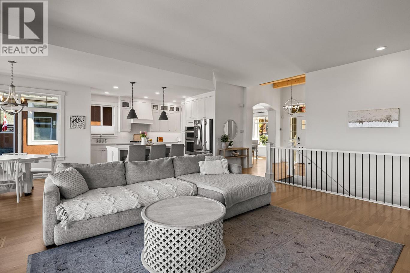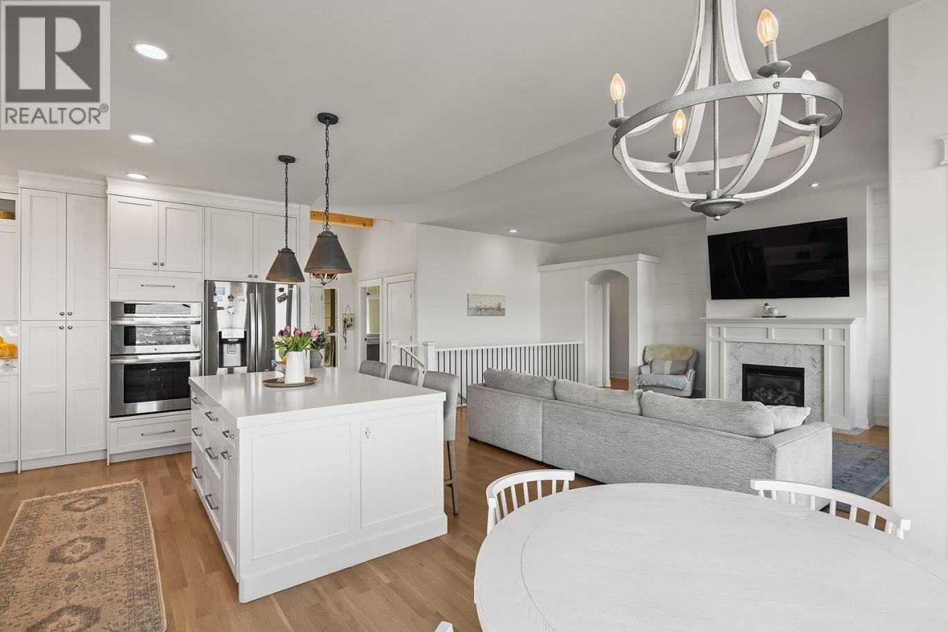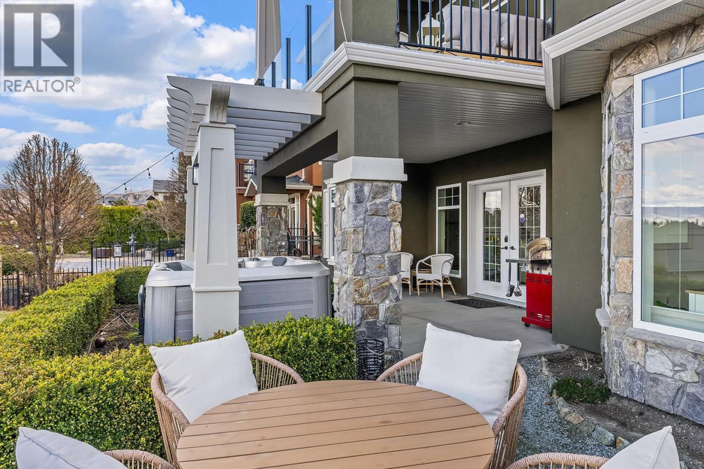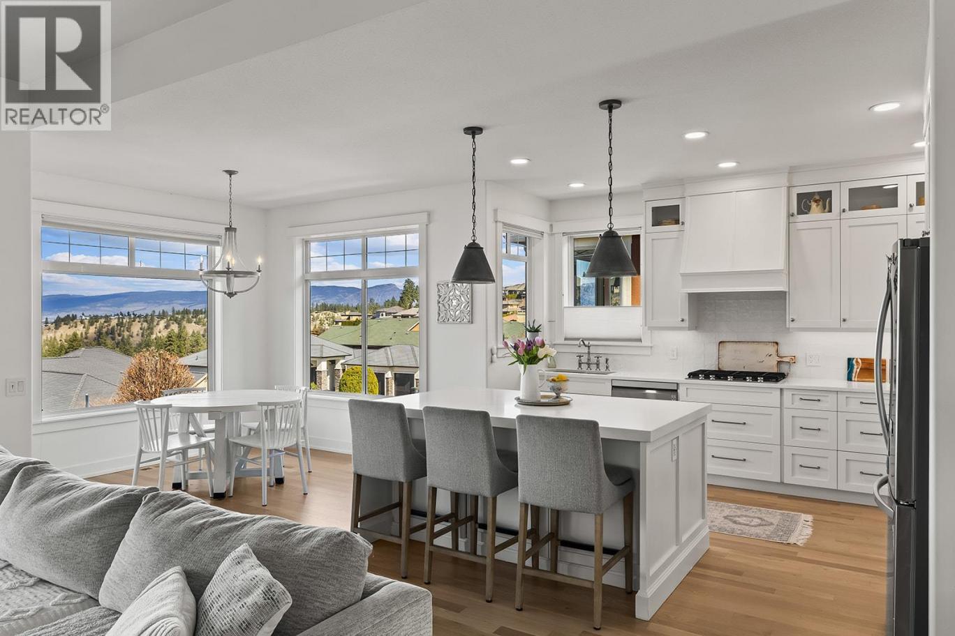 Stylish and inviting walk-out rancher in sought-after Upper Mission designed for the Okanagan lifestyle and panoramic lake views. Approximately 3,812 sq ft, this 5 bed, 4 bath home flows through bright open-concept living where hardwood floors and floor-to-ceiling windows frame sparkling water views. Gorgeous design details throughout including beams, arch entries, and wood slat wall features create a stylish modern farmhouse interior. The main level connects kitchen, breakfast, dining, and living spaces seamlessly, with a spacious primary suite featuring a walk-in closet and ensuite, a second bedroom, laundry, and a convenient powder room. The lower level expands the layout with additional bedrooms, a large rec area, great room, second kitchen, and a wine room, creating flexibility and privacy for guests or extended family. Step outside to a private setting with a hot tub, framed by hedges and rockwork, plus a double car garage and driveway with parking for four. Centrally located near Quarry Park, Canyon Falls Middle School, and Summerhill Winery in one of Upper Mission’s most desirable areas. (id:6769)