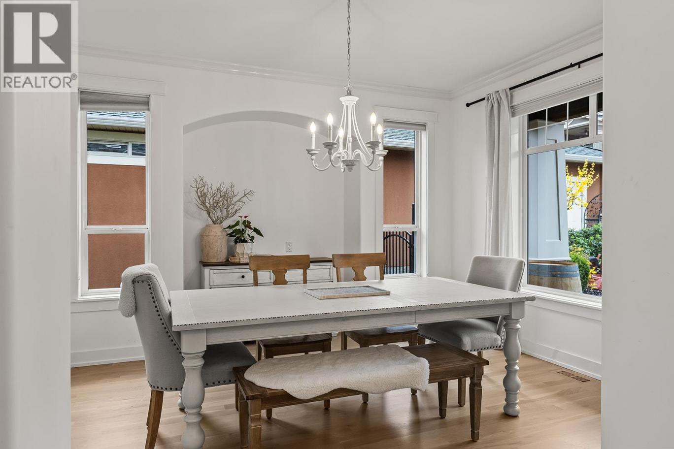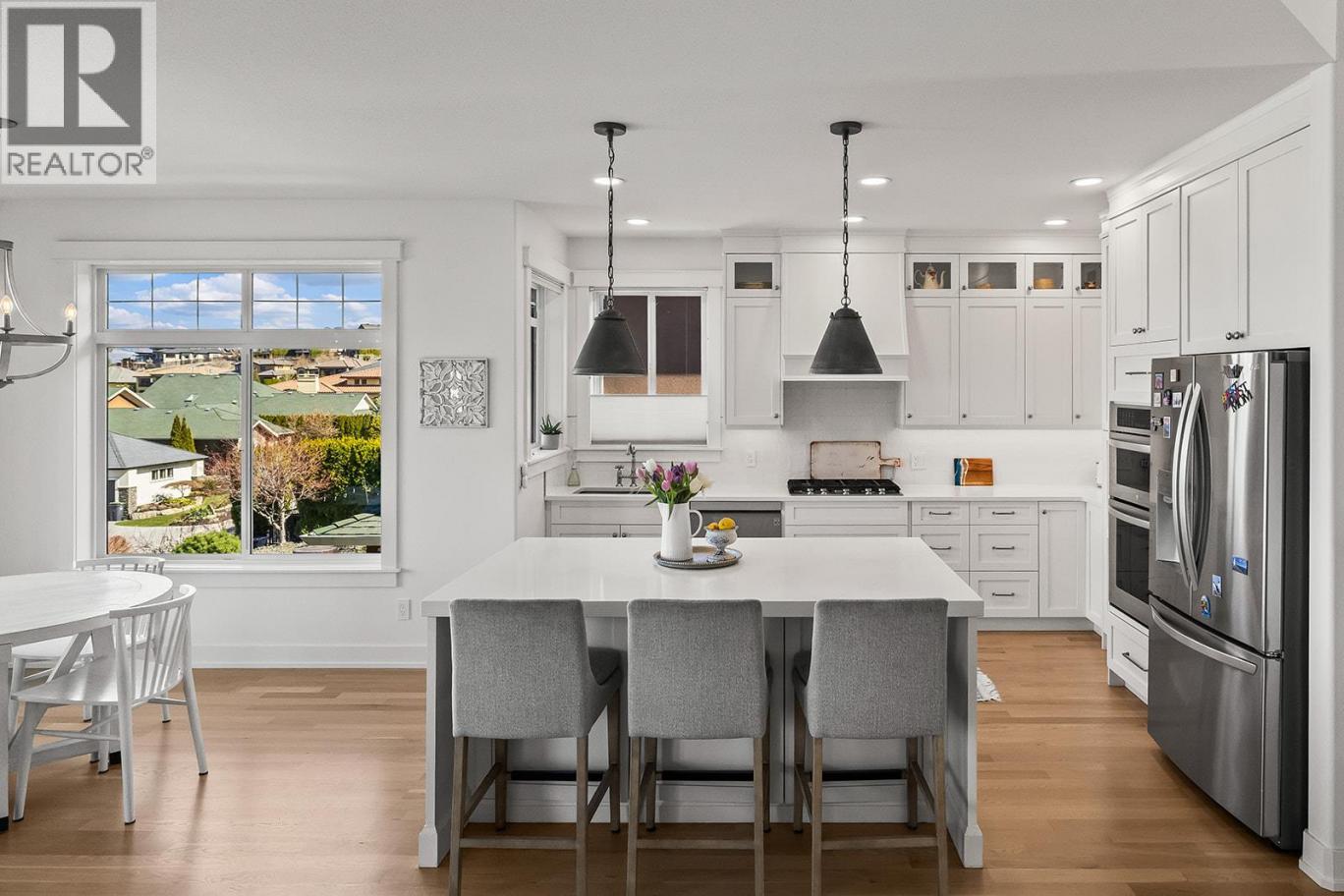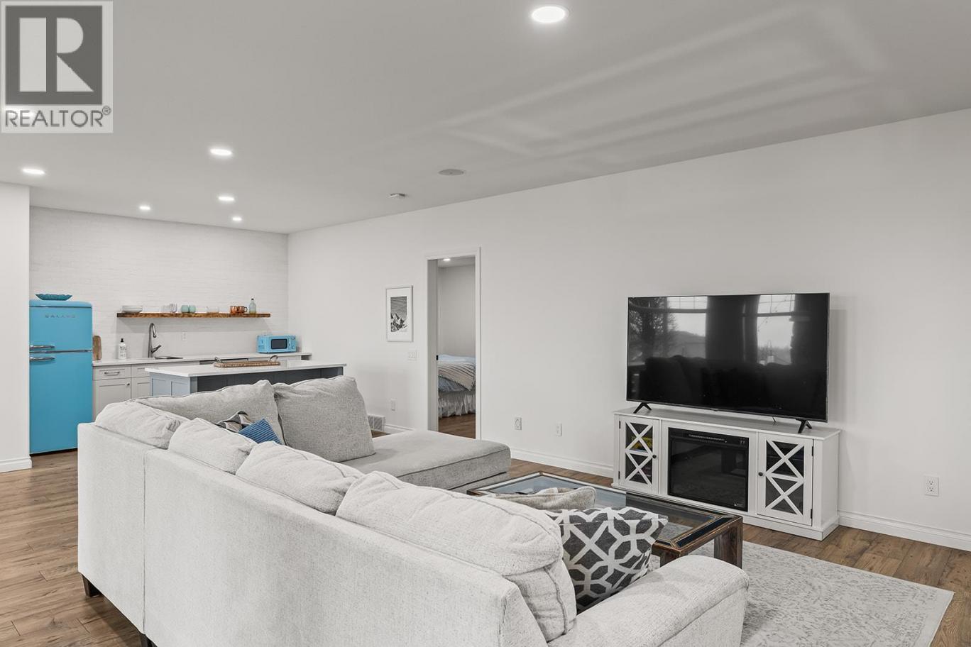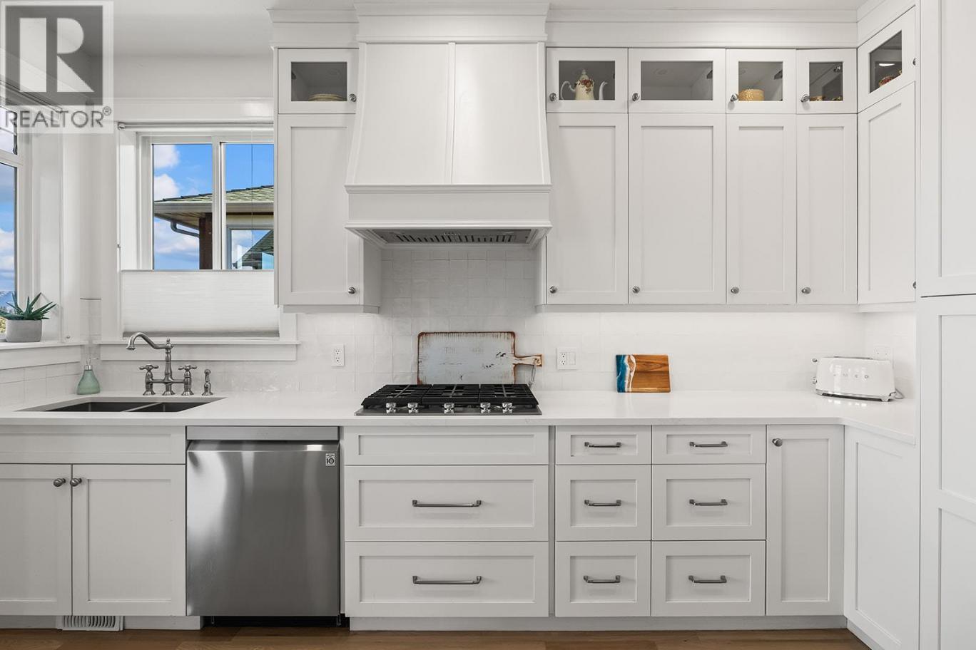 Stylish and inviting walk-out rancher in sought-after Upper Mission designed for the Okanagan lifestyle and panoramic lake views. Approximately 3,812 sq ft, this 5 bed, 4 bath home flows through bright open-concept living where hardwood floors and floor-to-ceiling windows frame sparkling water views. Gorgeous design details throughout including beams, arch entries, and wood slat wall features create a stylish modern farmhouse interior. The main level connects kitchen, breakfast, dining, and living spaces seamlessly, with a spacious primary suite featuring a walk-in closet and ensuite, a second bedroom, laundry, and a convenient powder room. The lower level expands the layout with additional bedrooms, a large rec area, great room, second kitchen, and a wine room, creating flexibility and privacy for guests or extended family. Step outside to a private setting with a hot tub, framed by hedges and rockwork, plus a double car garage and driveway with parking for four. Centrally located near Quarry Park, Canyon Falls Middle School, and Summerhill Winery in one of Upper Mission’s most desirable areas. (id:6769)