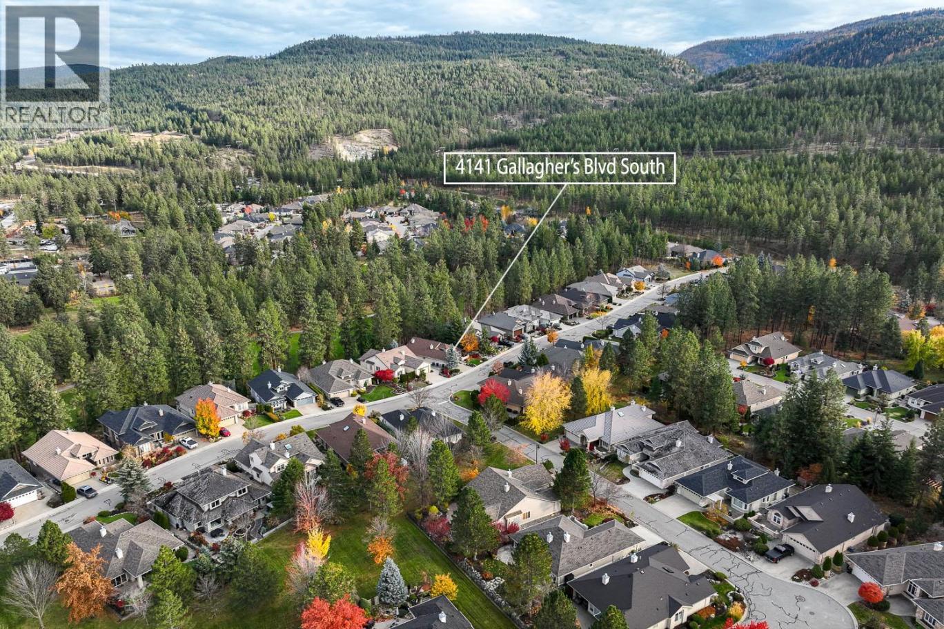 Welcome to 4141 Gallaghers Blvd S! This beautifully maintained 4 Bed + Den walk-out rancher offers both comfort and lifestyle in Kelowna's exclusive Gallaghers Canyon community. Enjoy the open living plan with luxurious 3-sided gas fireplace and crisp white kitchen with Bosch wall oven. King-sized primary suite features access to the upper deck, walk-in closet and spa-like ensuite bathroom with dual sink vanity, walk in shower and soaker tub! This level includes in-law suite potential with over 1,400 sq. ft. of living space, two bedrooms, a bathroom, a wet bar, a 2-sided gas fireplace, and radiant in-floor heating. Thoughtfully designed with plenty of built-in storage and multiple options for enjoying the beautiful Okanagan weather in your courtyard or overlooking the 14th fairway in the back. Gallagher's Canyon offers prized Golfing, Social Events, Pool, Fitness Center, Tennis, Arts and Crafts, and much more! Gallaghers is the Ultimate Okanagan Lifestyle community. (id:6769)