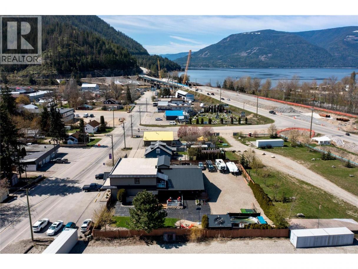Fantastic and Rare Opportunity in Sicamous. Centrally located property that seamlessly blends commercial with comfortable residential living. Situated on a large private 0.54-acre lot, this versatile property generates over $3000 per month in rental income, allowing you to enjoy the expansive space. The main home offers approximately 1,891 sq.ft. of beautifully maintained living space, featuring 4 bedrooms and 4 bathrooms. Step out from the kitchen onto the balcony and soak in the stunning views and the surrounding mountains. A large fourth bedroom, full bath, and laundry on the lower level provide a perfect retreat for guests or extended family. Numerous upgrades have been completed, including a recently installed handicap ramp, updated electrical panels, plumbing, and updated bathroom with shower and laundry. There’s also 1,600 sq.ft. of shop/storage space and a 12 x 56' carport, plus an additional unfinished basement—ideal for future development or added storage. Outdoor living is truly exceptional here, with over 600 sq.ft. of mostly covered patio space, a full outdoor kitchen complete with BBQ, fireplace, dining area, TV, covered cabana with hot tub, bar, above-ground pool—perfect for enjoying warm summer days in the Shuswap. Need room for RVs, boats, or trailers? No problem. This yard has been thoughtfully designed to accommodate all your toys. The scale and pride of ownership can be seen throughout this property. Most furnishings included. Link to Video and 3D Tour. (id:6769)