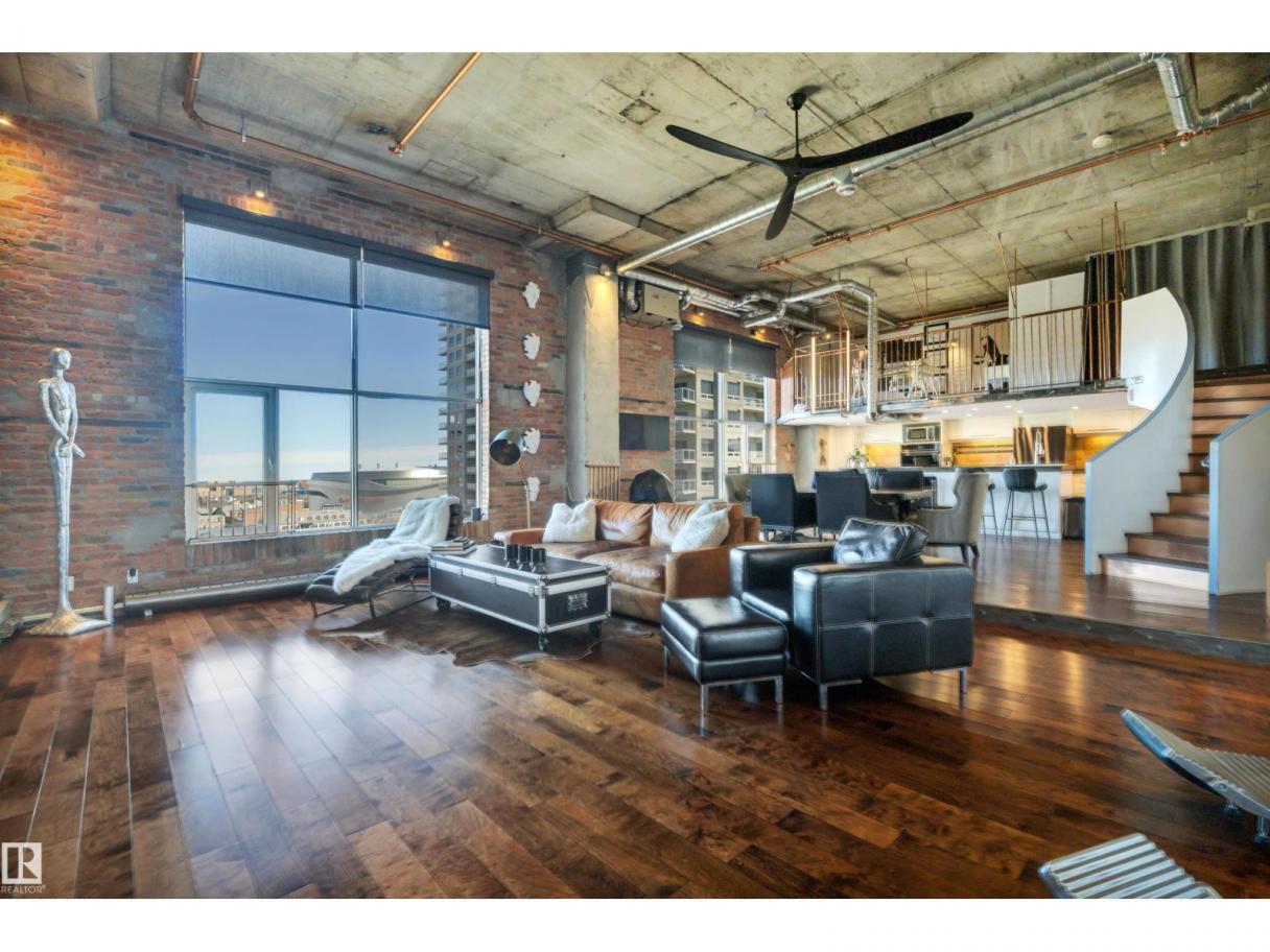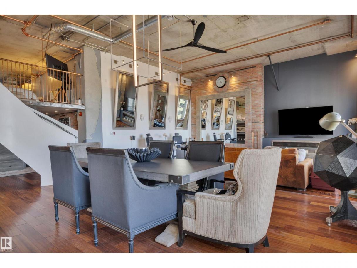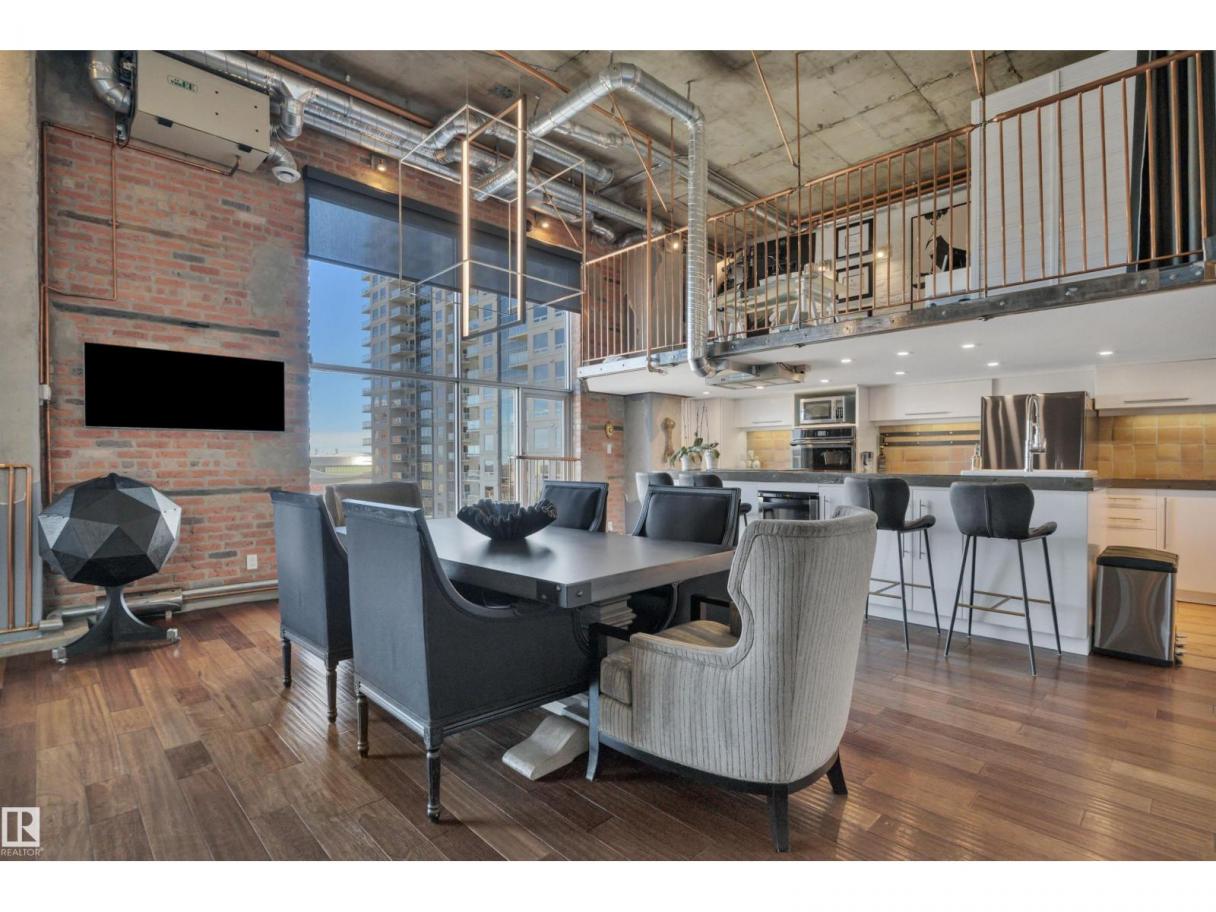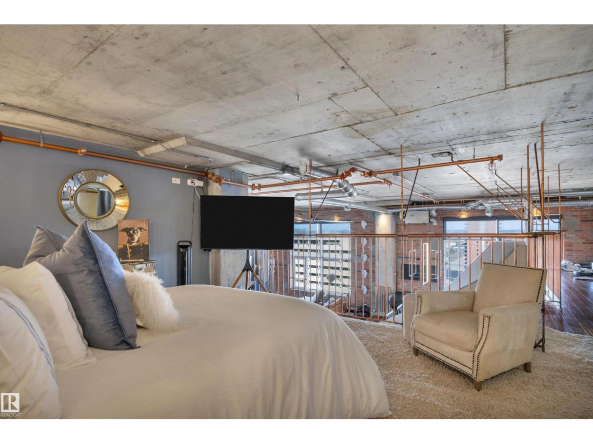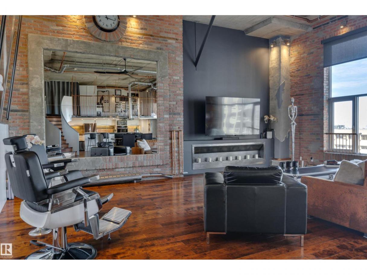 You won’t believe the WOW FACTOR in this NY-style urban penthouse loft in Edmonton’s trendy Downtown Warehouse District. One of only four penthouses, this stunning home offers over 2,000 sq ft of open-concept living with soaring 13’ ceilings, floor-to-ceiling windows, and striking mirrored accents. The main level features a spacious living area with exposed brick and concrete, a dining space, dream kitchen, den, 4-piece bath, and a laundry room with storage. A dramatic curved copper staircase leads to the mezzanine, complete with two generous bedrooms, a 5-piece ensuite, and a two-person sauna. Recent upgrades include Hunter Douglas remote-controlled blinds, statement lighting, new stove, washer & dryer. This 2 bed, 2 bath unit includes three underground parking stalls (1 single, 1 tandem) and a storage unit. Steps to the Ice District, restaurants, cafes, shopping, dog park, transit, and Grant MacEwan University. (id:6769)