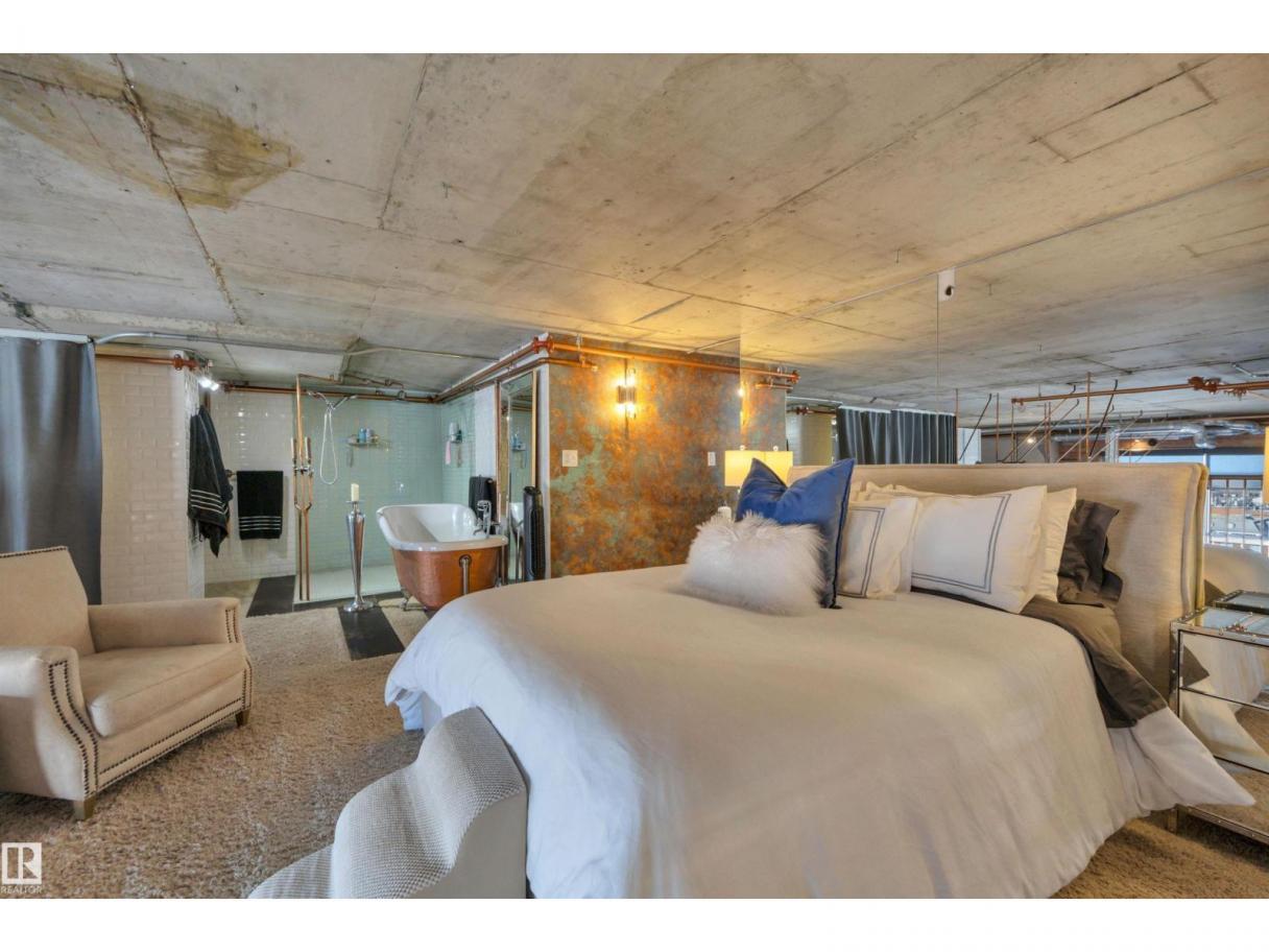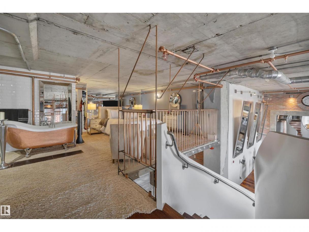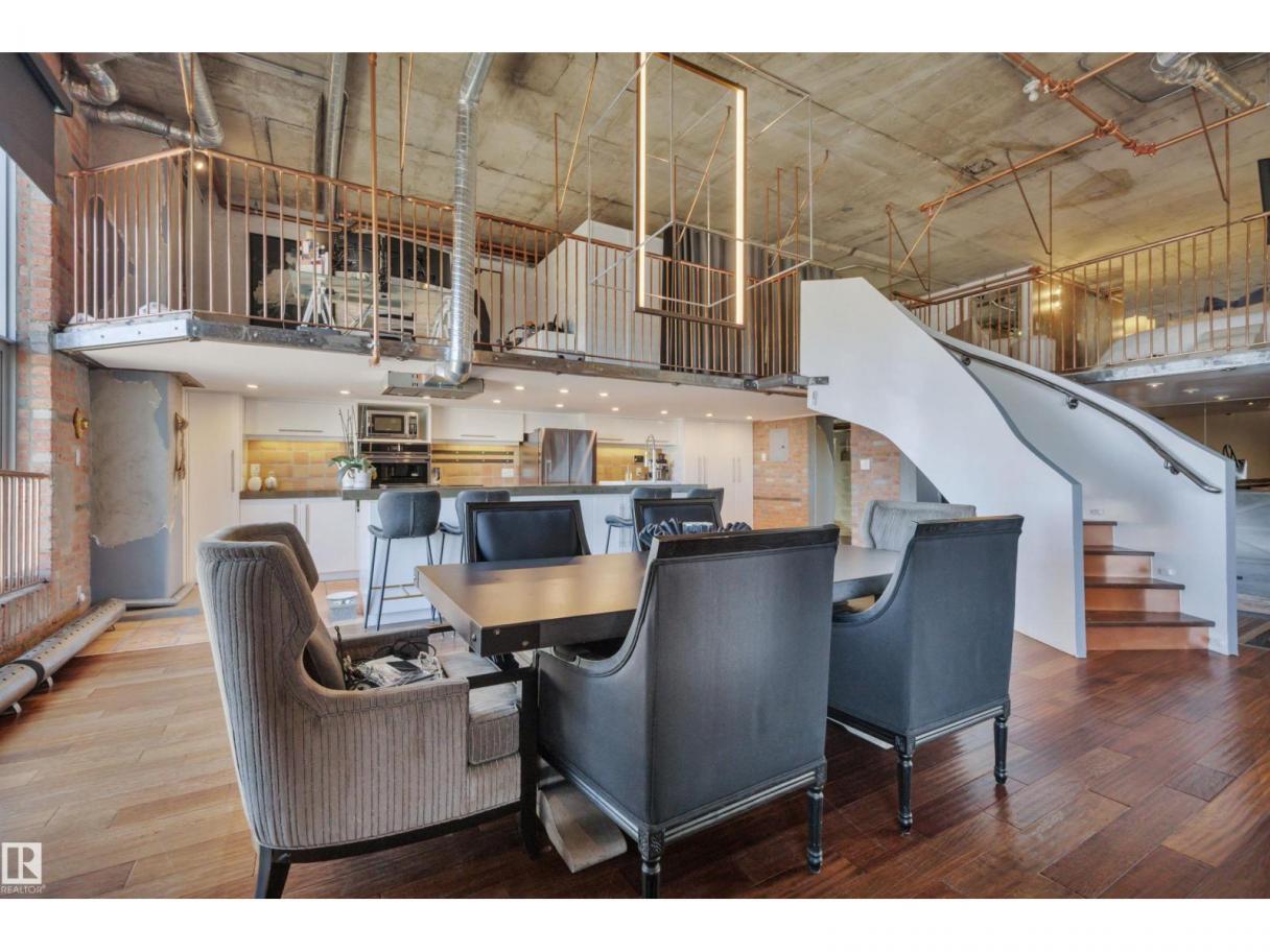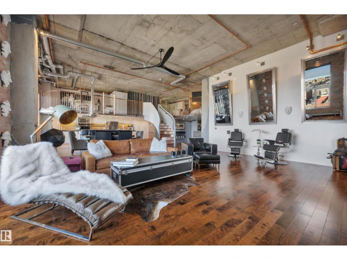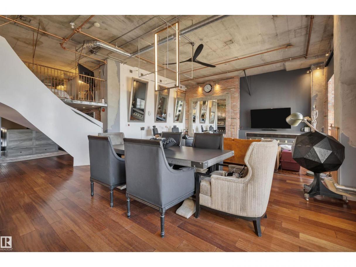 You won’t believe the WOW FACTOR in this NY-style urban penthouse loft in Edmonton’s trendy Downtown Warehouse District. One of only four penthouses, this stunning home offers over 2,000 sq ft of open-concept living with soaring 13’ ceilings, floor-to-ceiling windows, and striking mirrored accents. The main level features a spacious living area with exposed brick and concrete, a dining space, dream kitchen, den, 4-piece bath, and a laundry room with storage. A dramatic curved copper staircase leads to the mezzanine, complete with two generous bedrooms, a 5-piece ensuite, and a two-person sauna. Recent upgrades include Hunter Douglas remote-controlled blinds, statement lighting, new stove, washer & dryer. This 2 bed, 2 bath unit includes three underground parking stalls (1 single, 1 tandem) and a storage unit. Steps to the Ice District, restaurants, cafes, shopping, dog park, transit, and Grant MacEwan University. (id:6769)
