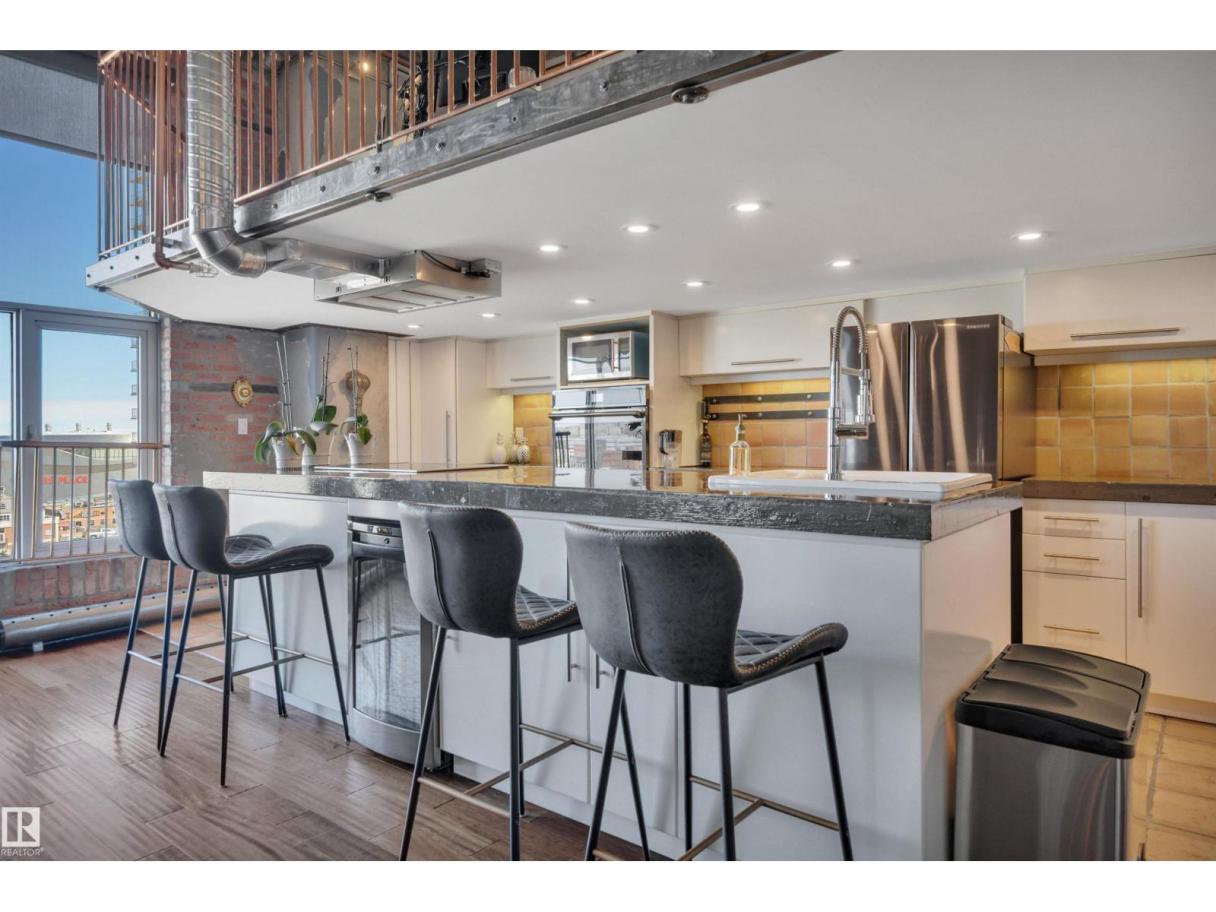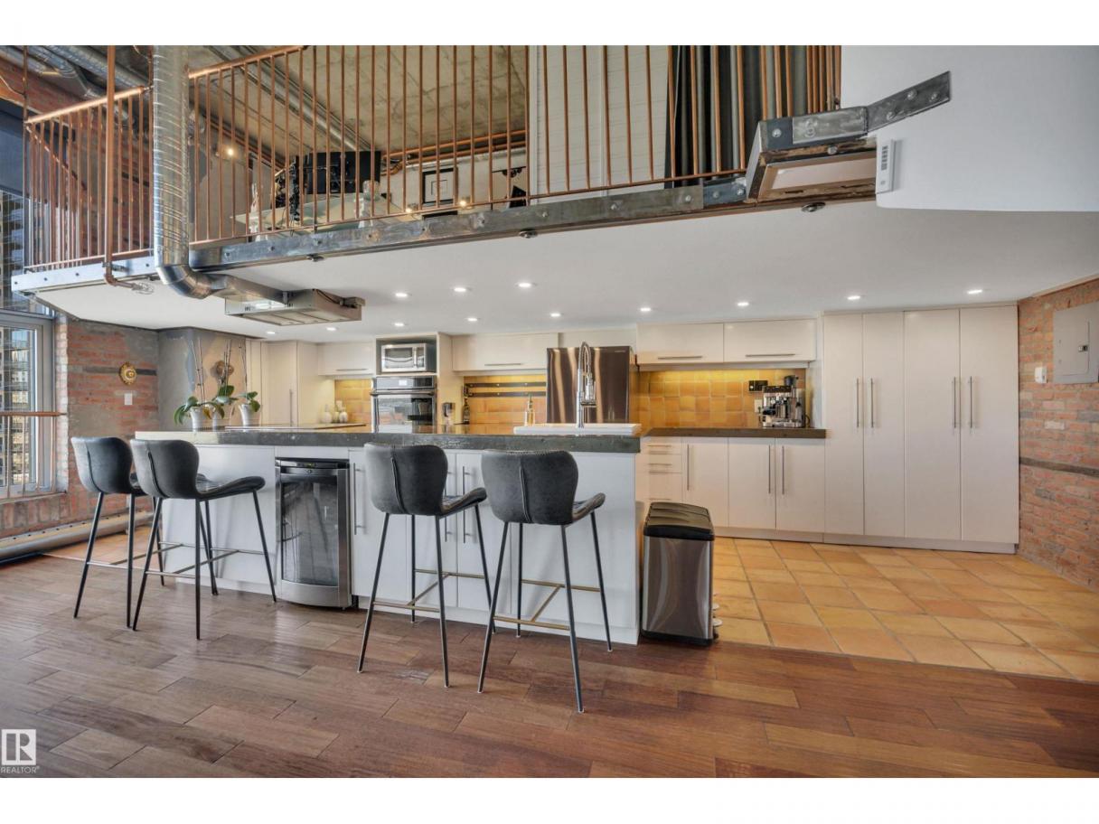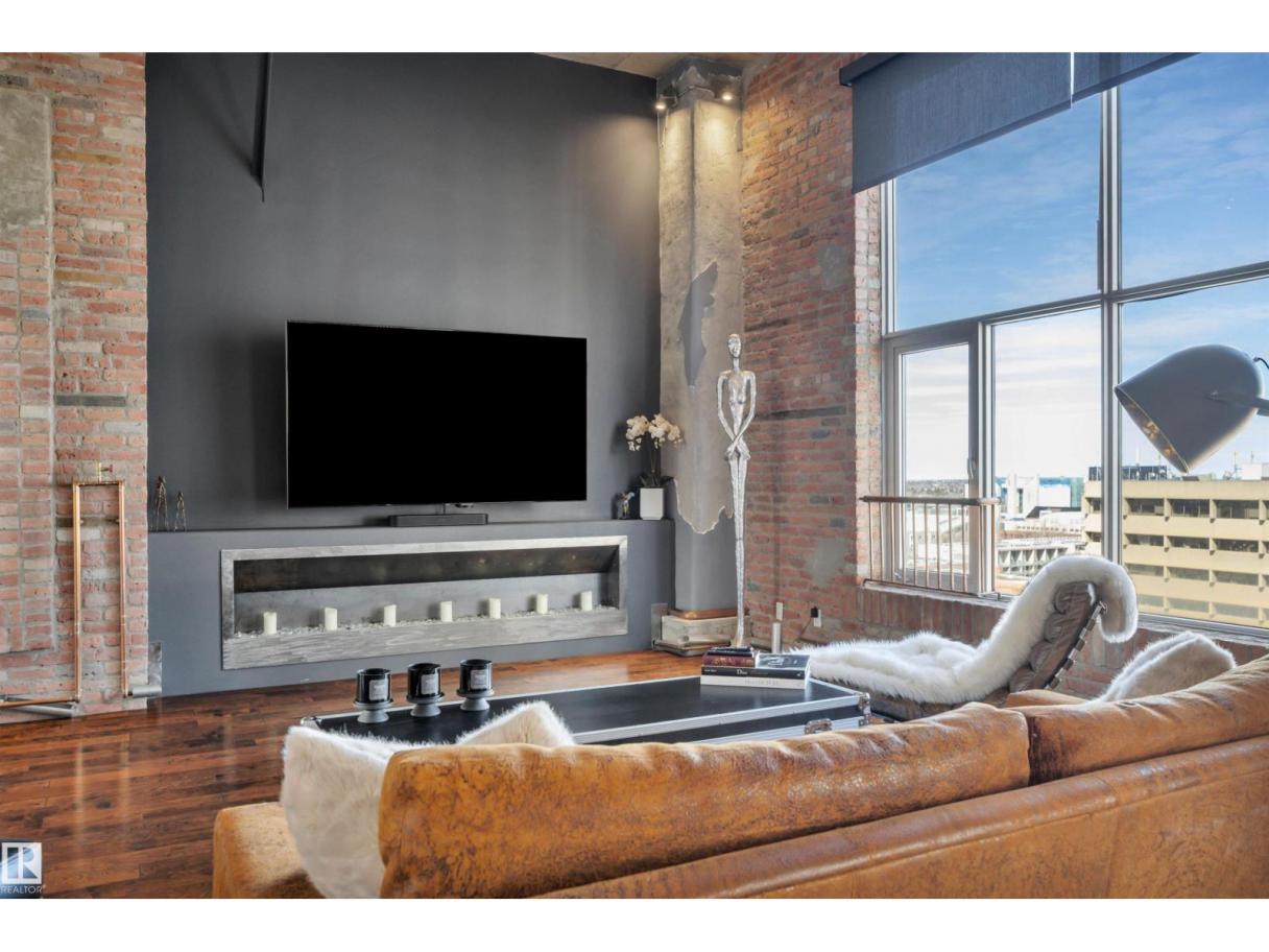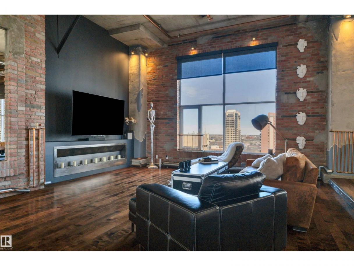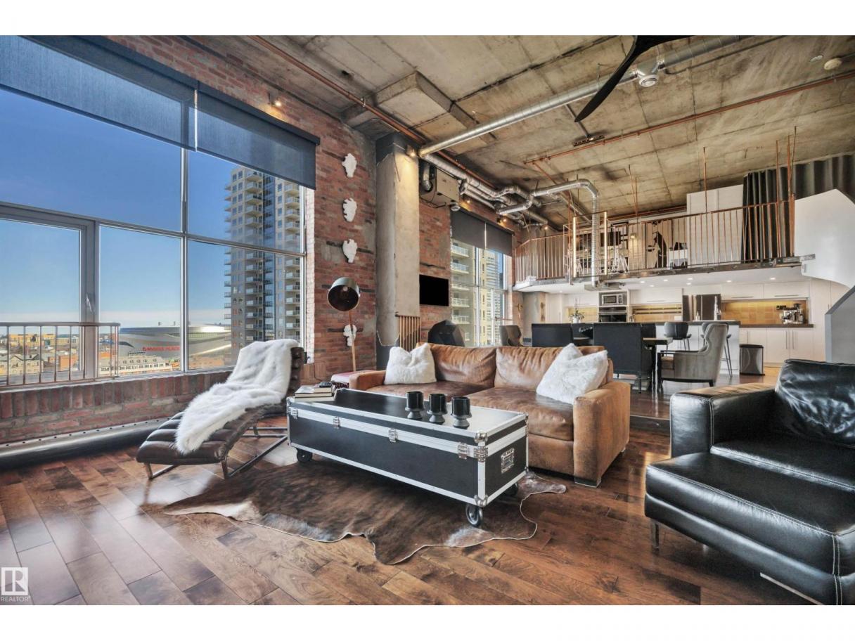 You won’t believe the WOW FACTOR in this NY-style urban penthouse loft in Edmonton’s trendy Downtown Warehouse District. One of only four penthouses, this stunning home offers over 2,000 sq ft of open-concept living with soaring 13’ ceilings, floor-to-ceiling windows, and striking mirrored accents. The main level features a spacious living area with exposed brick and concrete, a dining space, dream kitchen, den, 4-piece bath, and a laundry room with storage. A dramatic curved copper staircase leads to the mezzanine, complete with two generous bedrooms, a 5-piece ensuite, and a two-person sauna. Recent upgrades include Hunter Douglas remote-controlled blinds, statement lighting, new stove, washer & dryer. This 2 bed, 2 bath unit includes three underground parking stalls (1 single, 1 tandem) and a storage unit. Steps to the Ice District, restaurants, cafes, shopping, dog park, transit, and Grant MacEwan University. (id:6769)